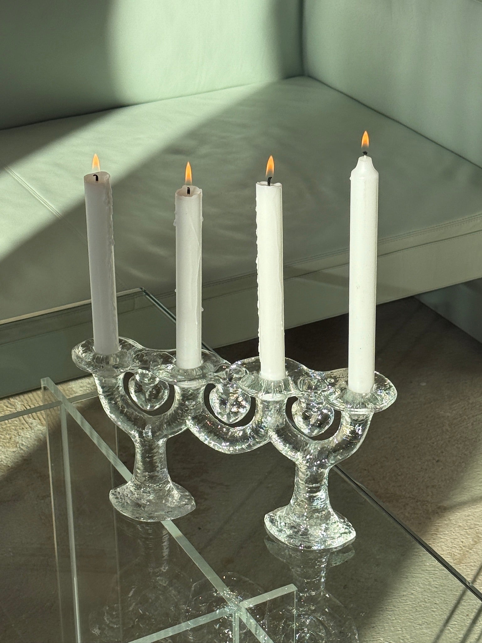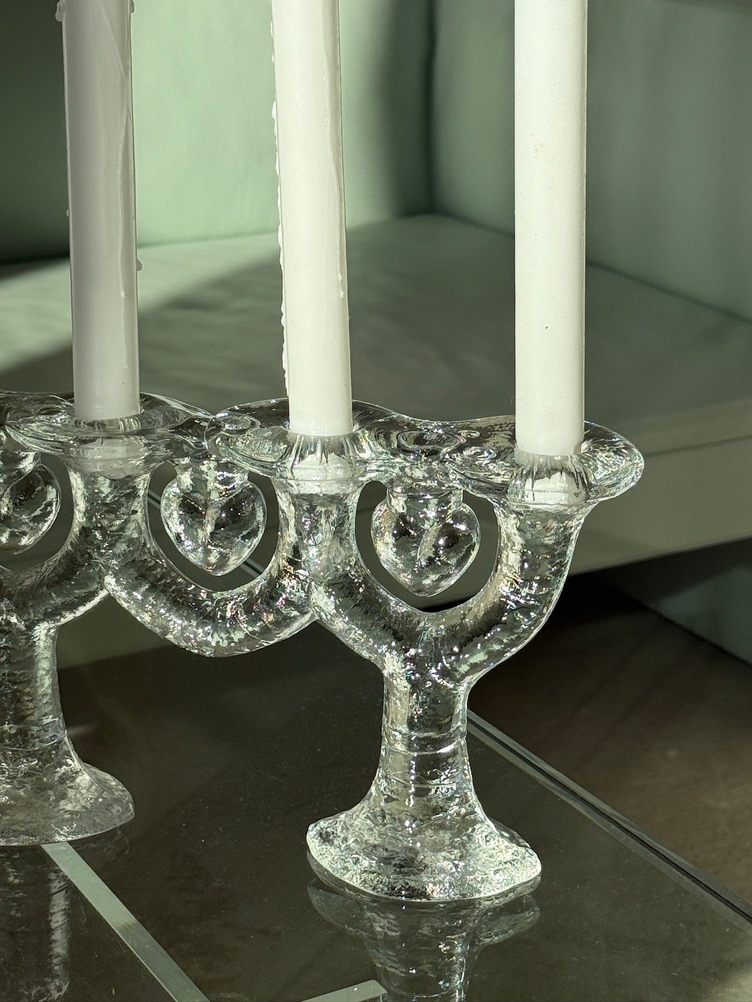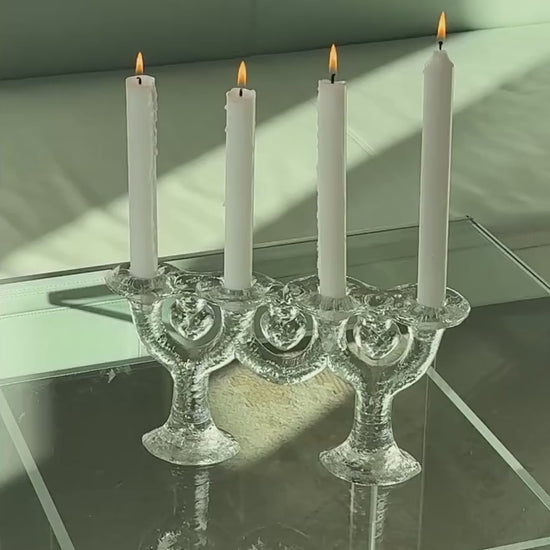 Smuk og karakterfuld adventsstage fra svenske Pukeberg. Fremstillet i tungt, klart glas med den klassiske isstruktur, som fanger lyset smukt og giver et levende spil i overfladen. Designet har en skulpturel form og med tre smukke hjerter – perfekt til adventslys, men også dekorativ hele året med hvide eller farvede stagelys.