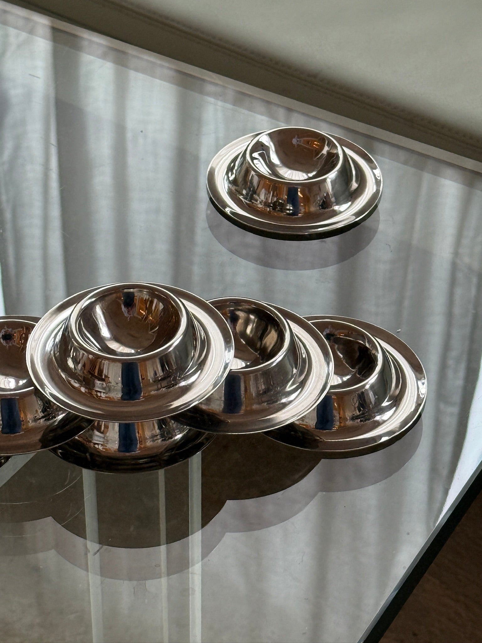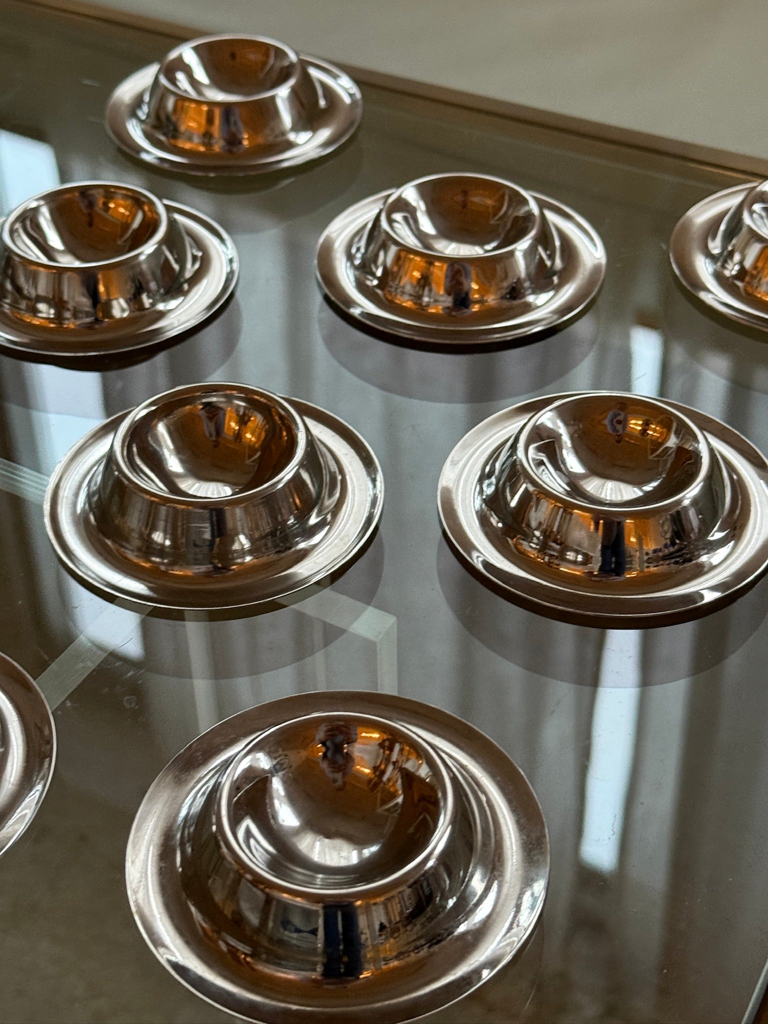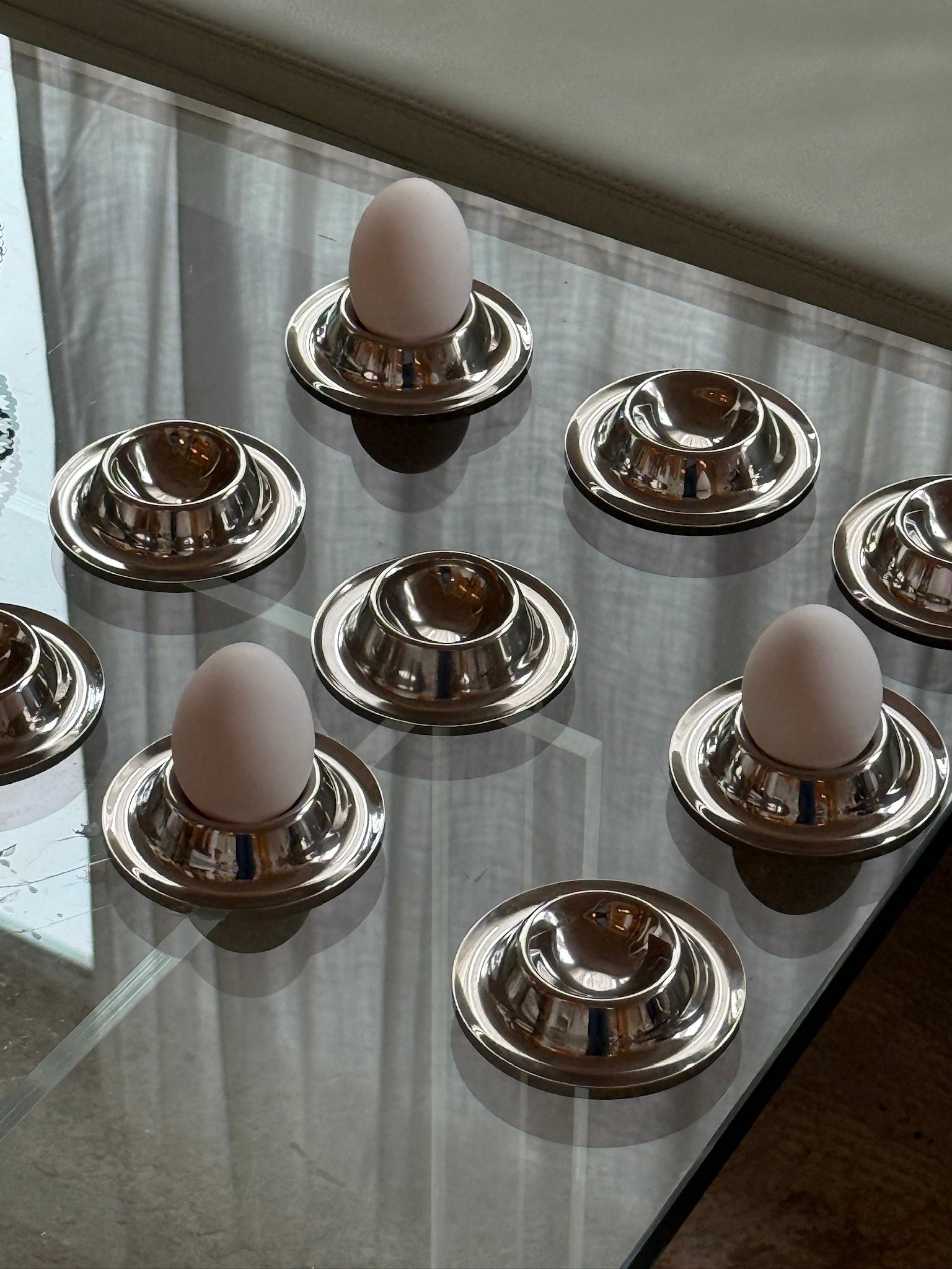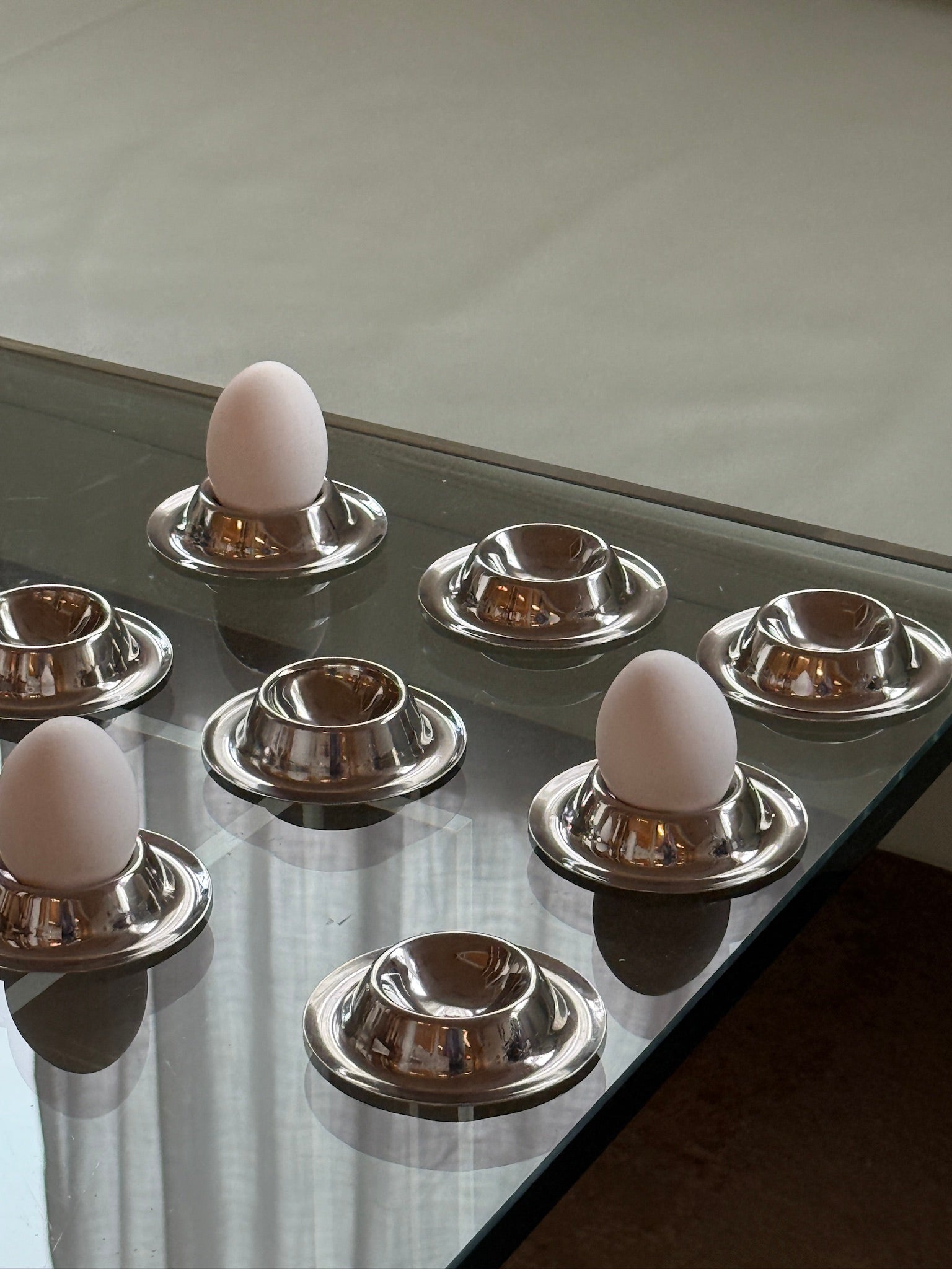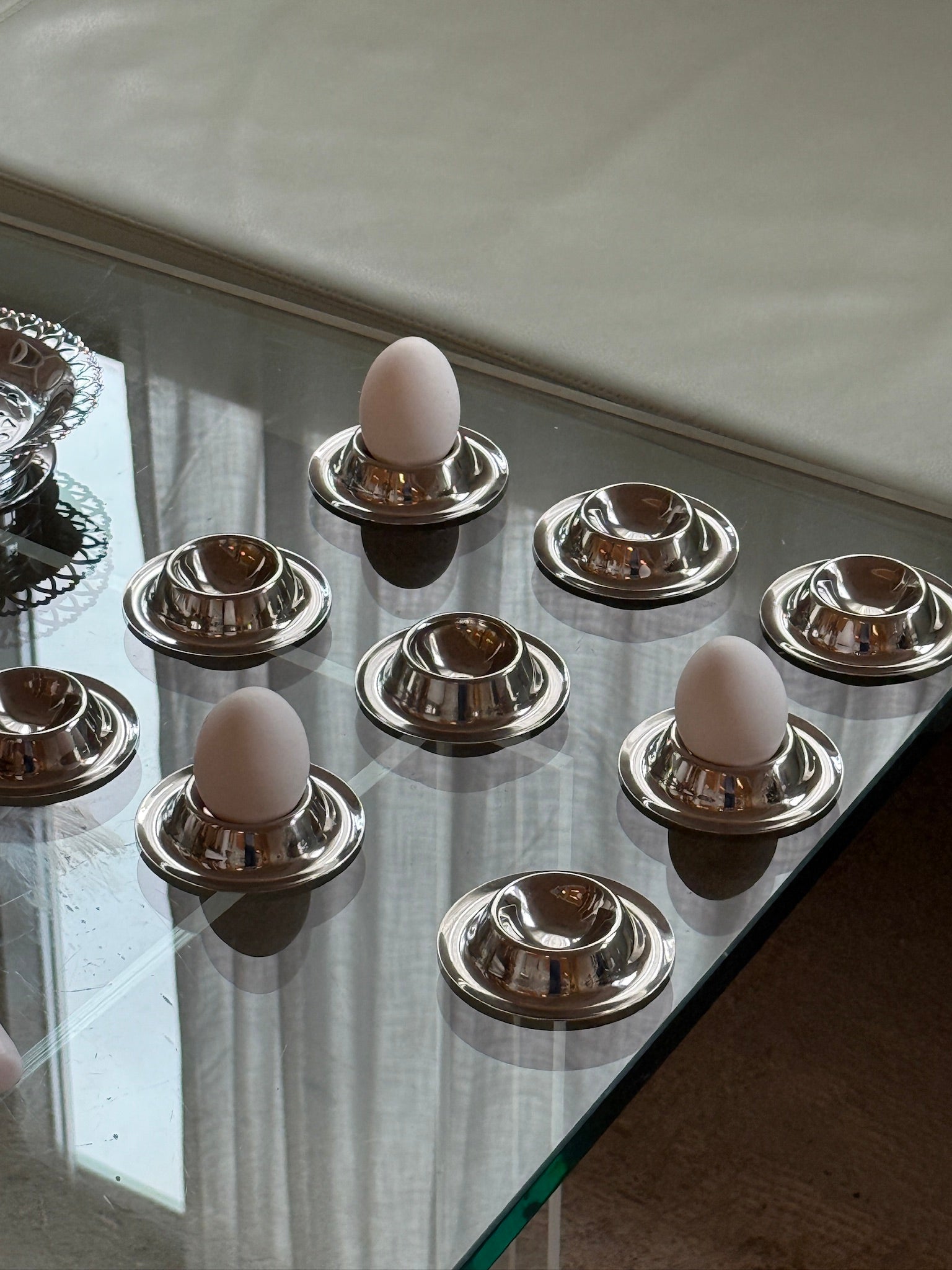 Smukke, minimalistiske æggebægere i metal. Det blanke, spejlende udtryk giver et elegant og moderne look, samtidig med at den runde, bløde form tilfører et klassisk touch.