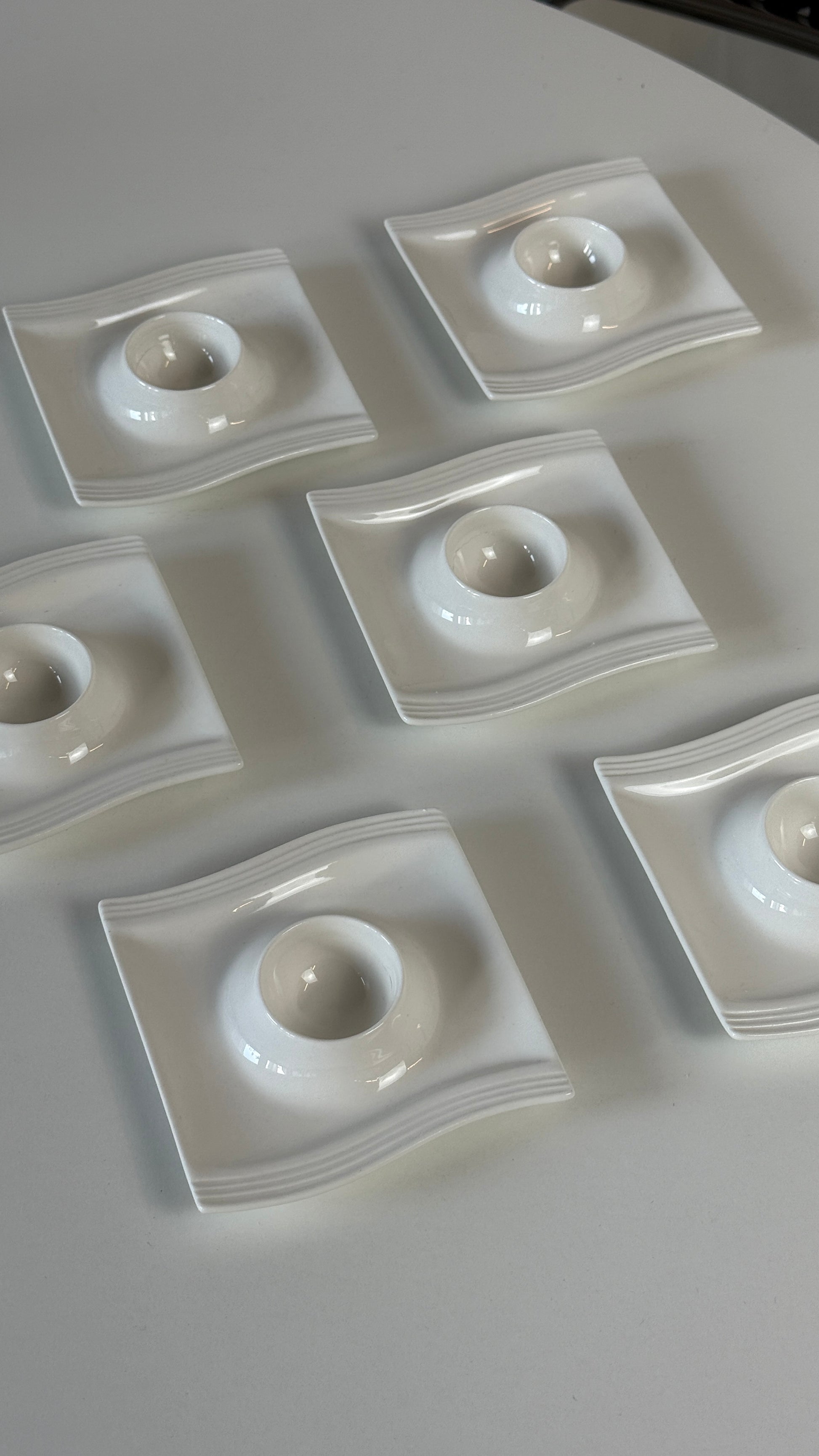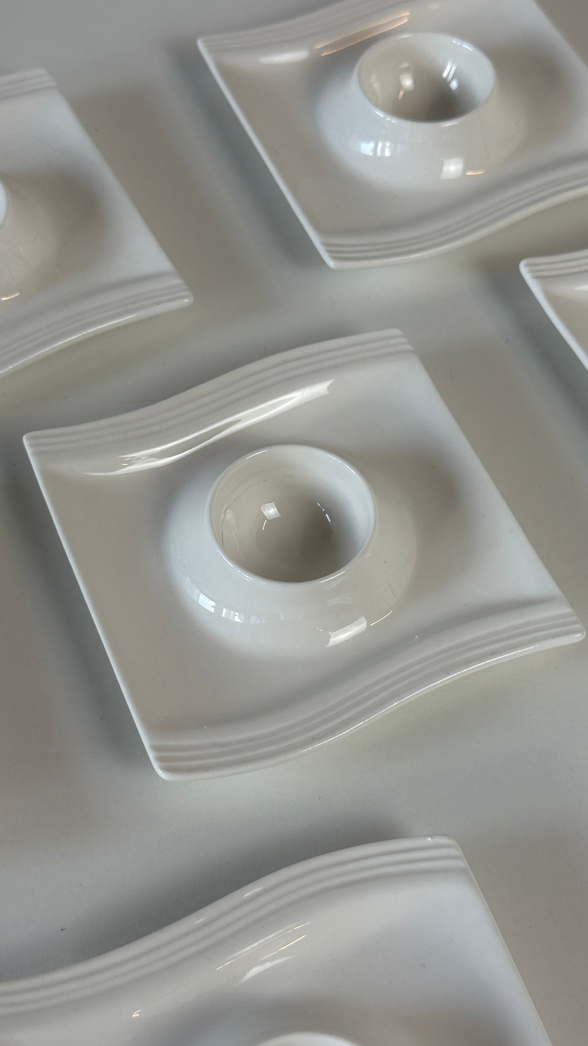 Elegant og enkelt æggebæger i hvidt porcelæn med kvadratisk form og bløde, let bølgede kanter. Det rene udtryk gør æggebægeret nemt at kombinere med både klassisk og moderne borddækning.