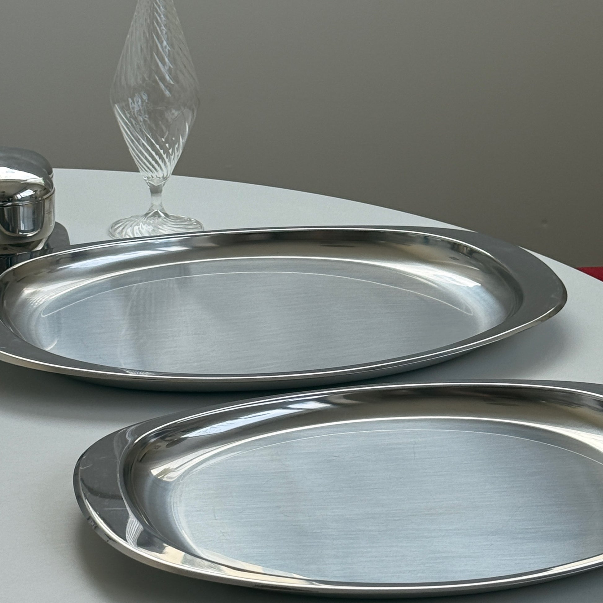 Elegante ovale serveringsfade i rustfrit stål fra serien Avio (model nr. 115) fra italienske Alessi. Designet af Carlo Mazzeri og Anselmo Vitale i 1961, et ikonisk eksempel på mid-century italiensk design.