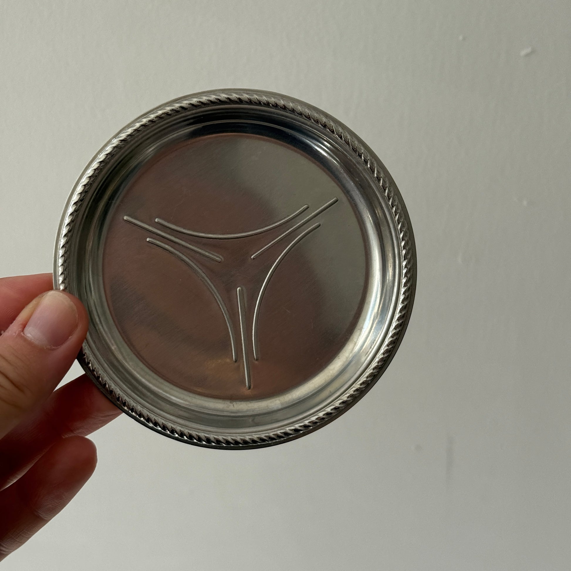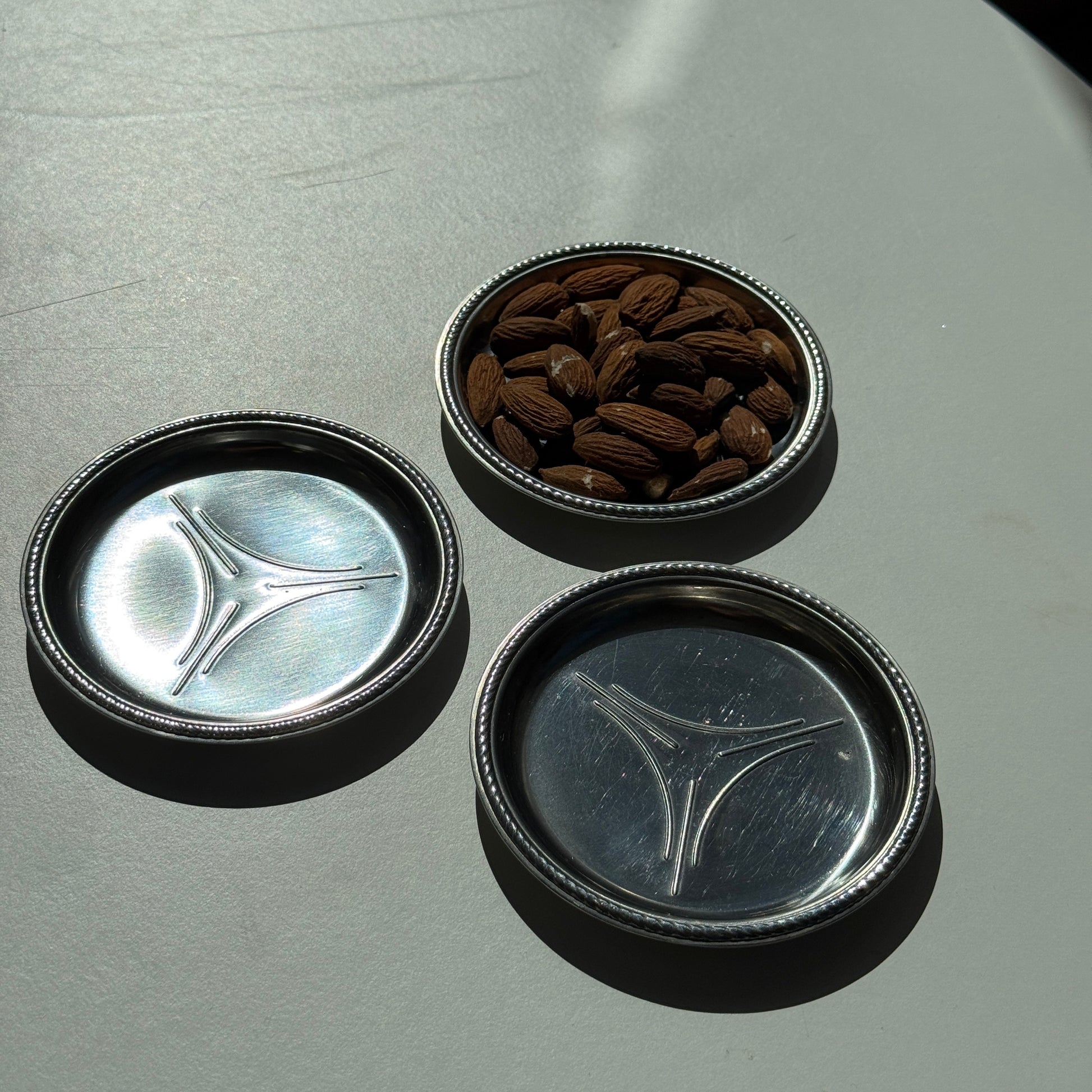 Elegante vintage bordskånere / glasbrikker fra Alfra Alessi, Italy, udført i 18/10 rustfrit stål. Designet er kendetegnet ved den snoede kant og den præget, tredelte dekoration i midten. Kan bruges som glas- eller flaskeunderlag, til små serveringer som nødder og snacks eller som dekorative elementer på bordet.