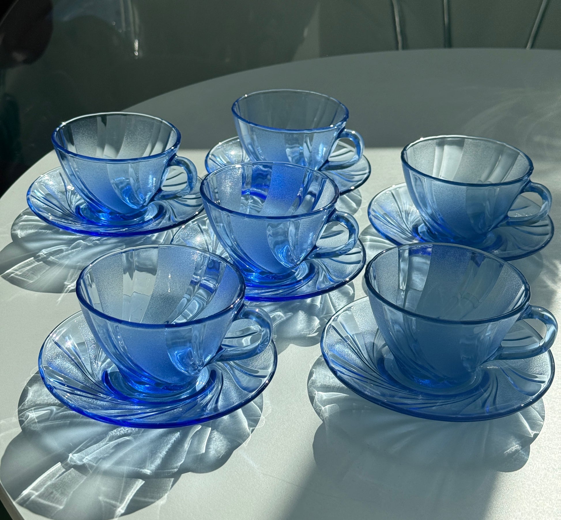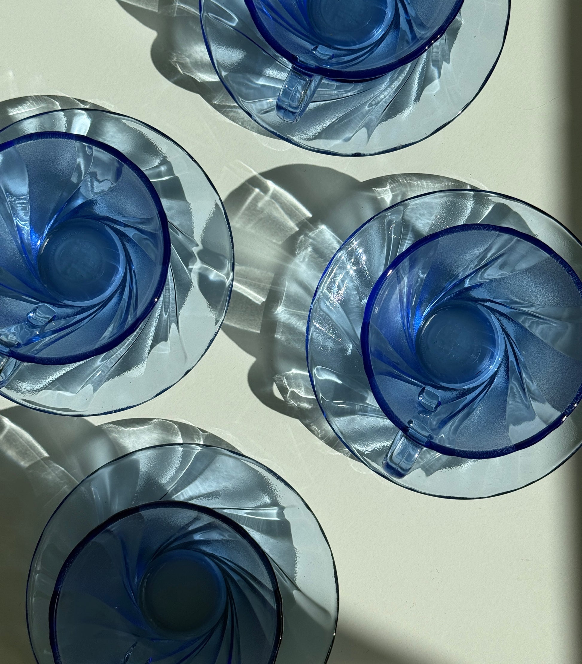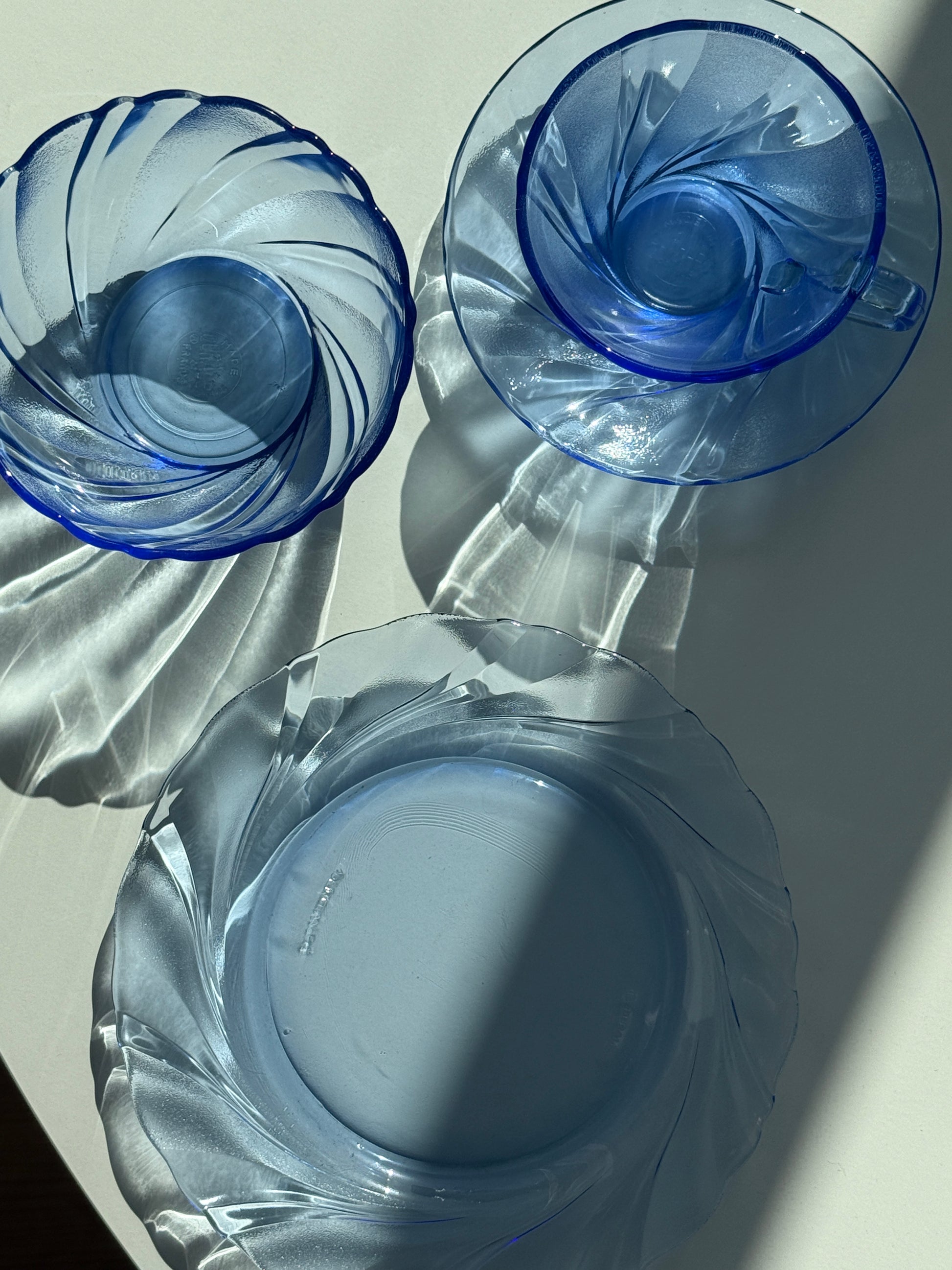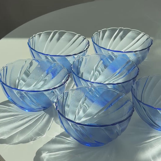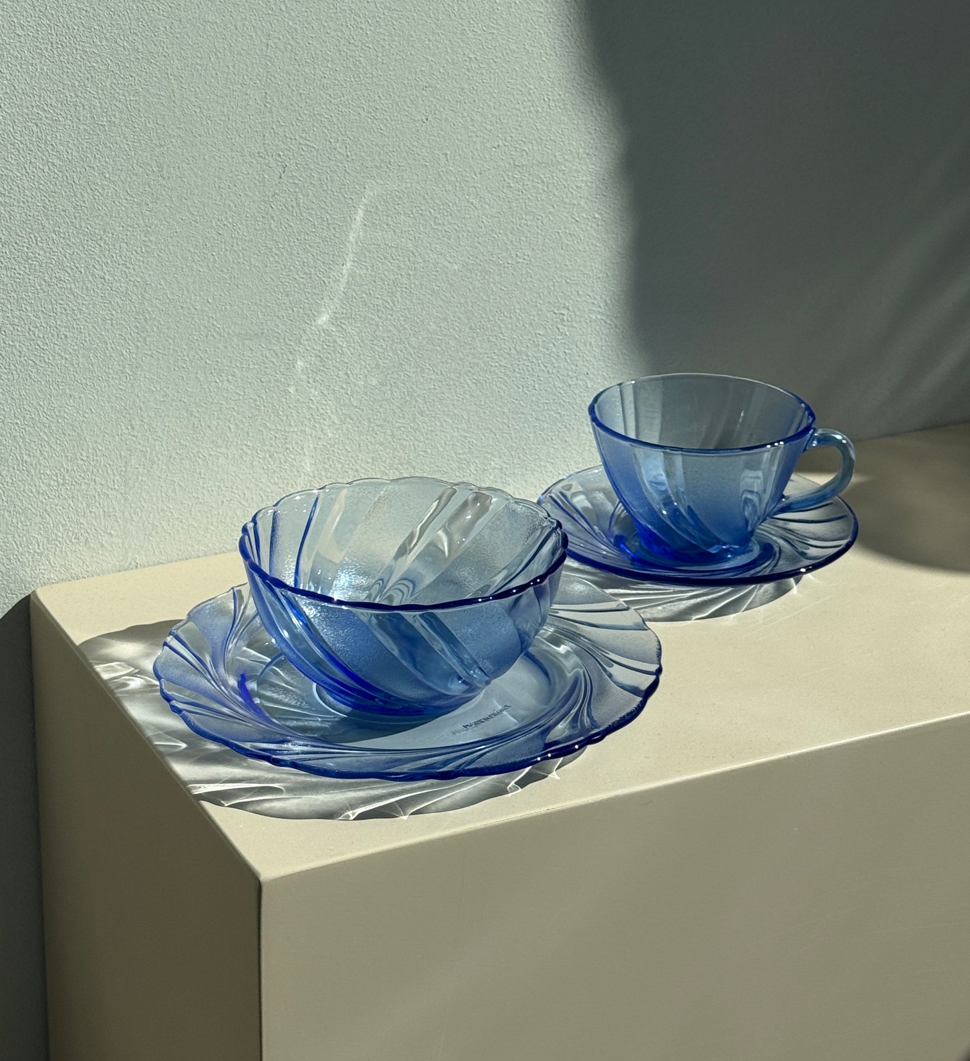 Smukt og stilrent sæt fra Duralex i modellen Beau Rivage – et klassisk design i transparent blå glas med dekorativ, swirl-formet struktur. Perfekt til både morgenbordet og dessertservering.