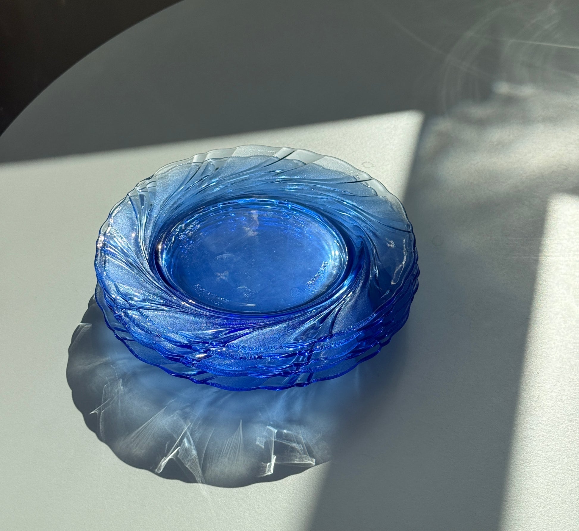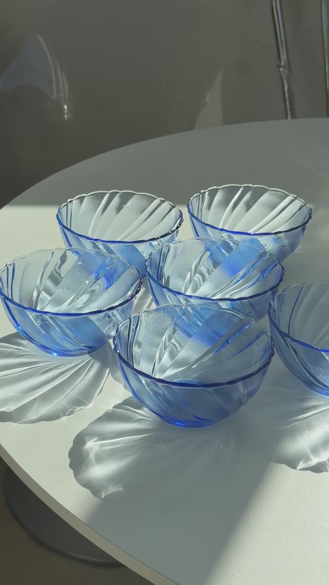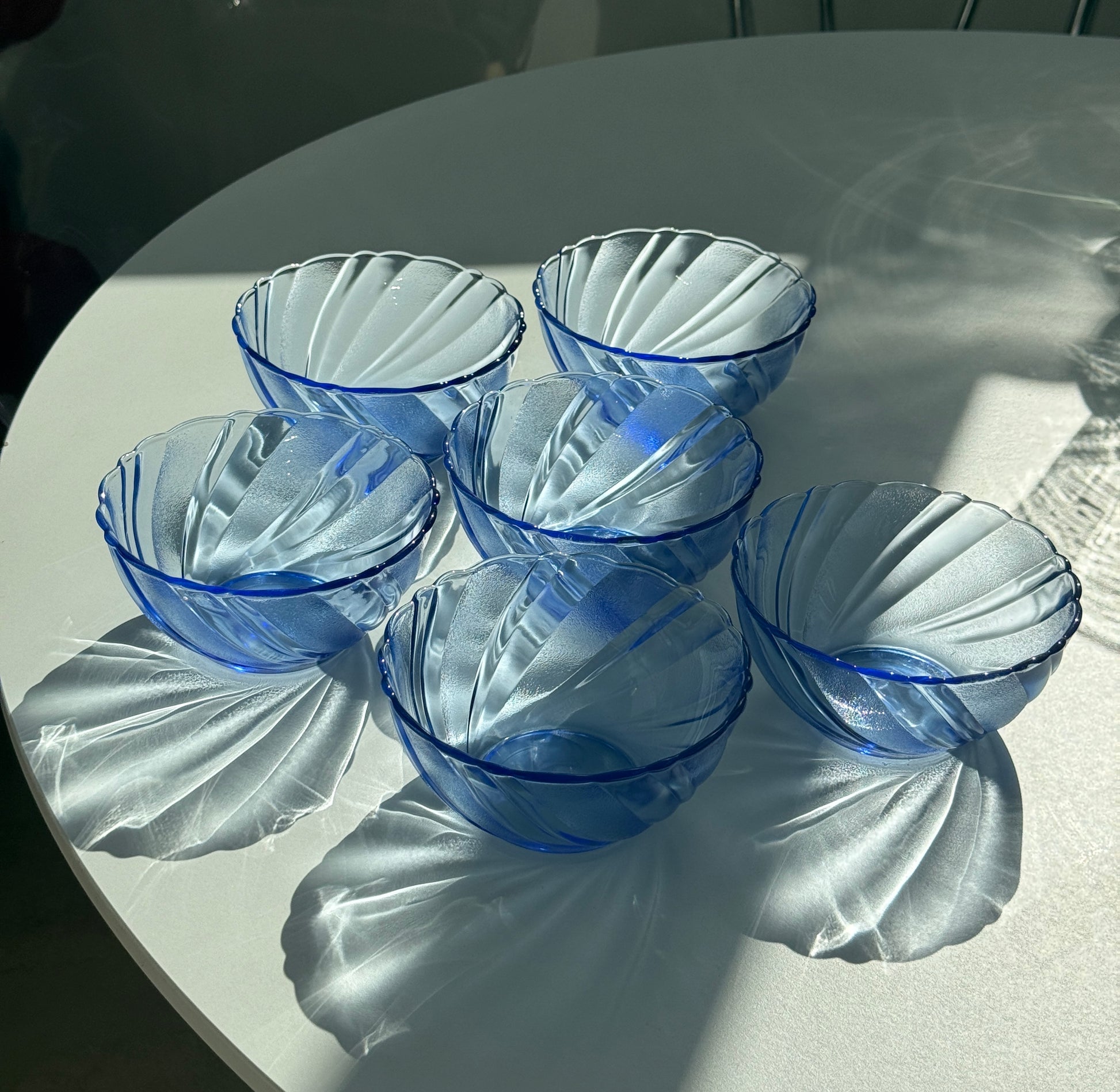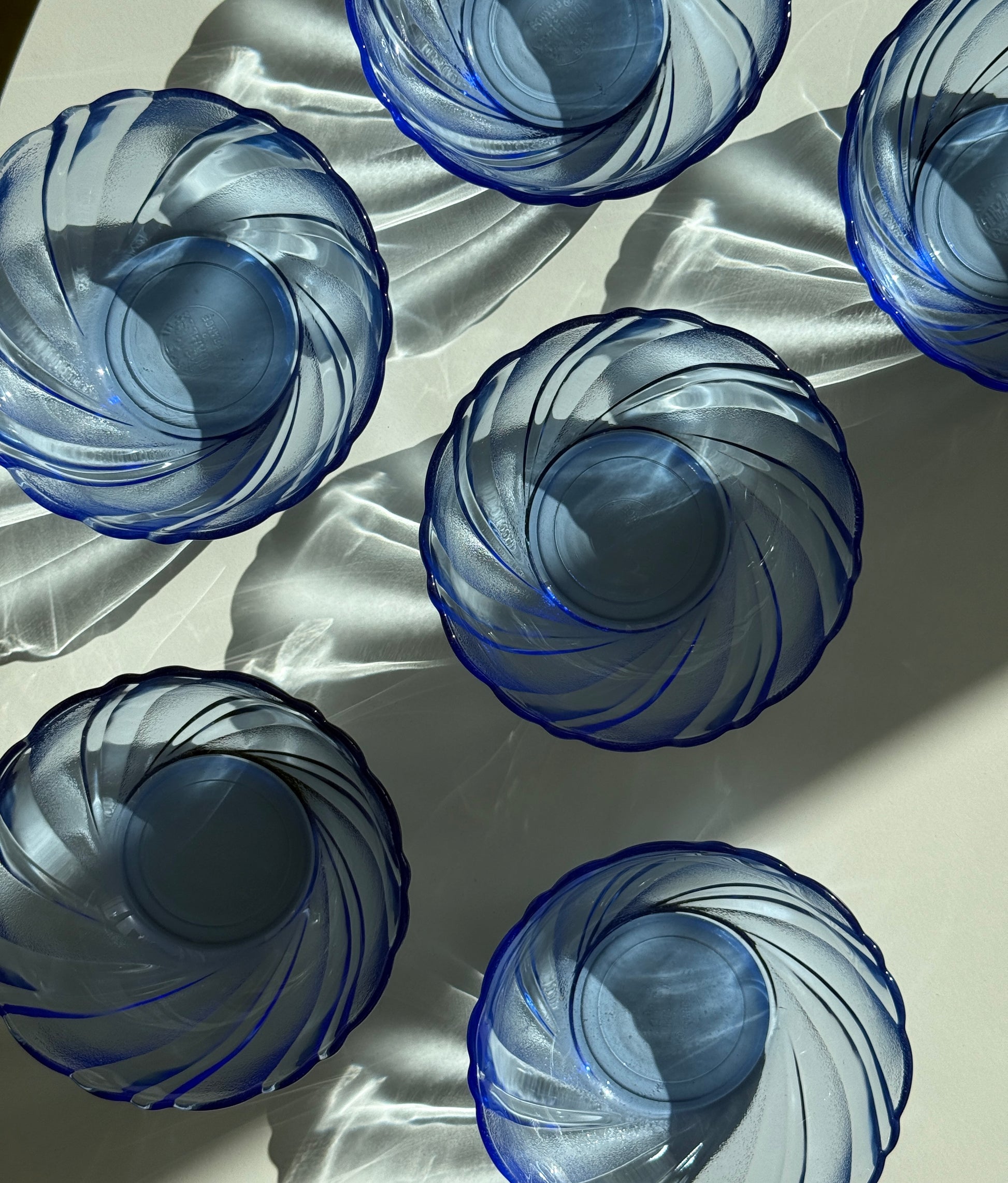Smukt og stilrent sæt fra Duralex i modellen Beau Rivage – et klassisk design i transparent blå glas med dekorativ, swirl-formet struktur. Perfekt til både morgenbordet og dessertservering.