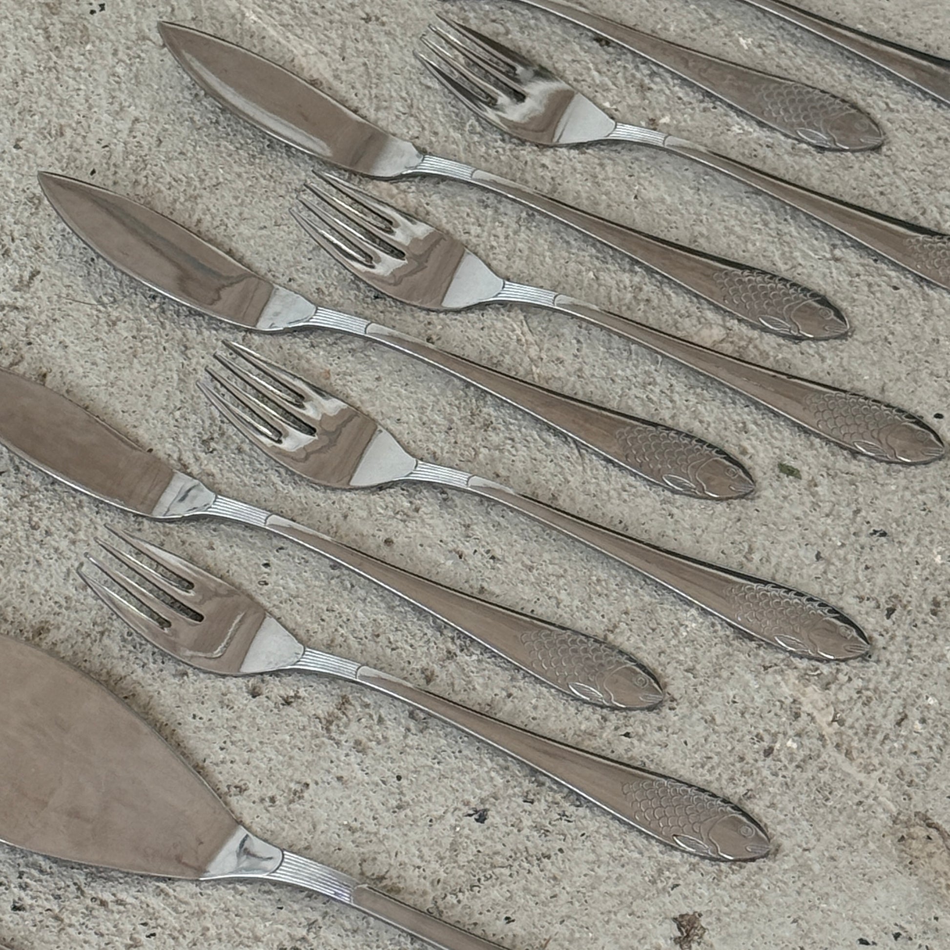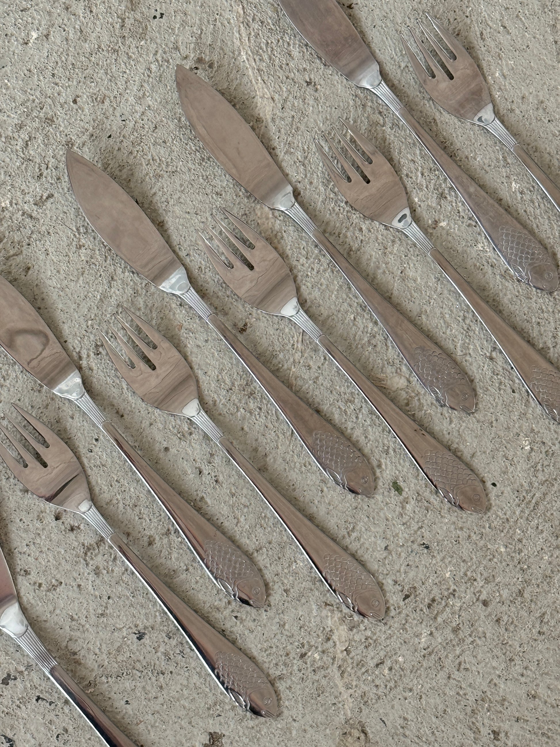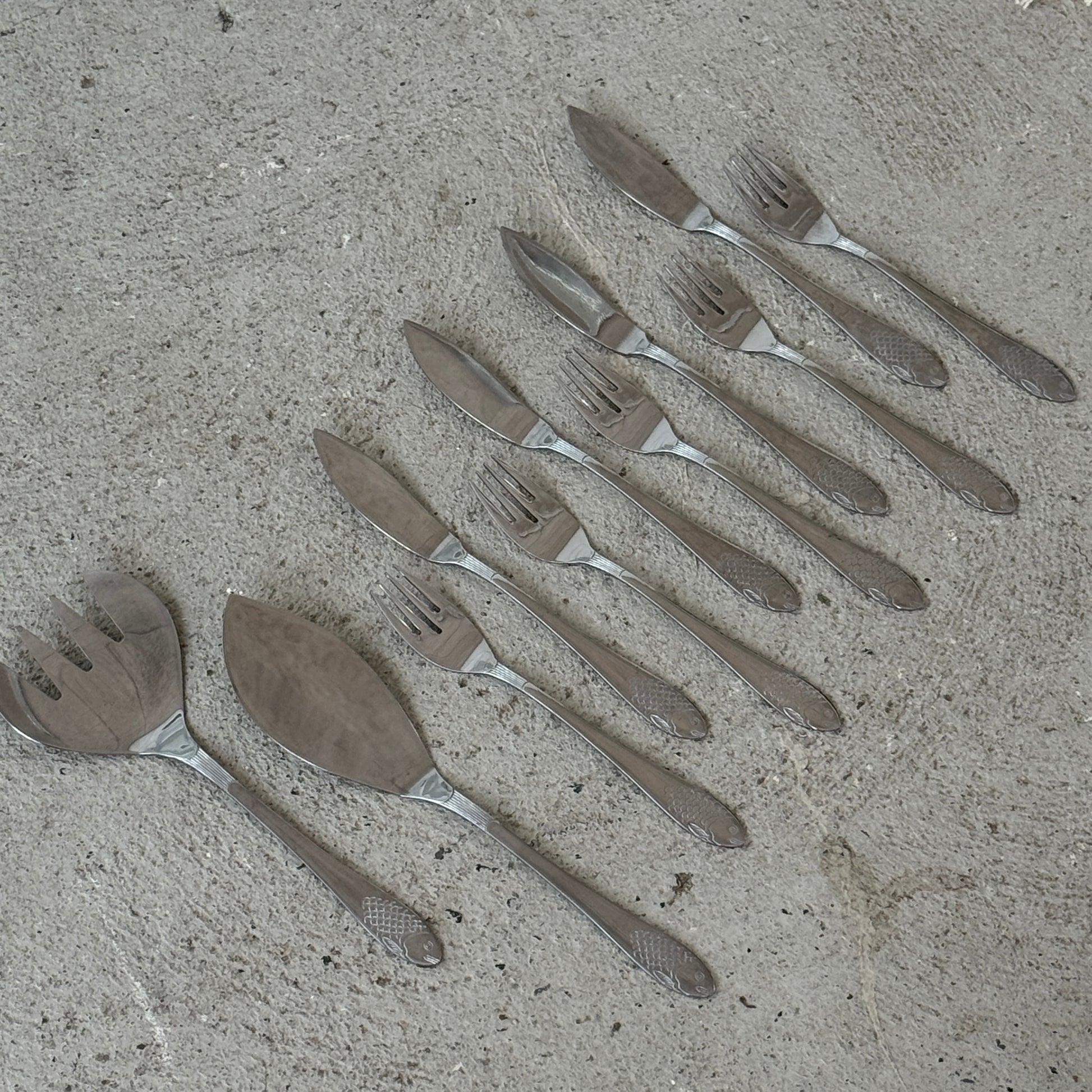 Sættet består af 6 knive, 5 gafler samt 1 serveringssæt (gaffel og palette) – perfekt til servering og anretning af fisk.