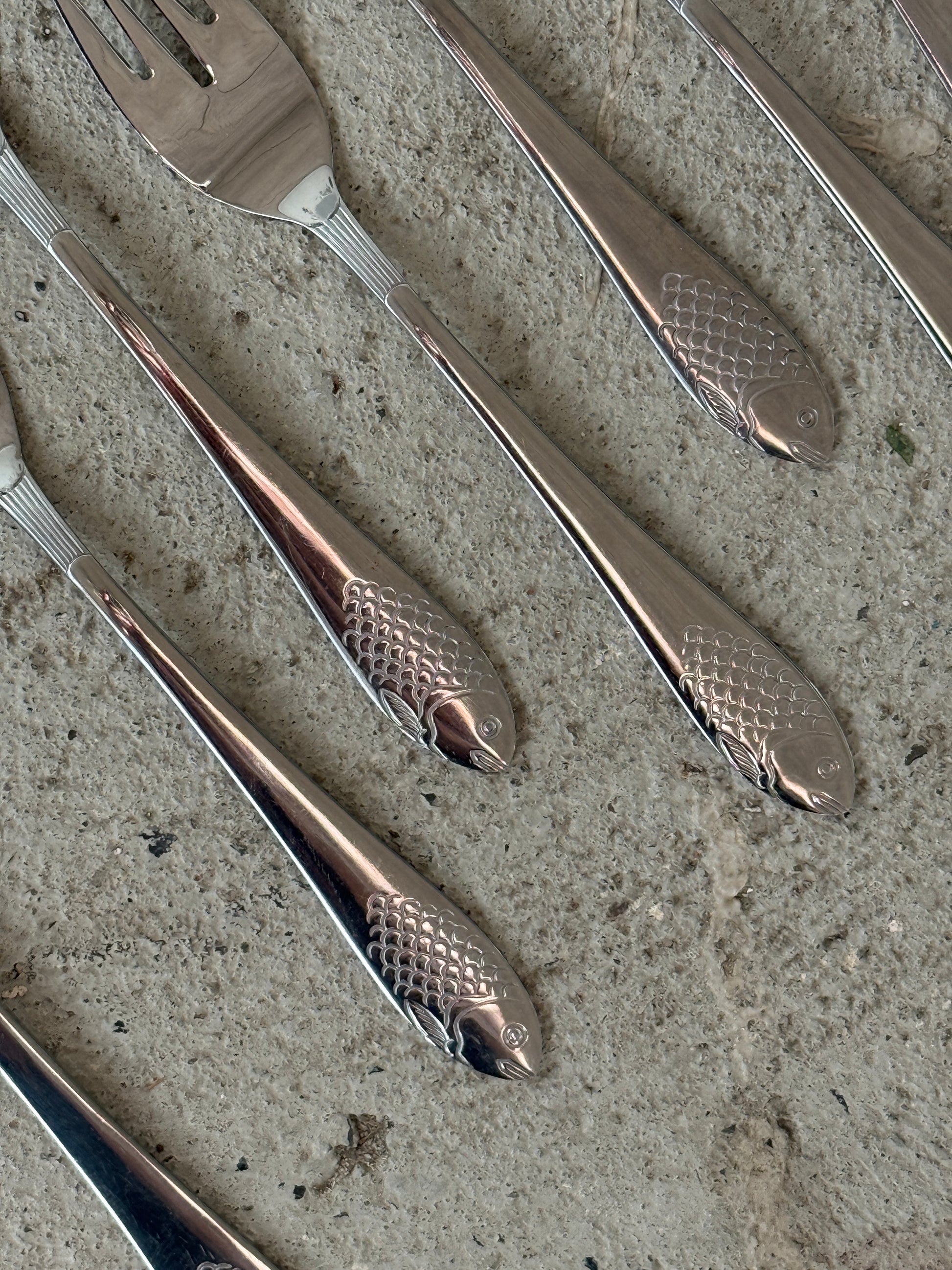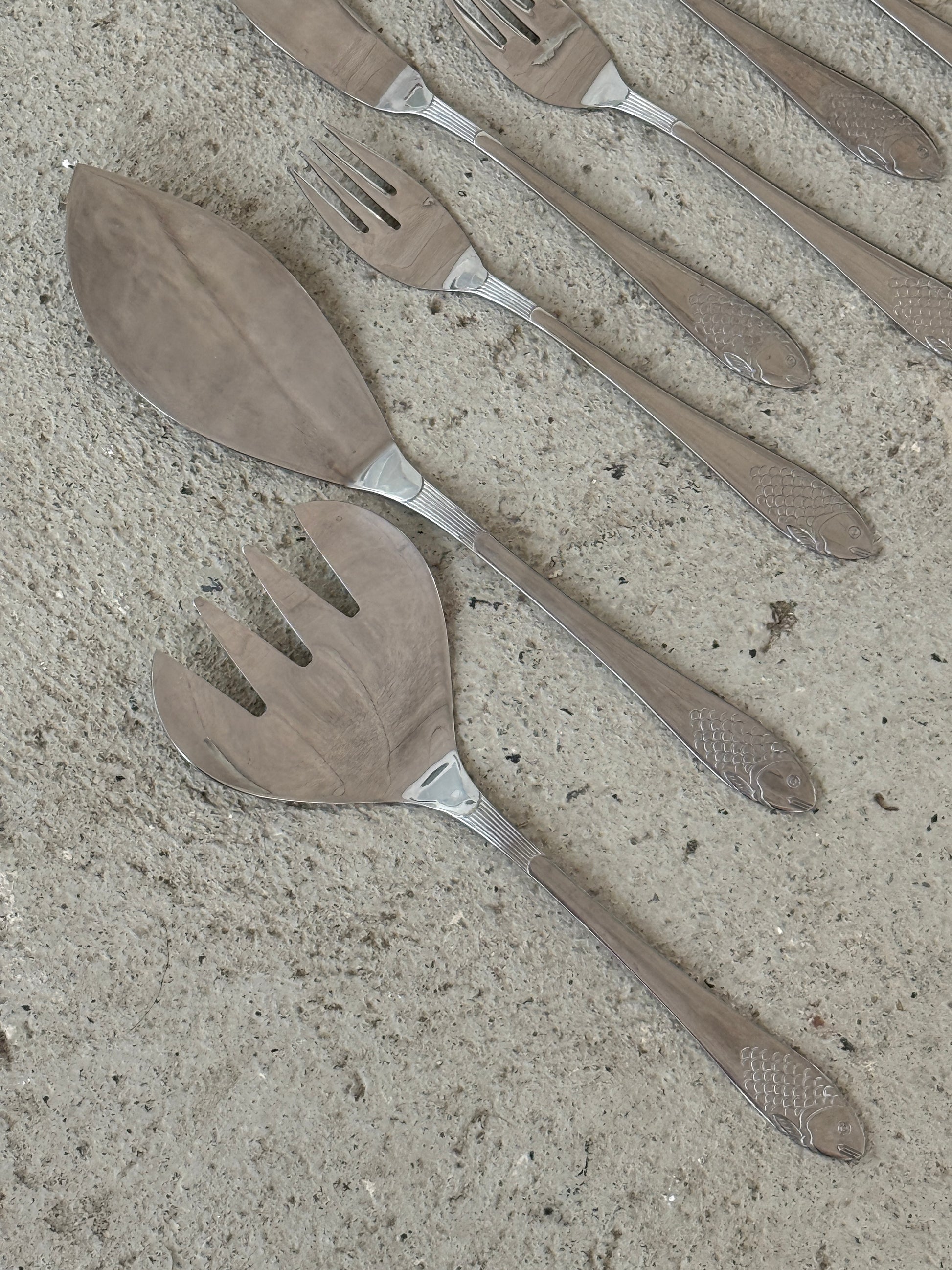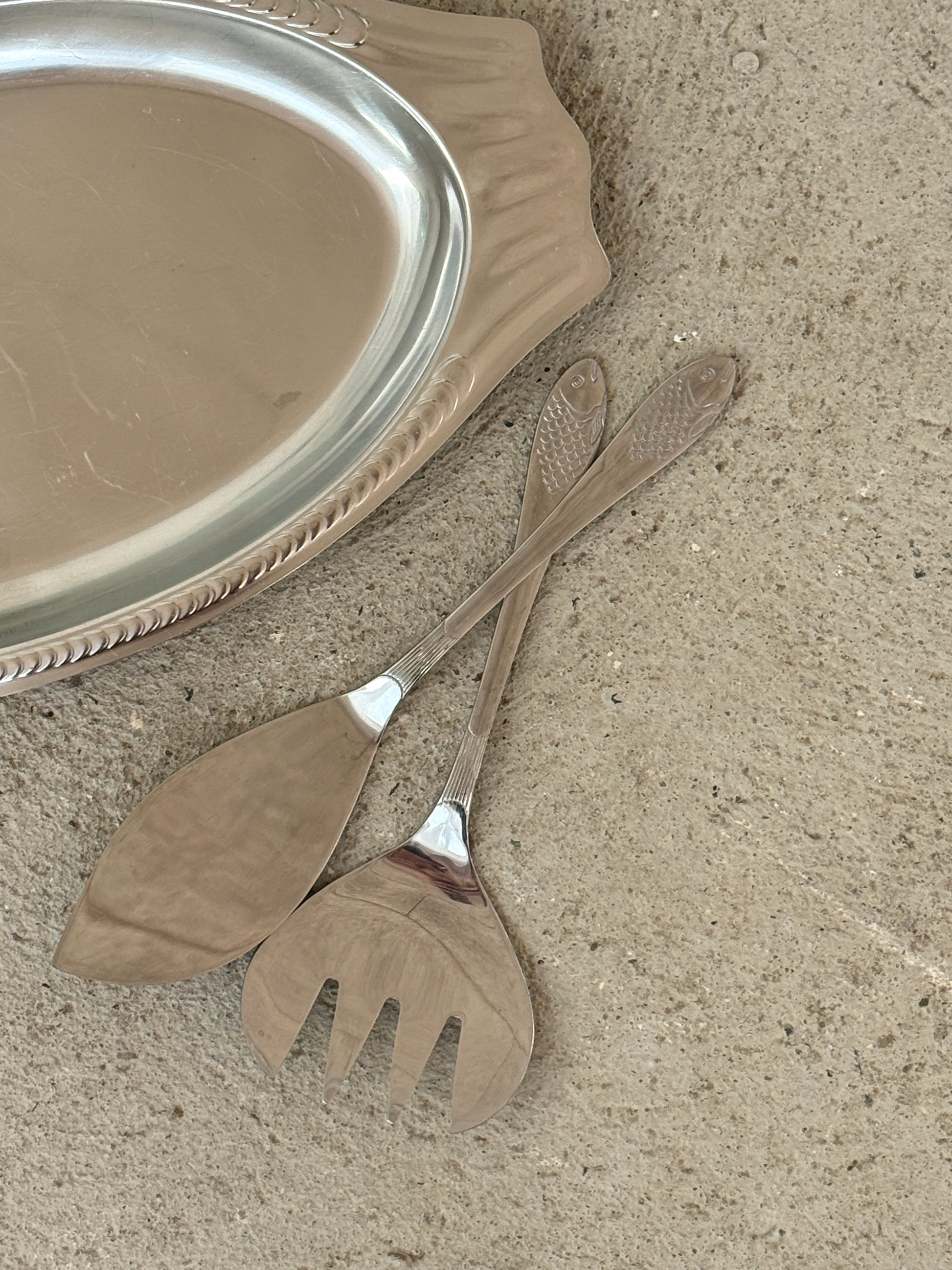 Smukt vintage fiskebestik i metal med fint præget fiskemotiv på skaftet.