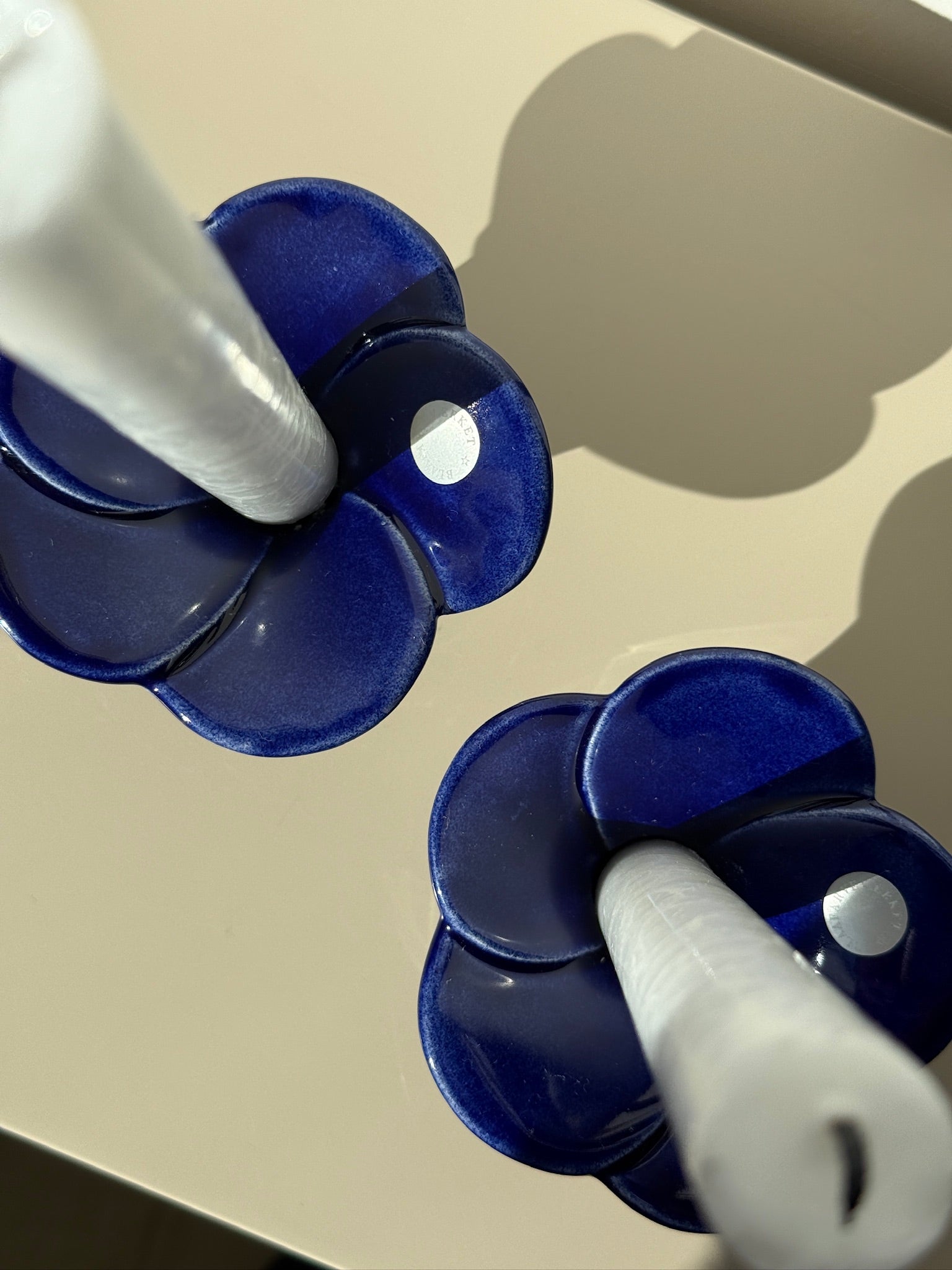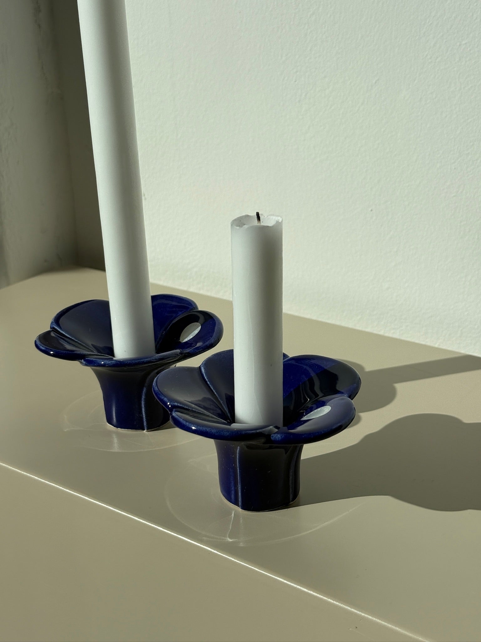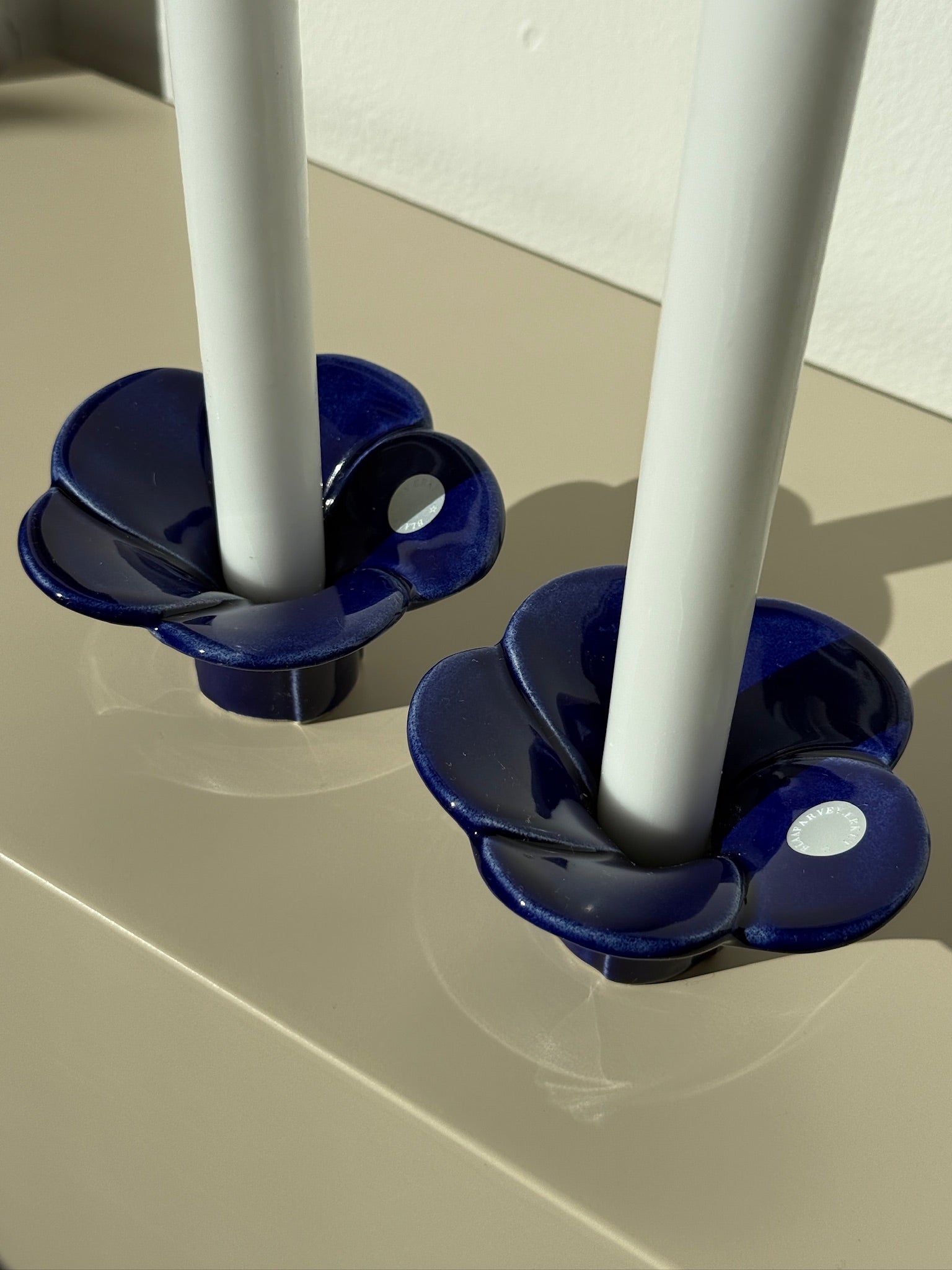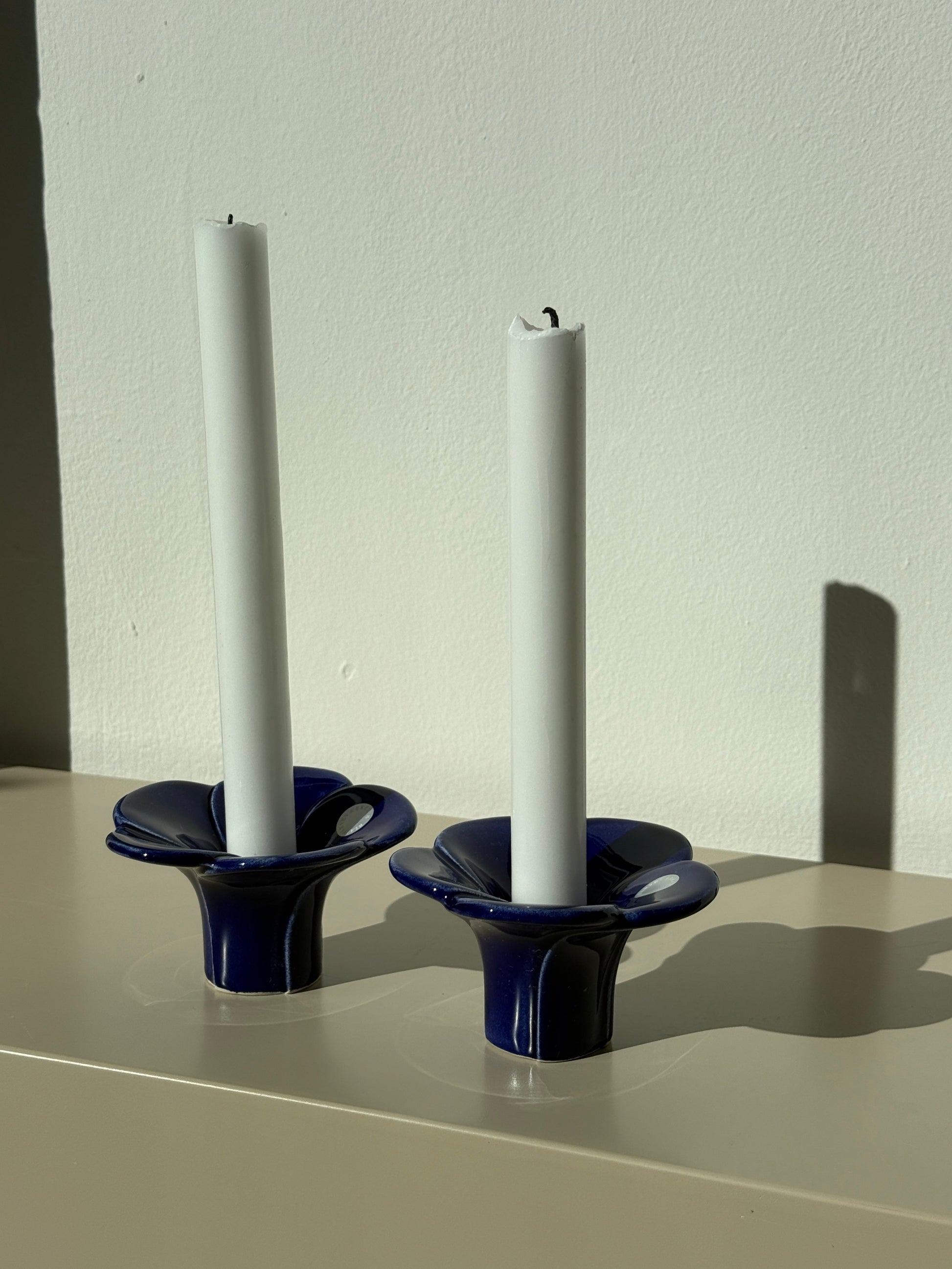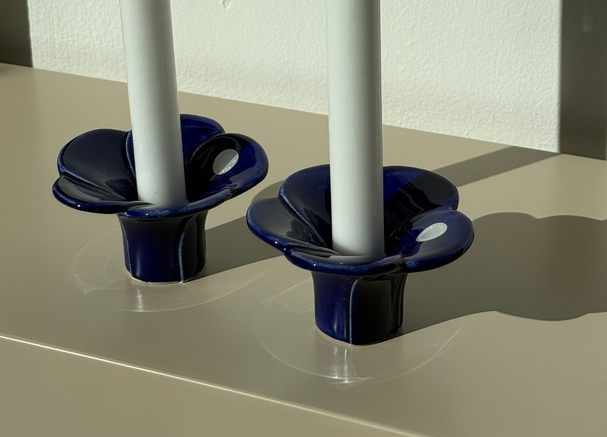 Dette smukke sæt af keramiske lysestager er fra Blaafarveværket, kendt for deres traditionelle og håndværksmæssige kvalitet. Lysestagerne har en elegant, blomsterformet silhuet med en dybblå glasur.