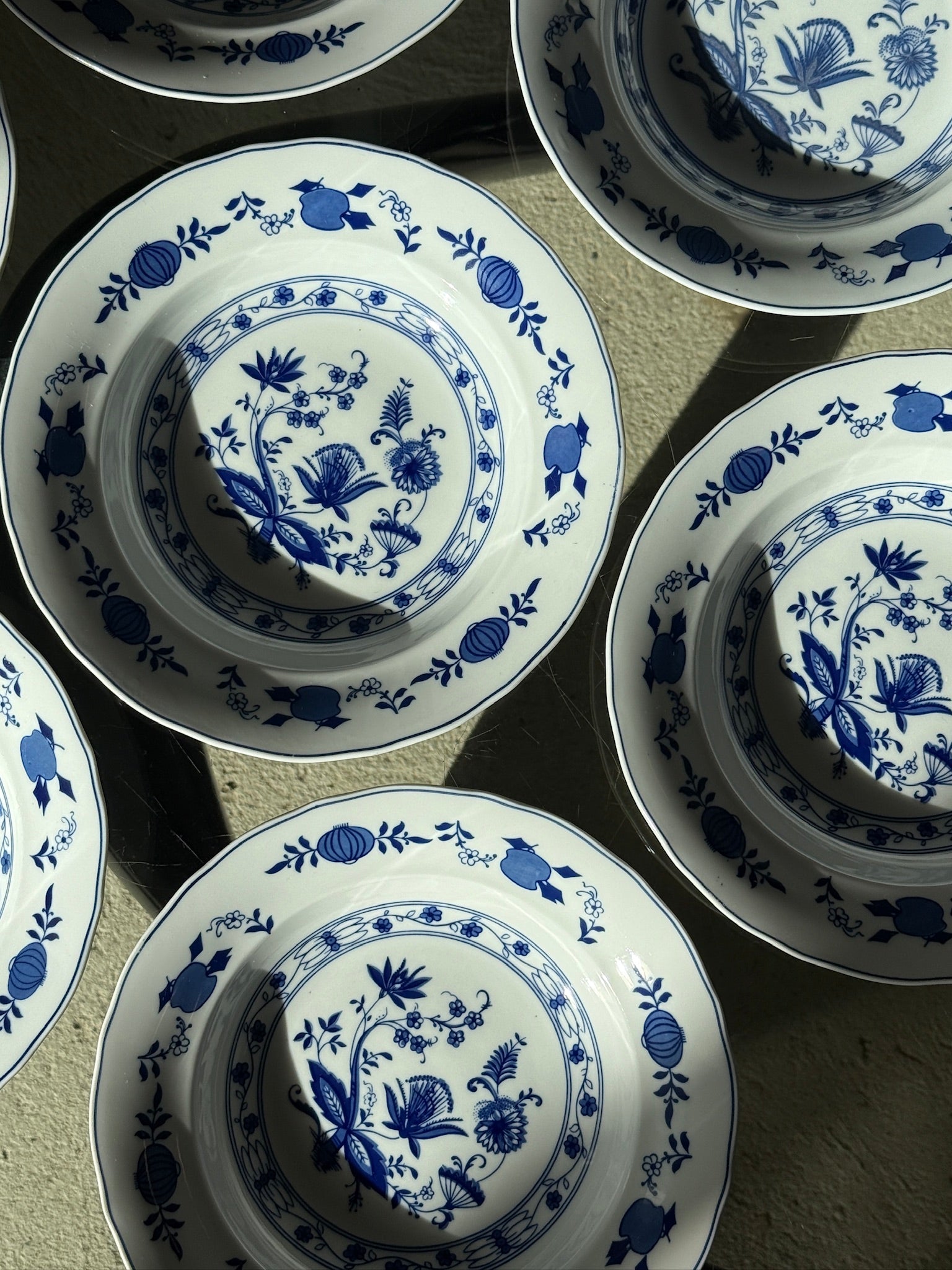 Smukke vintage tallerkener fra Wellco Design Krefeld, fremstillet i Tyskland. Det klassiske blå-hvide mønster er inspireret af den ikoniske Zwiebelmuster-stil. Findes både som middagstallerkener og dybe tallerkener – perfekte til alt fra hverdagsbrug til et dækket retrobord.