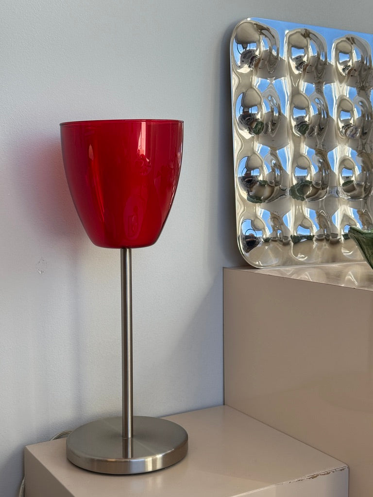Unik bordlampe med en dybrød glasskærm, som står i flot kontrast til den minimalistiske fod i børstet stål.