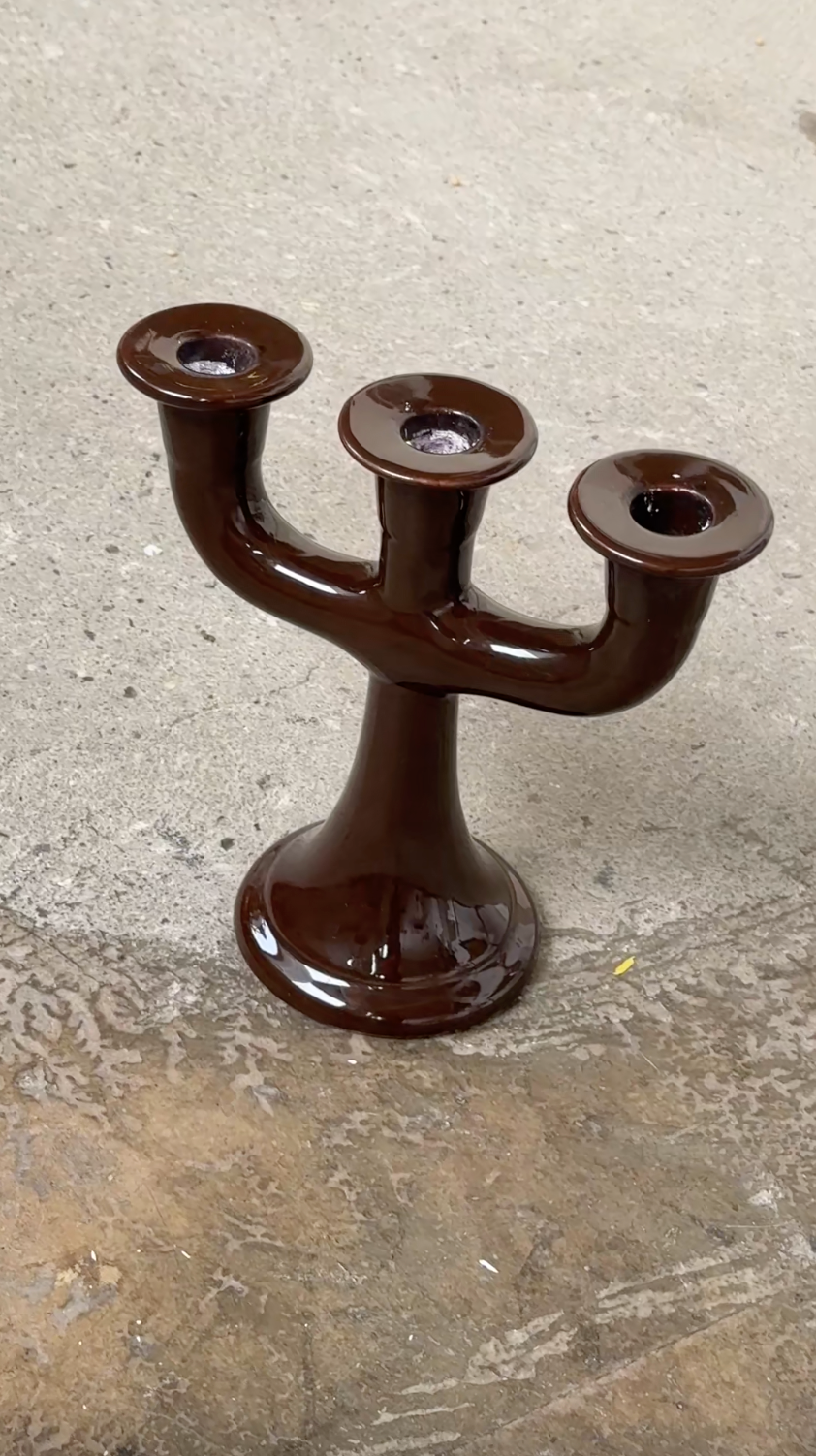 Smuk, klassisk lysestage i brunglaseret keramik med plads til tre stagelys. Glasuret har en dyb, blank overflade, der giver stagen et elegant og roligt udtryk.