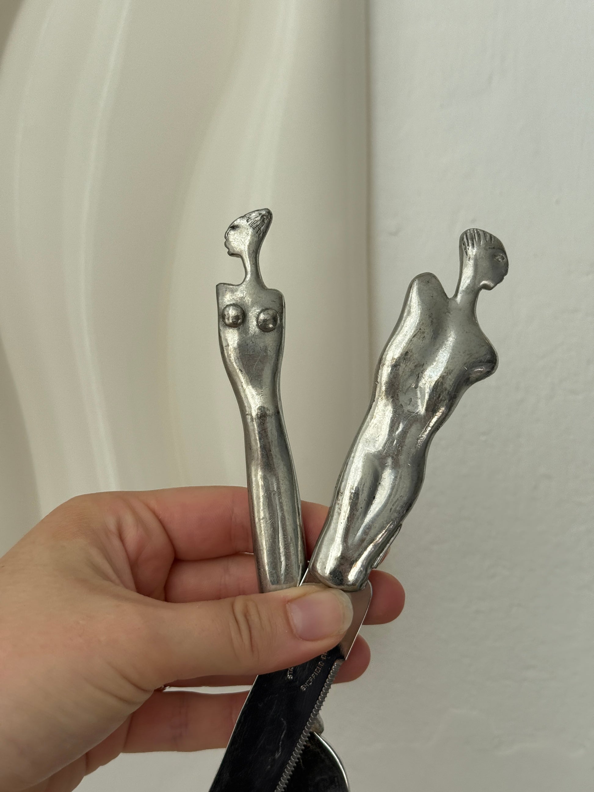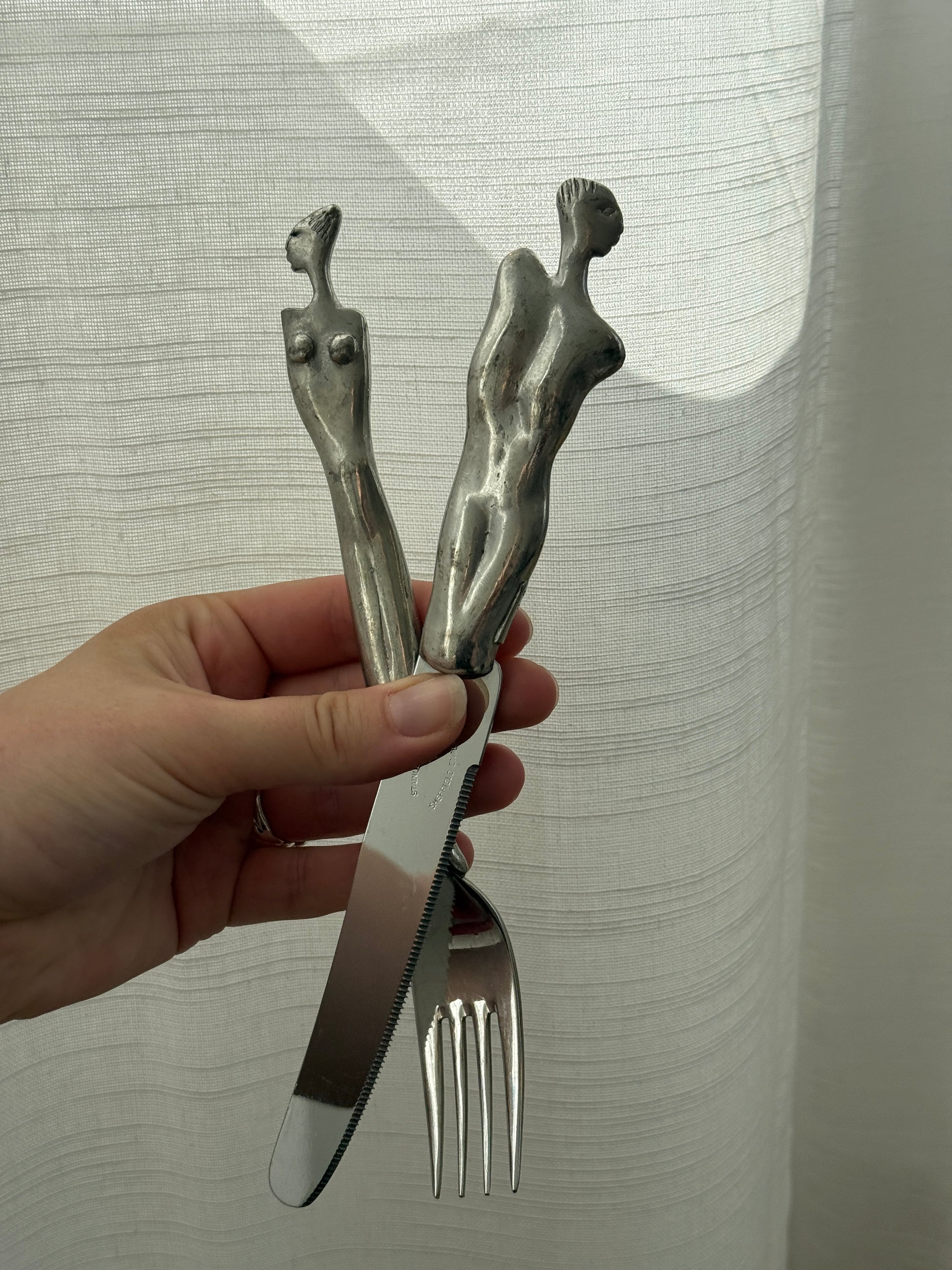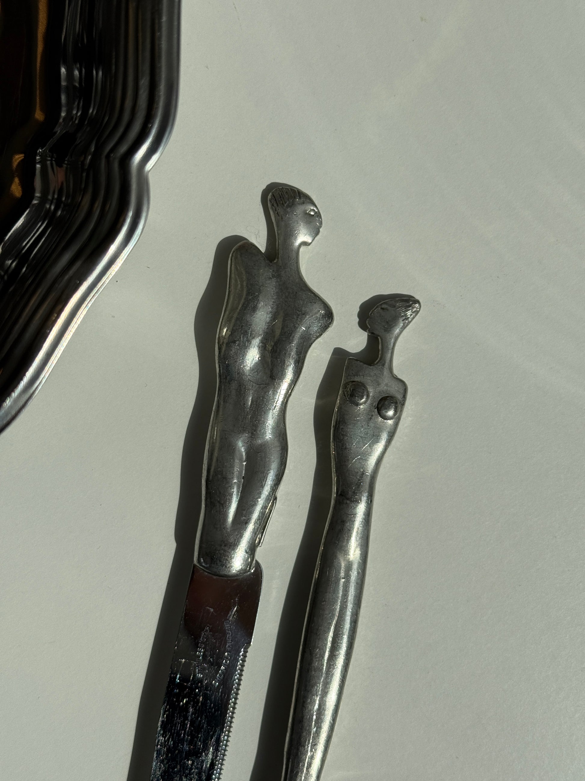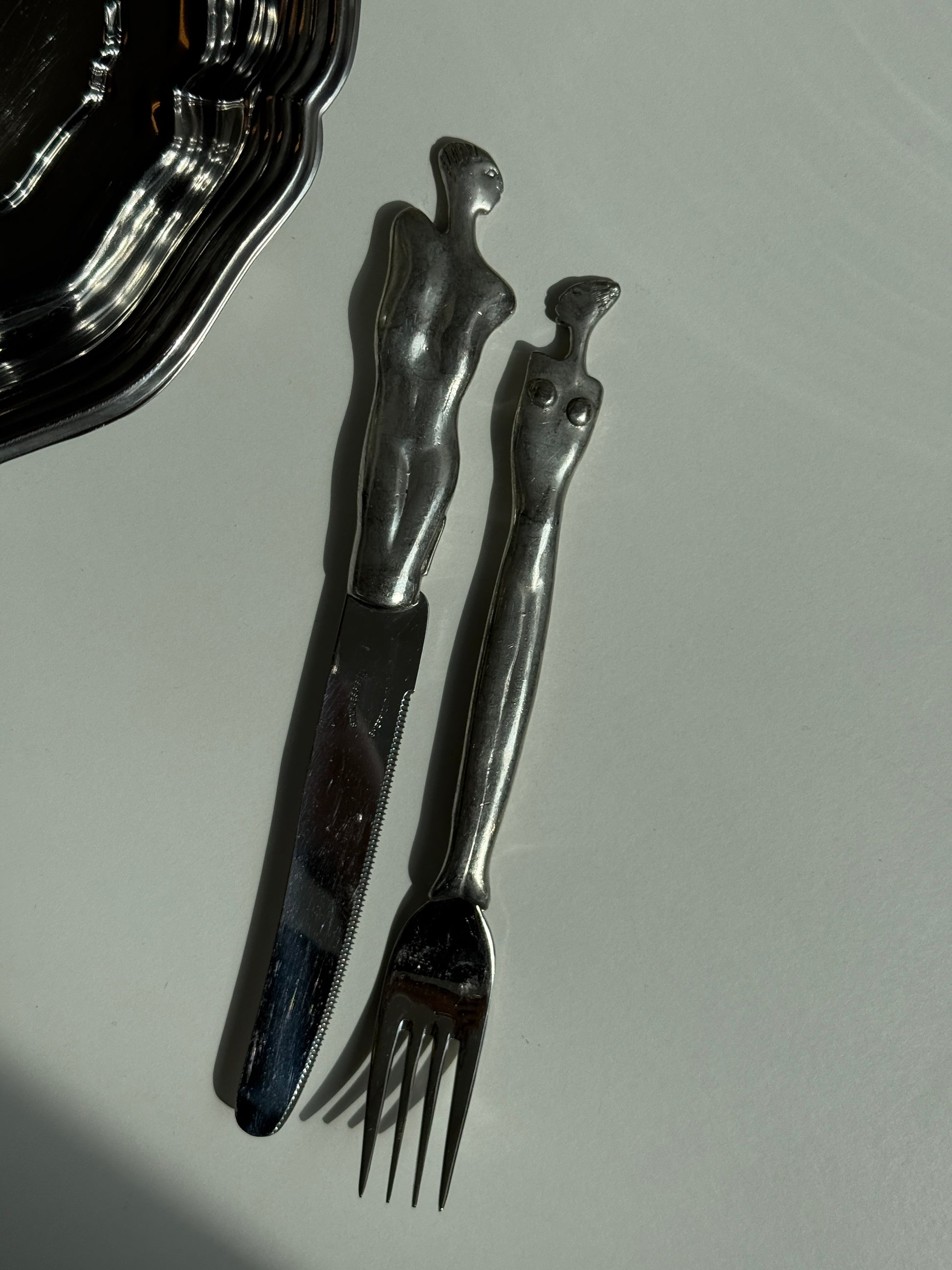 Et sæt ikonisk Carroll Boyes-bestik bestående af en kniv og en gaffel i skulpturelt design. Håndtagene forestiller henholdsvis en mandlig og en kvindelig figur – karakteristisk for Boyes' kunstneriske designs. Fremstillet i metal med en mat finish og et moderne, organisk formsprog.