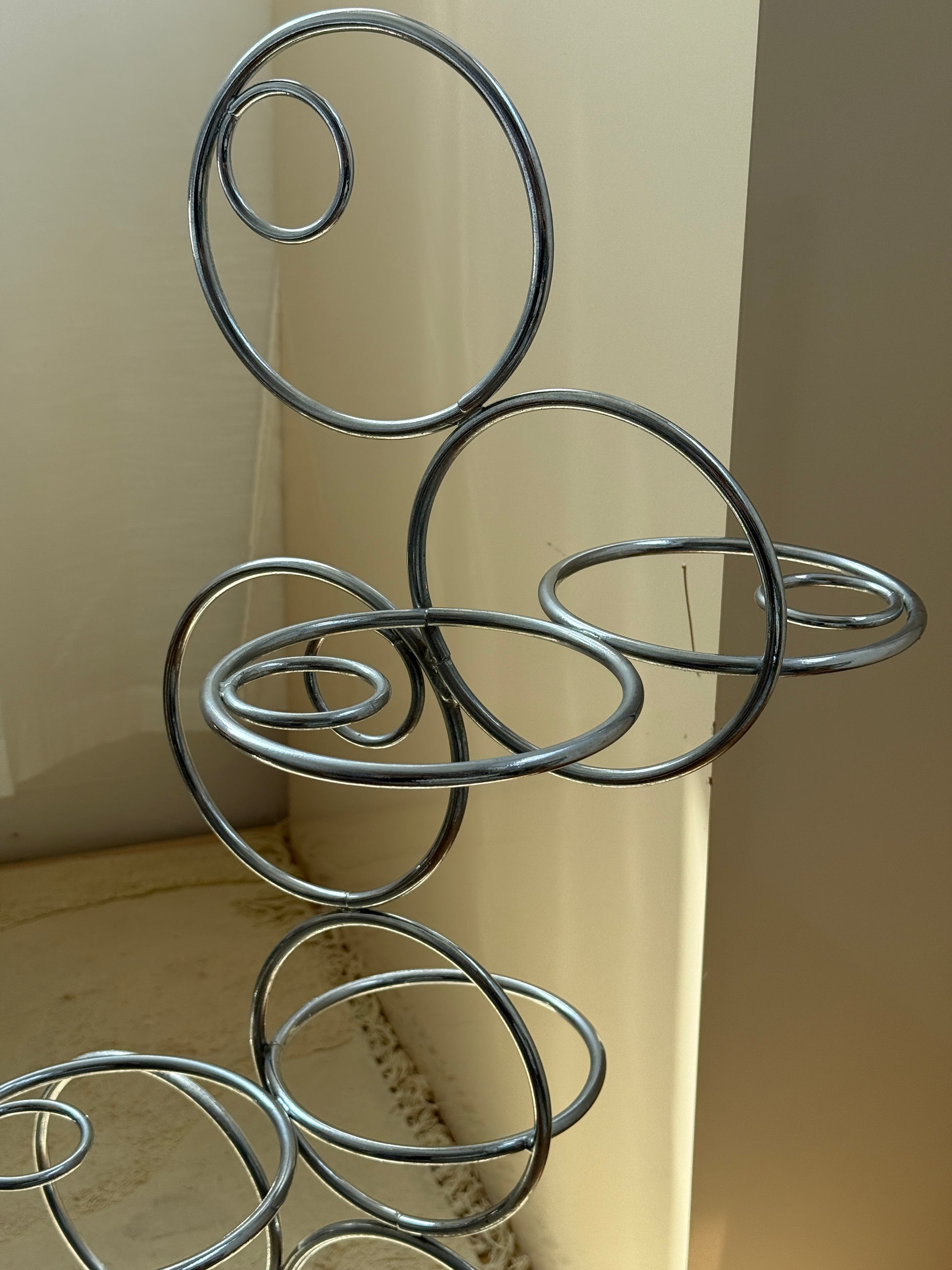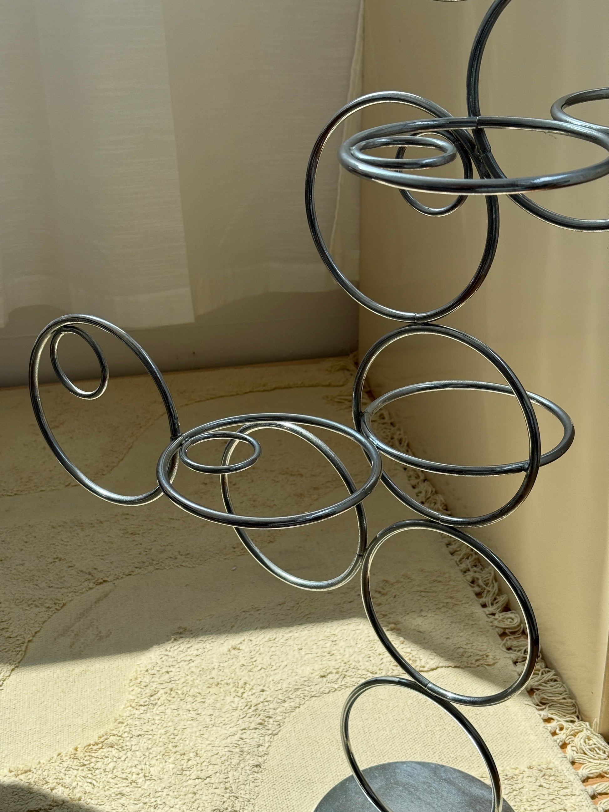 Skulpturelt stativ i forkromet metal med organiske, cirkulære former og fod. Kan bruges dekorativt i sig selv – eller som funktionel holder til paraplyer eller potteplanter. Den industrielle form og åbne struktur giver et kunstnerisk udtryk og vil fungerer perfekt som et centerpiece i en entré.