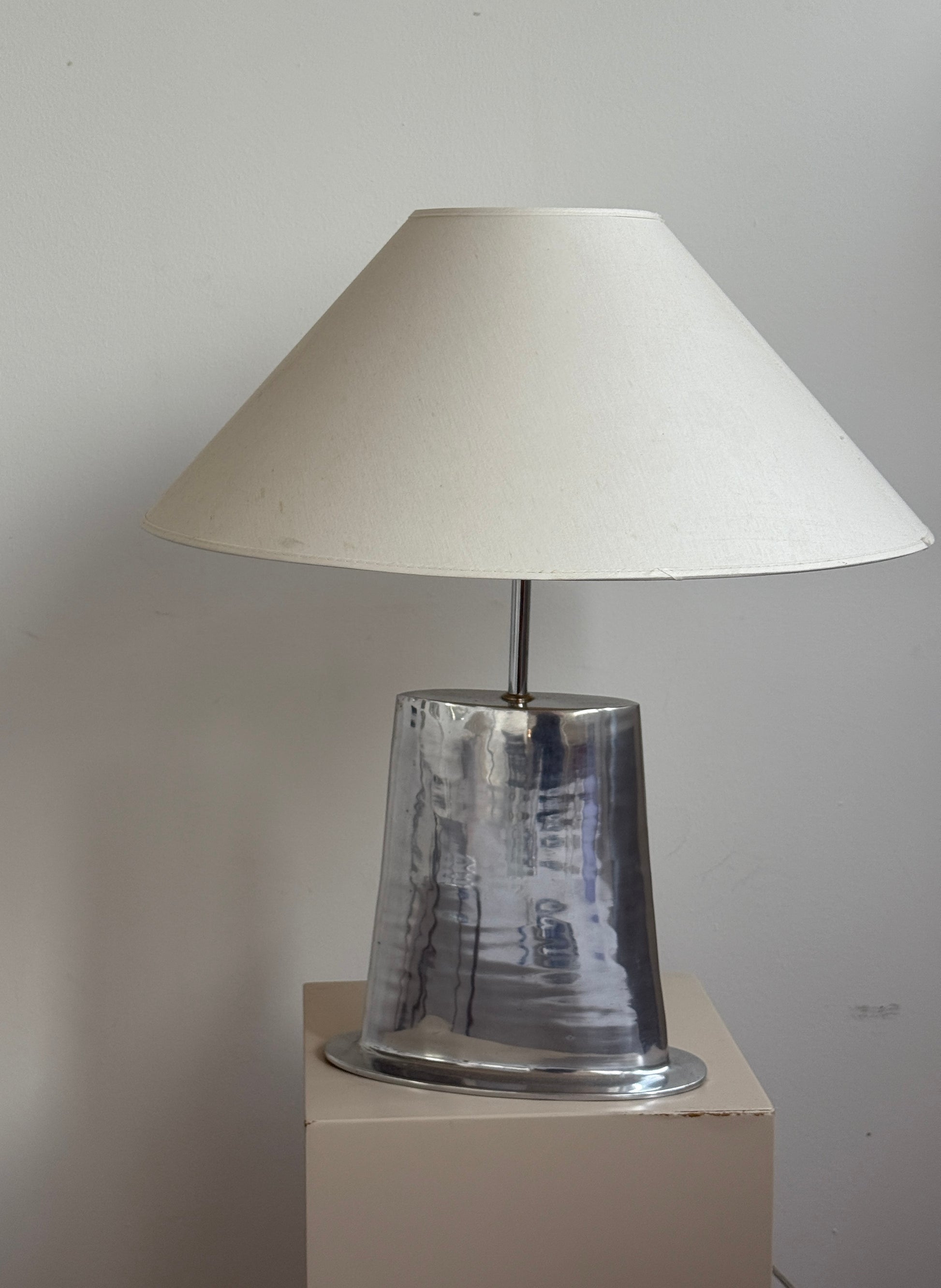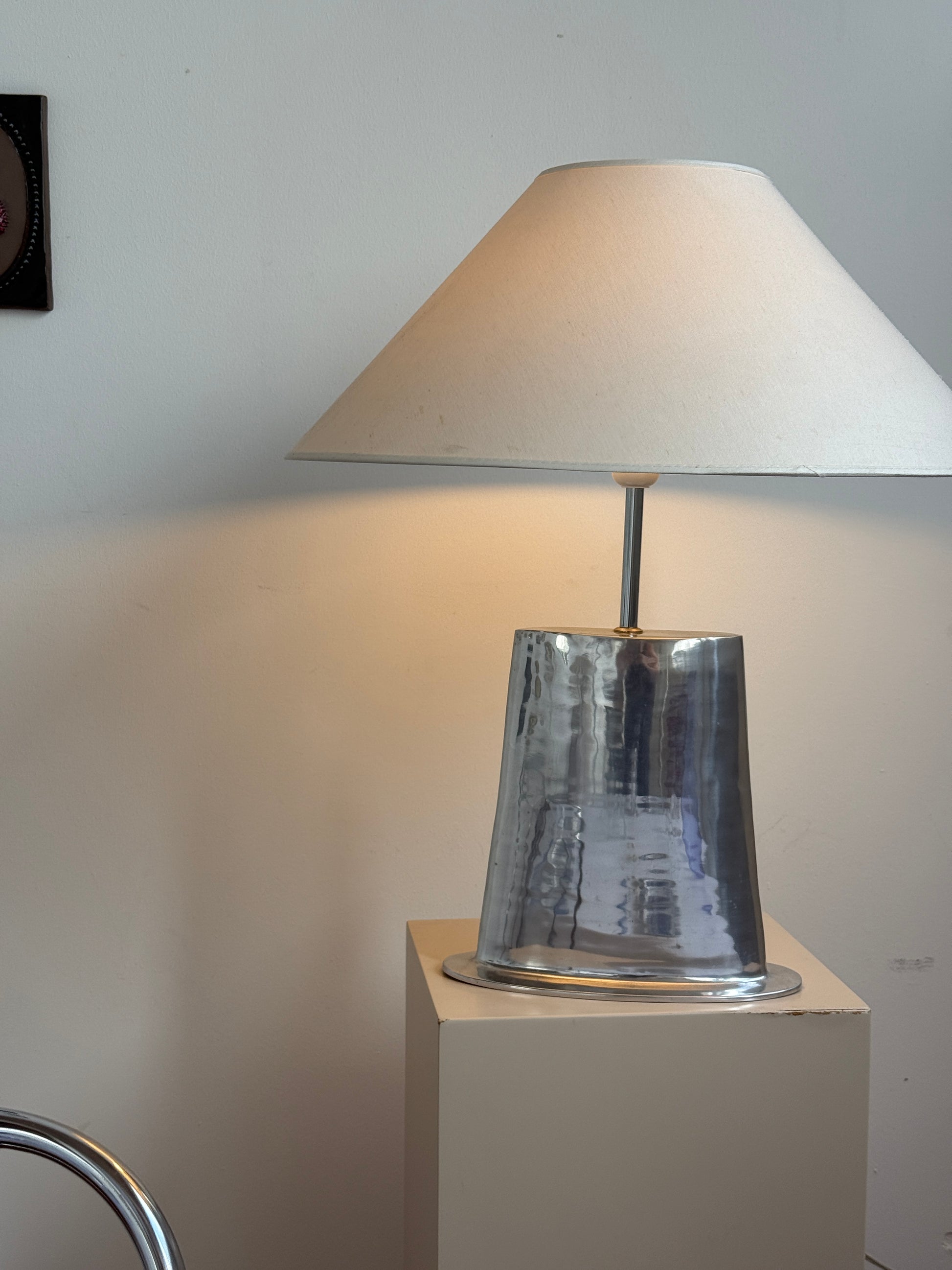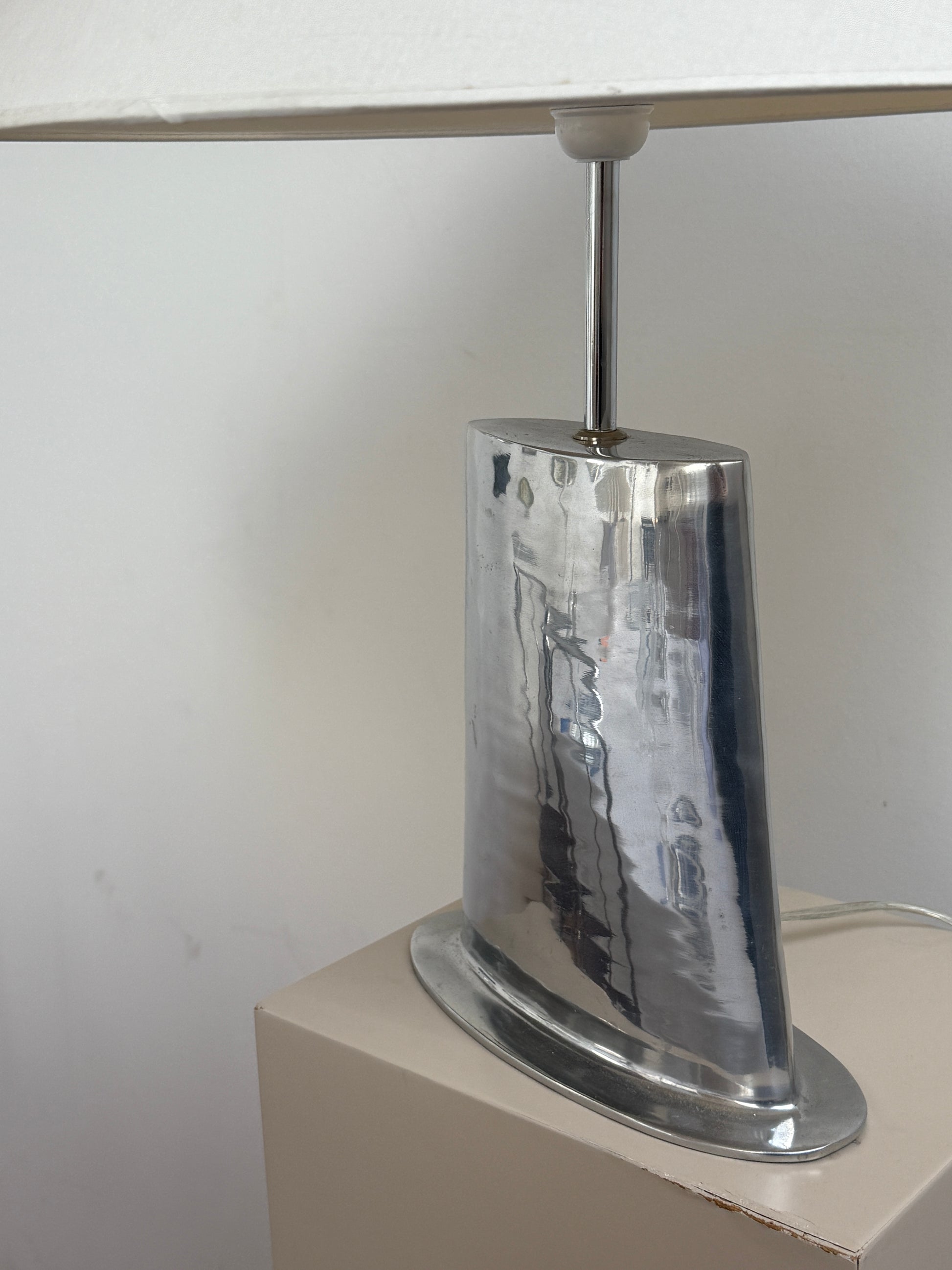 Elegant vintage bordlampe i aluminium med skulpturel fod. Lampens metalliske overflade reflekterer lyset smukt og gør lampen til et smukt objekt i indretningen.
