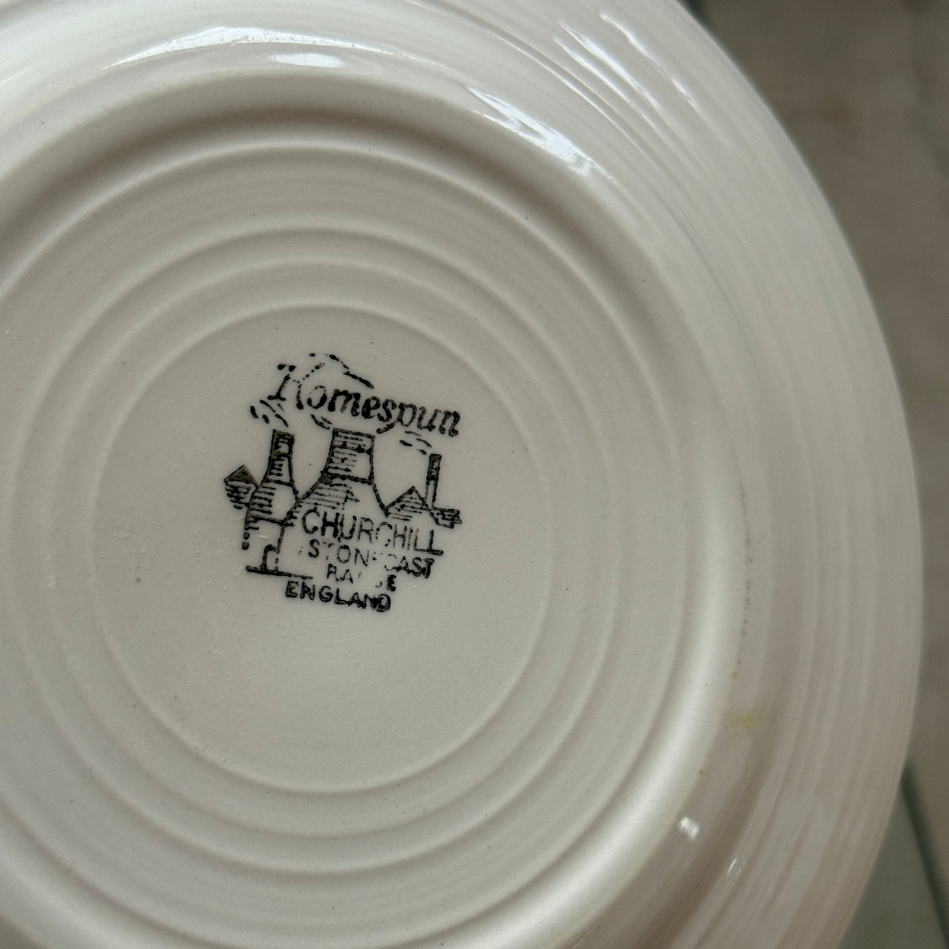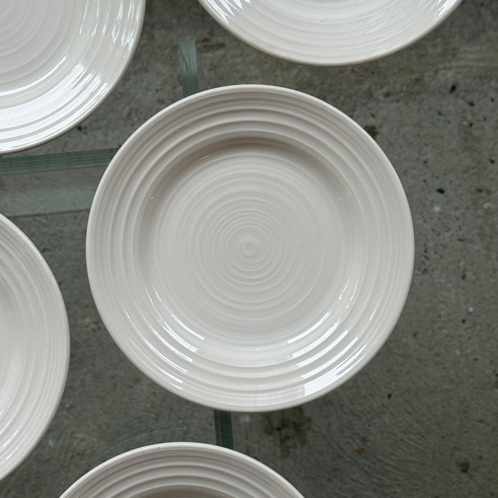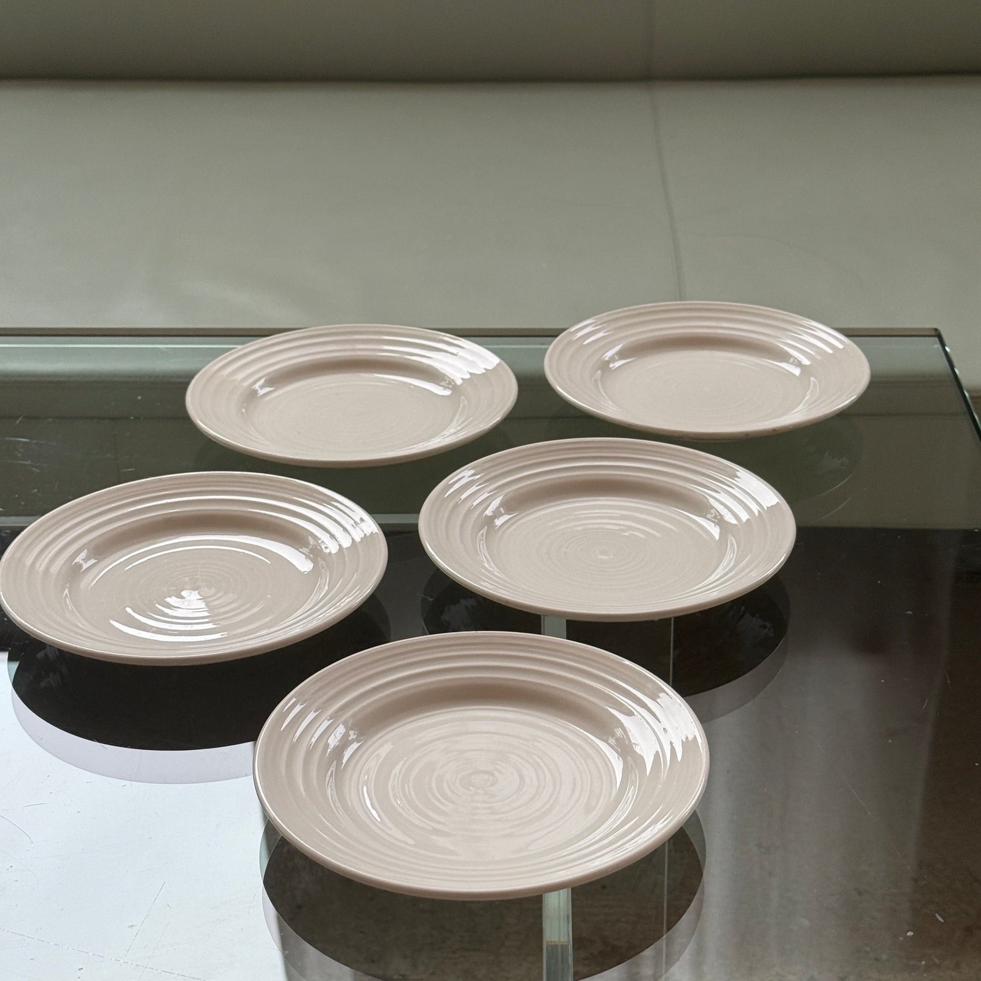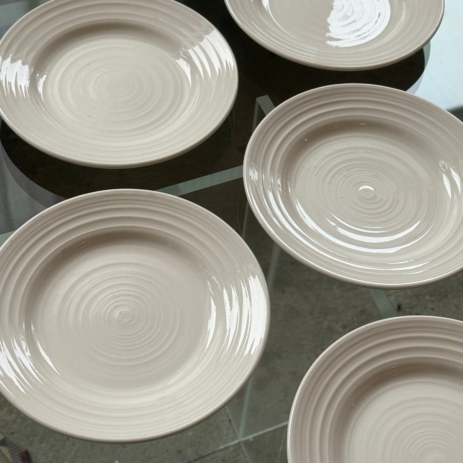 Sæt med 5 fine desserttallerkner i keramik fra Homespun produceret af Churchill, England. Tallerknerne har et enkelt og tidløst udtryk med det karakteristiske cirkulære relief, som giver overfladen liv og dybde uden at virke prangende.