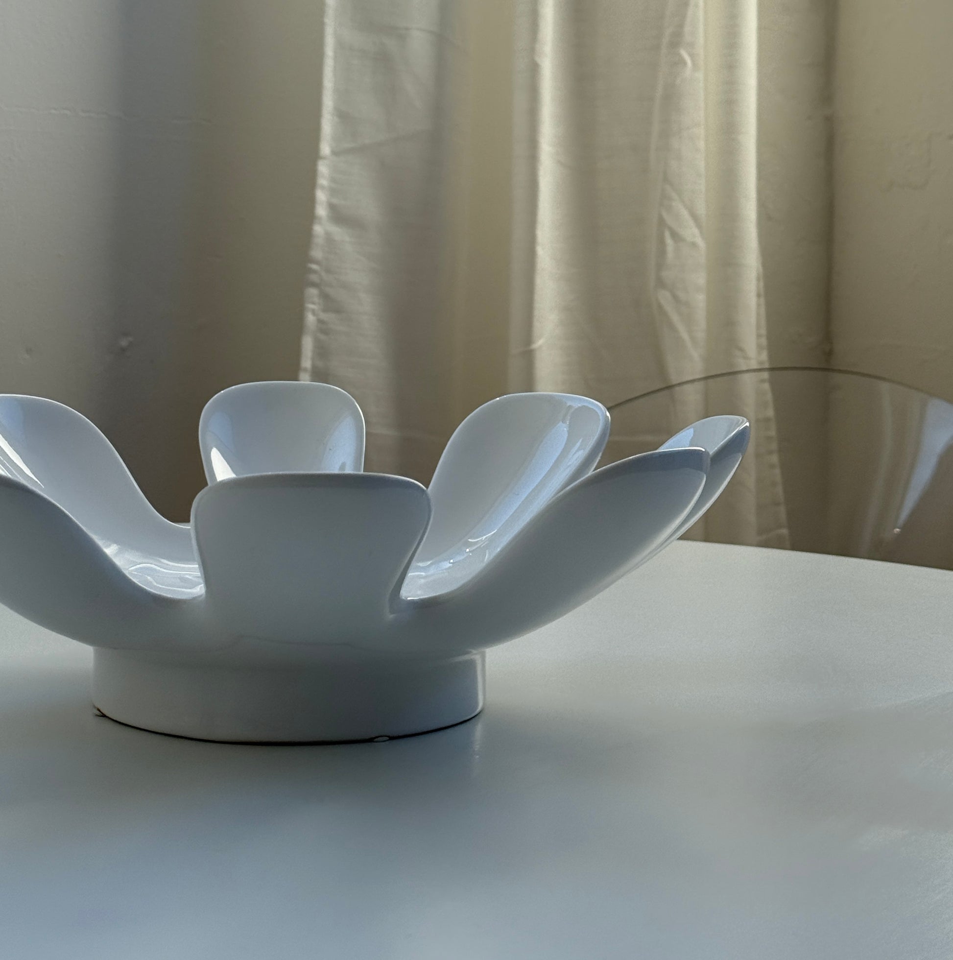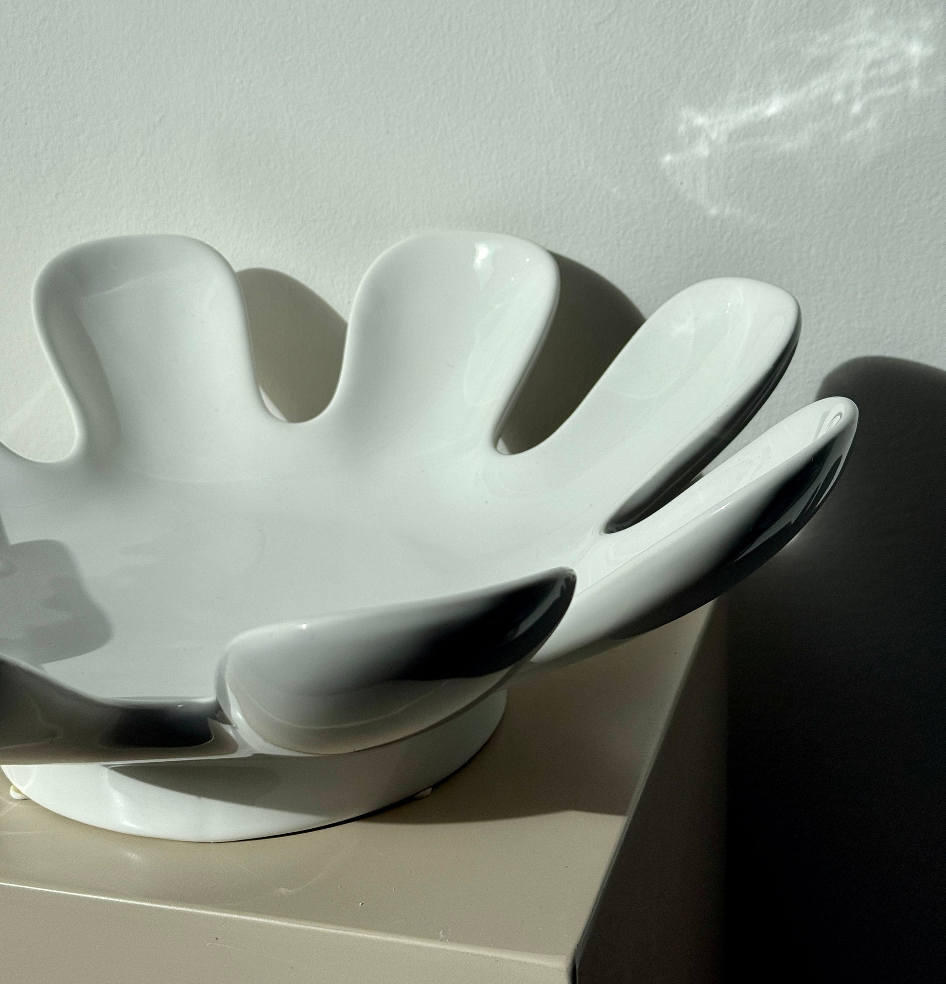 Stor symmetrisk skål med bølgede kanter, der giver associationer til blomsterblade eller en åben hånd. Skålen står på en lille fod, der løfter den let fra overfladen. Enkel, men skulpturel i sit udtryk.