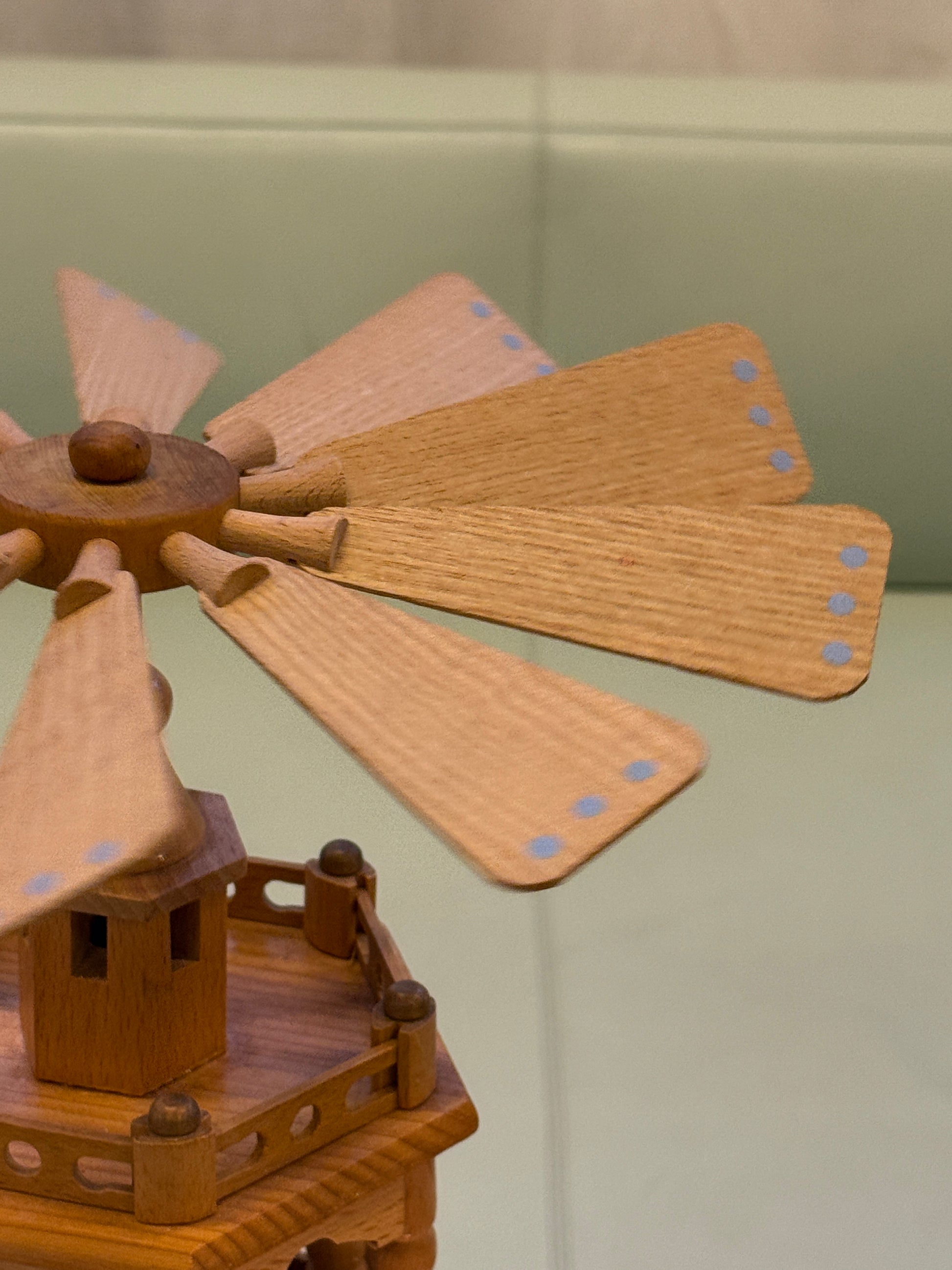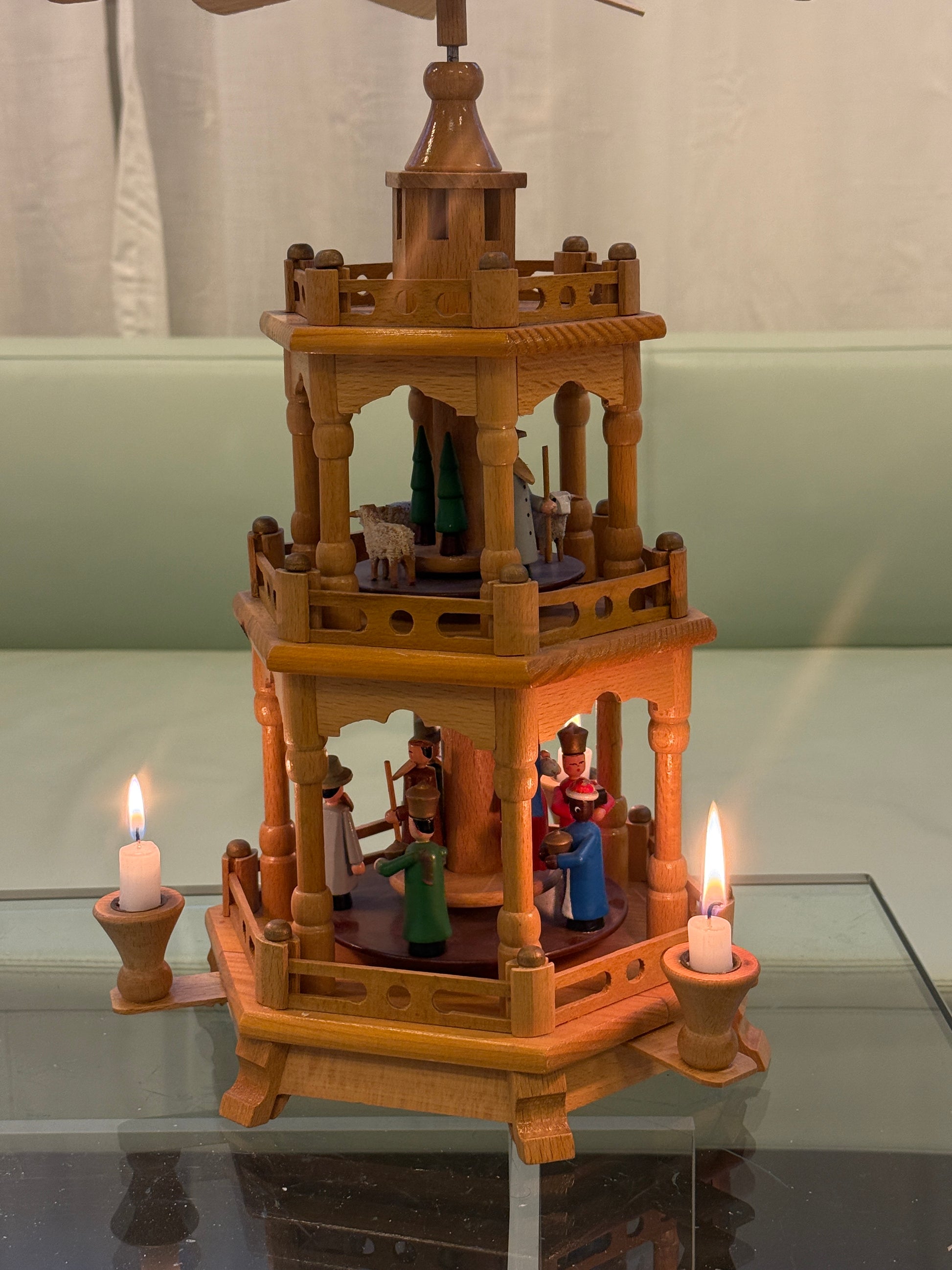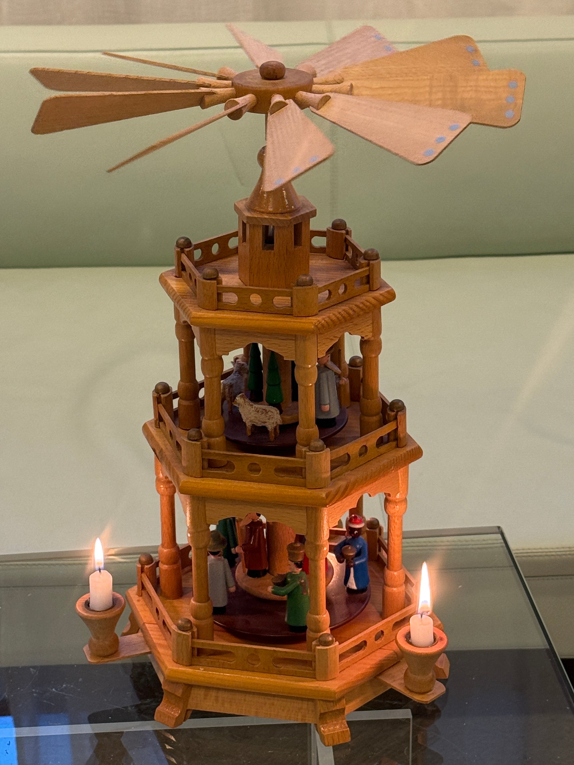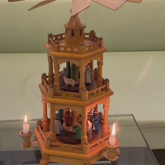 Smuk og klassisk Erzgebirge julepyramide i lyst træ med tre etager, fyldt med fine figurer i varme farver. Konstruktionen er detaljeret med drejede søjler, gitterværk og en stor propel med lyseblå prikker, som skaber et charmerende udtryk, når pyramiden roterer.