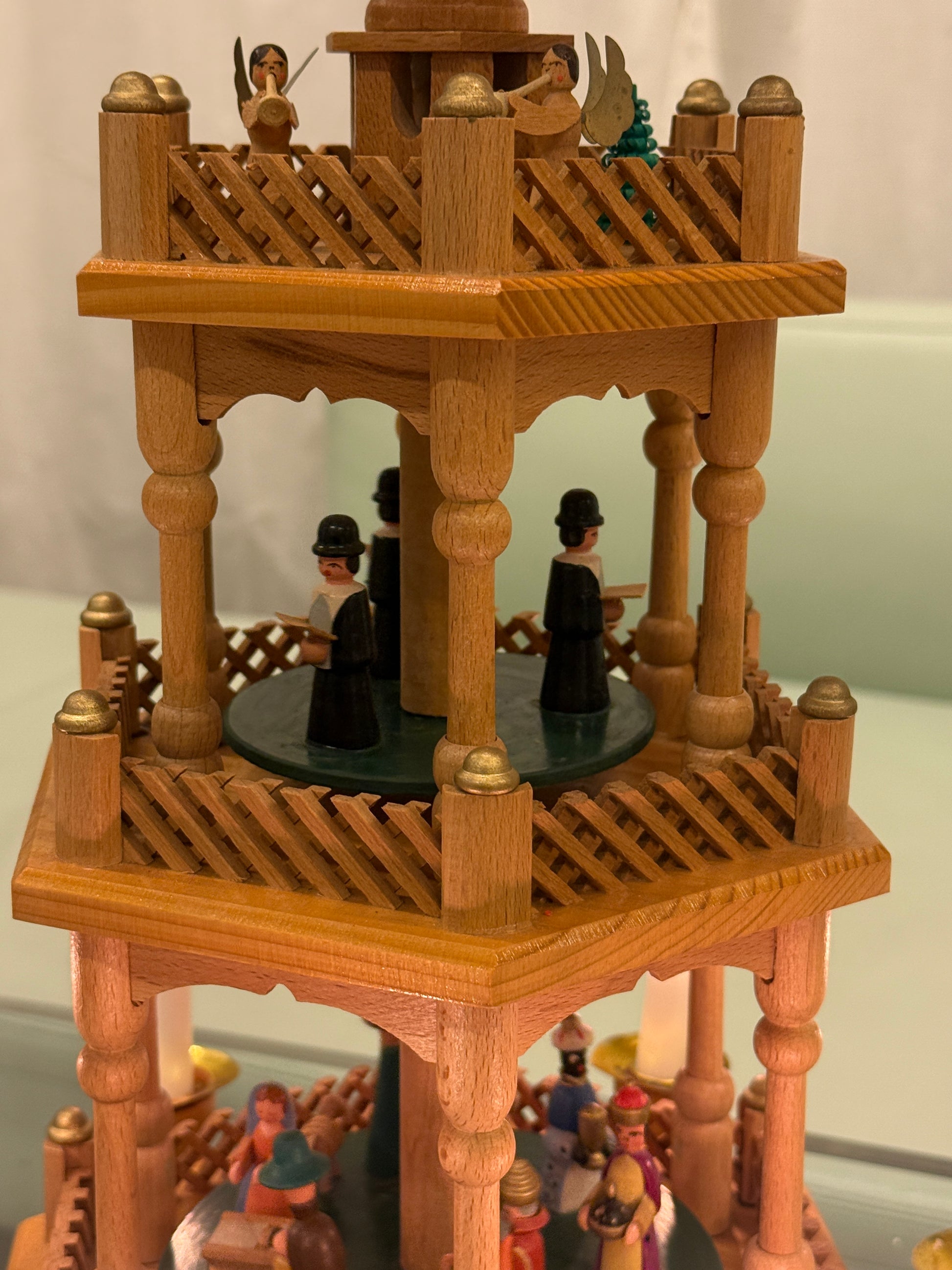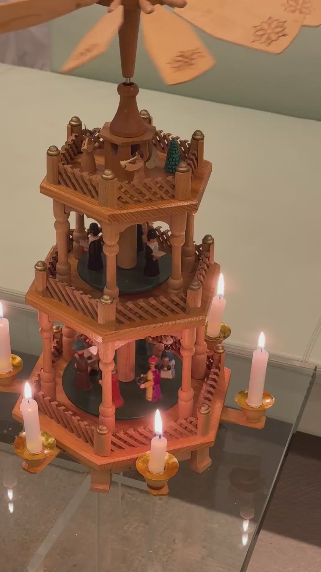 Smuk og autentisk Erzgebirge julepyramide i træ med tre etager, udført i den klassiske tyske håndværkstradition. De drejede søjler, fine gelændere og håndmalede figurer giver den et varmt og traditionelt udtryk, mens den store propel med udskårne stjernemotiver skaber et smukt lys- og skyggespil, når pyramiden roterer.