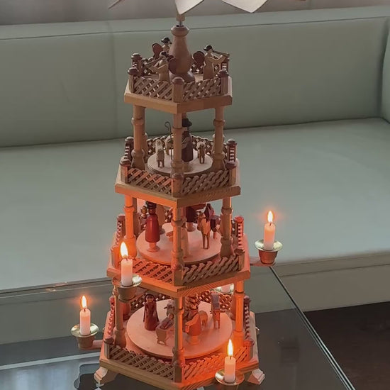 Stor og imponerende original Erzgebirge-julepyramide/karrusel i fantastisk stand. Denne model er et af de mere eftertragtede stykker traditionelt tysk træhåndværk – udført i smukt lyst træ med fire etager fyldt med håndskårne figurer.