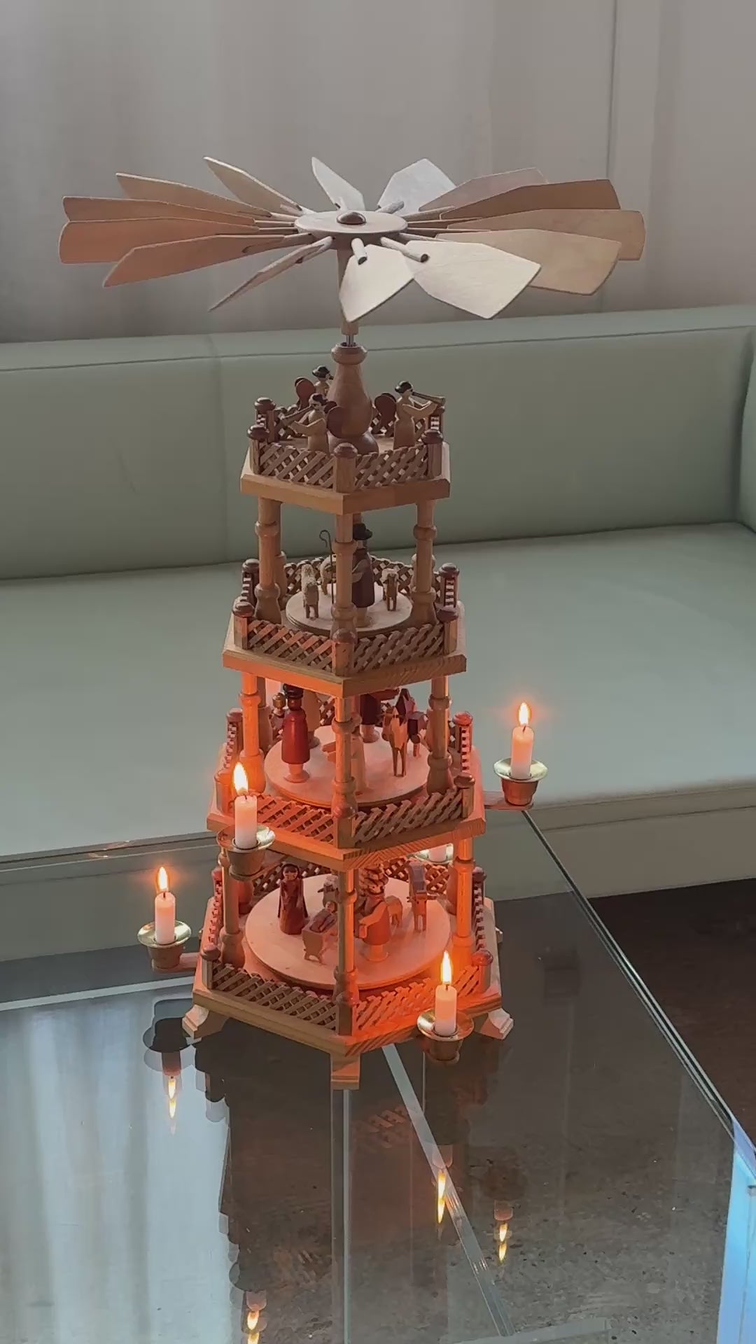 Karrusellen drives af lysets varme, som får propellen til at snurre roligt rundt og skabe den helt klassiske julehygge. Designet har de karakteristiske Erzgebirge-detaljer: drejede søjler, fine gelændere og figurer med smukt, enkelt udtryk.