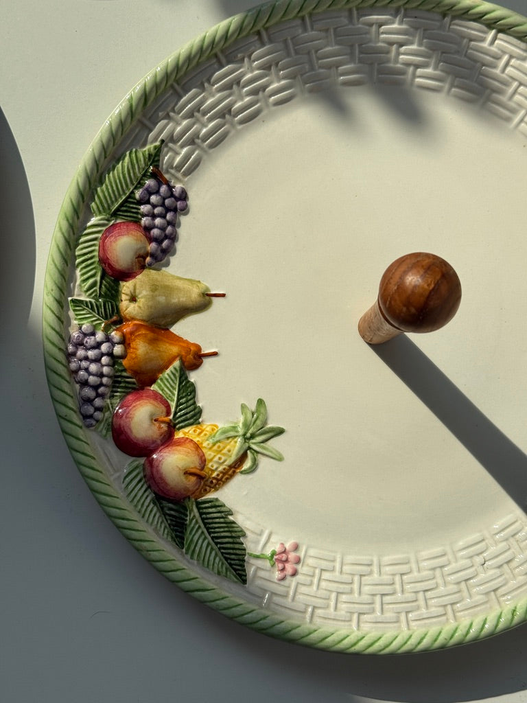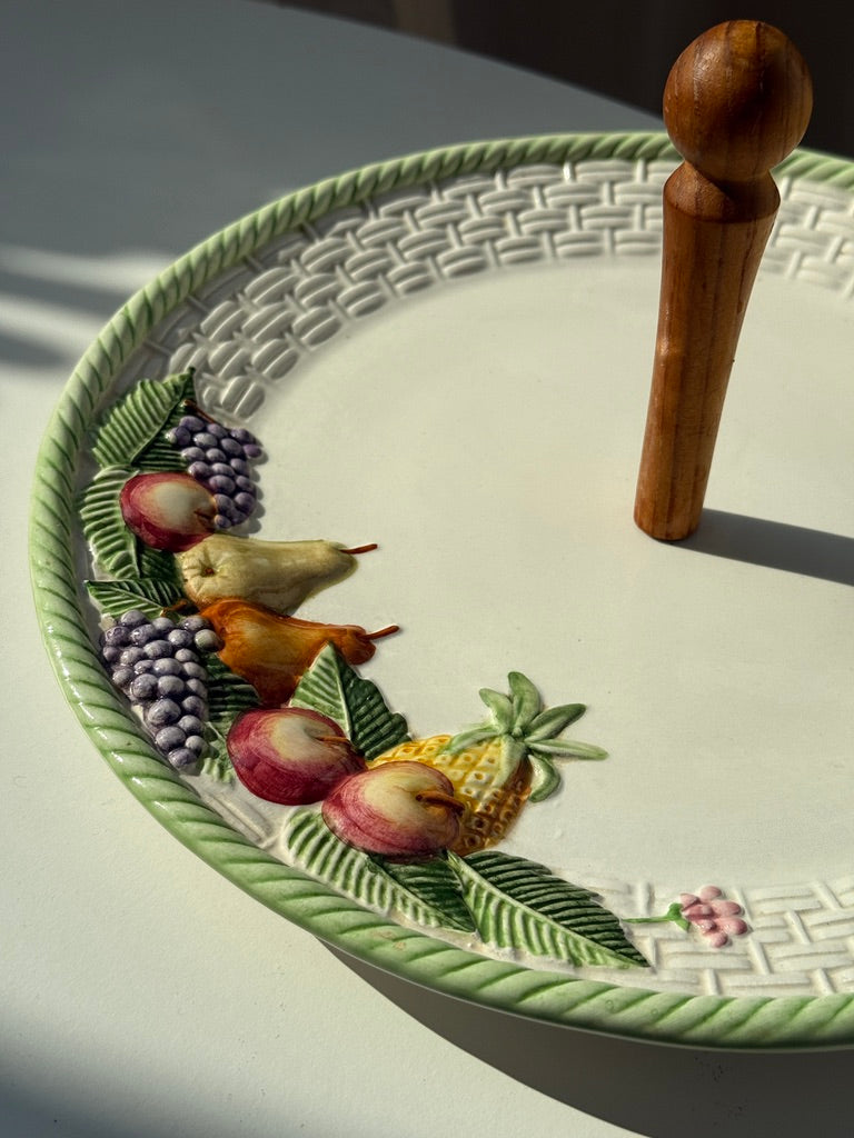 Fajance fad med en skøn grøn kant, frugtmotiver i den ene side og et håndtag i træ.