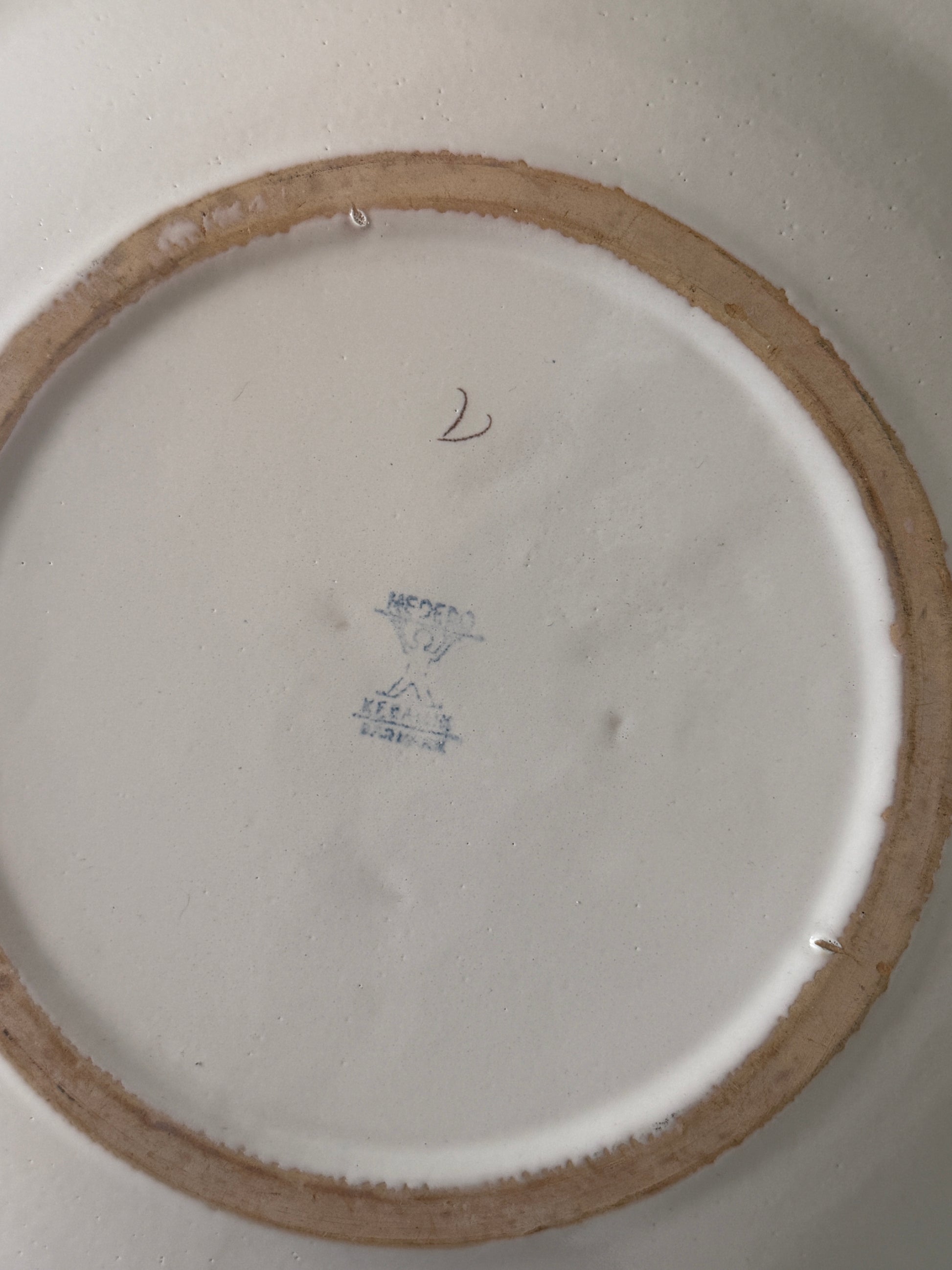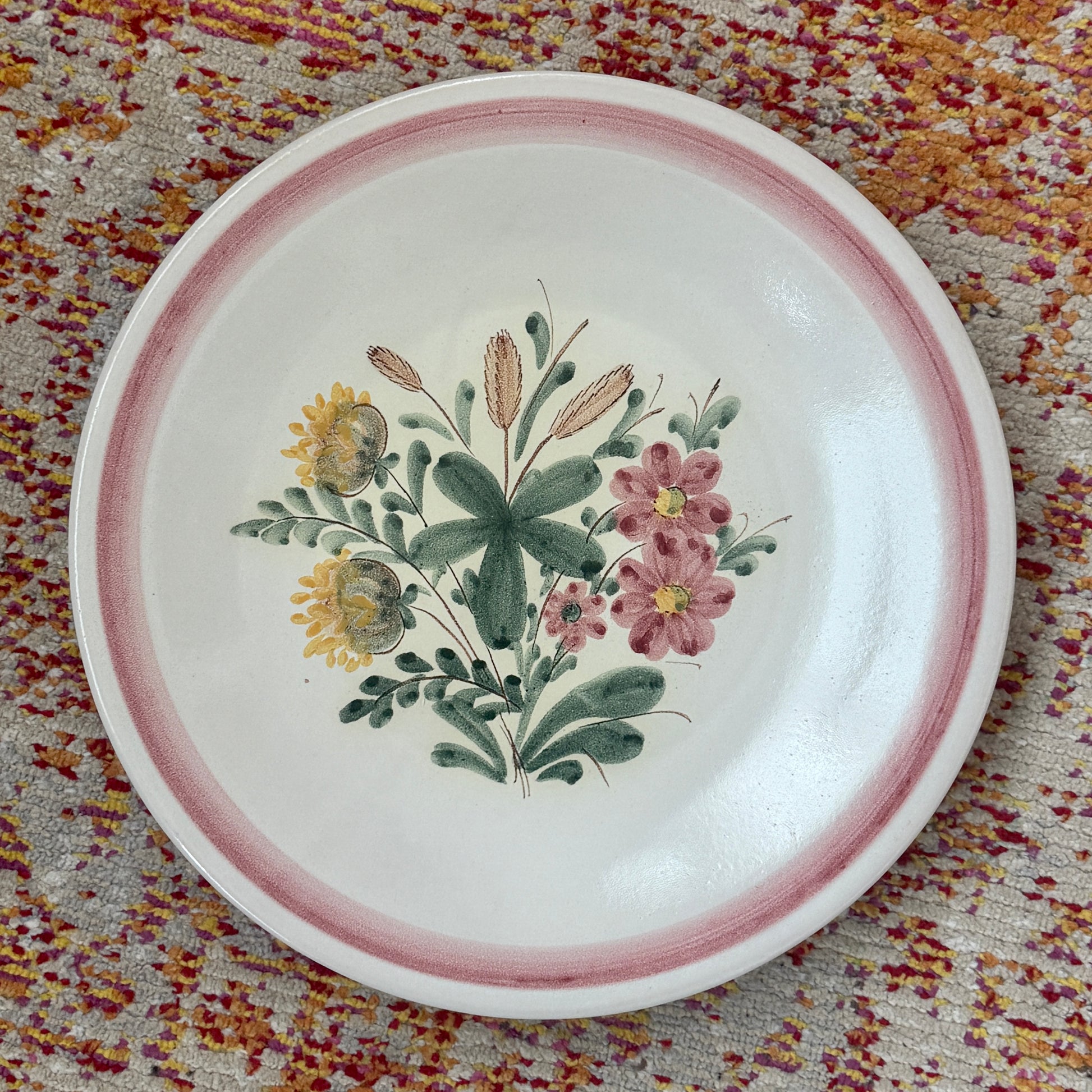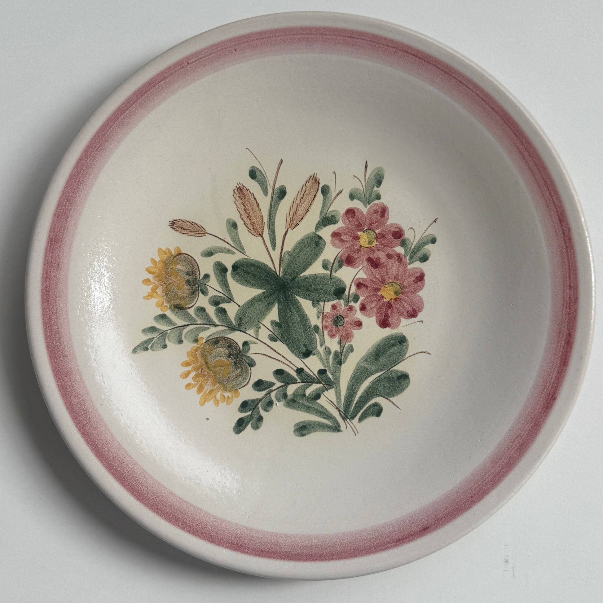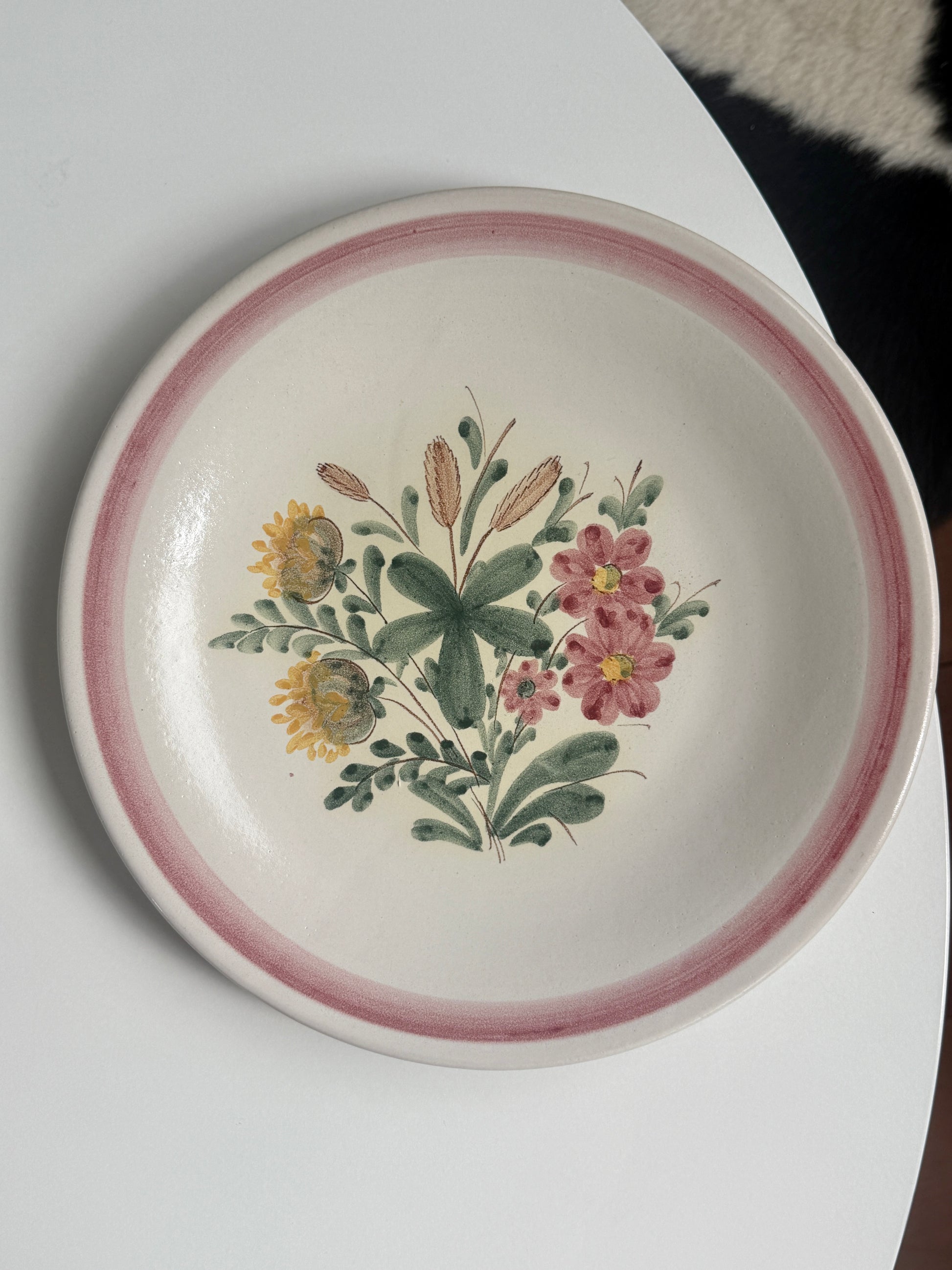Keramiktallerken/fad fra danske Hedebo. Håndmalet blomstermotiv i rosa, gul og grønne nuancer, med rosa kant hele vejen rundt. Traditionelt dansk stentøj med charme og nostalgi.