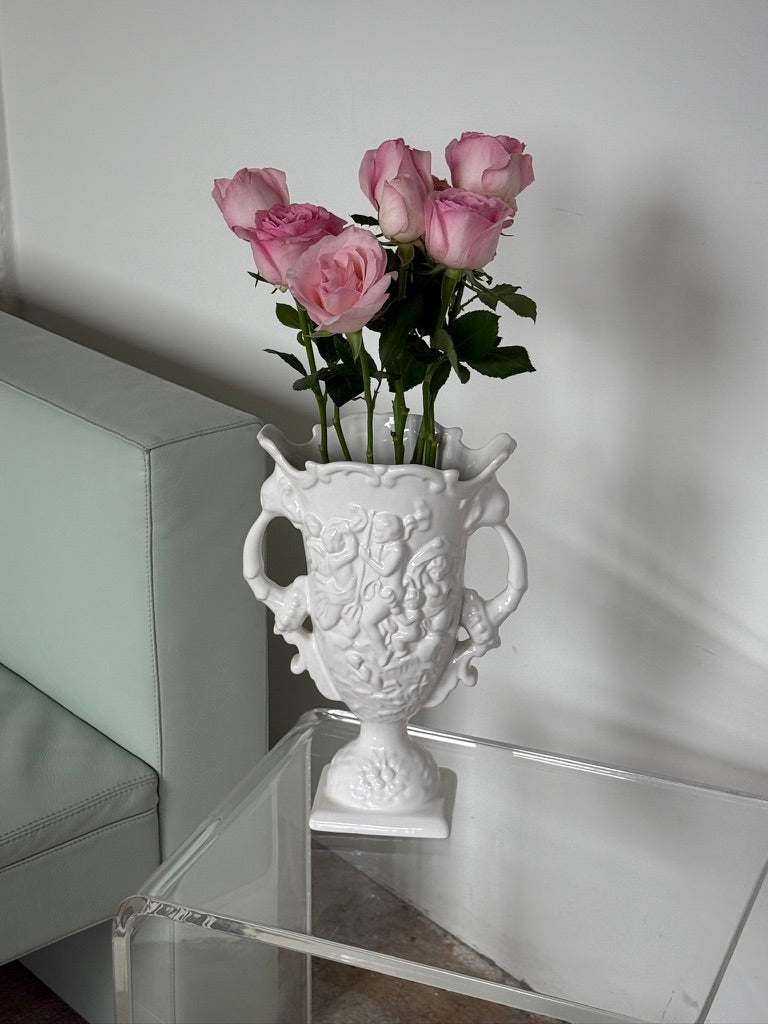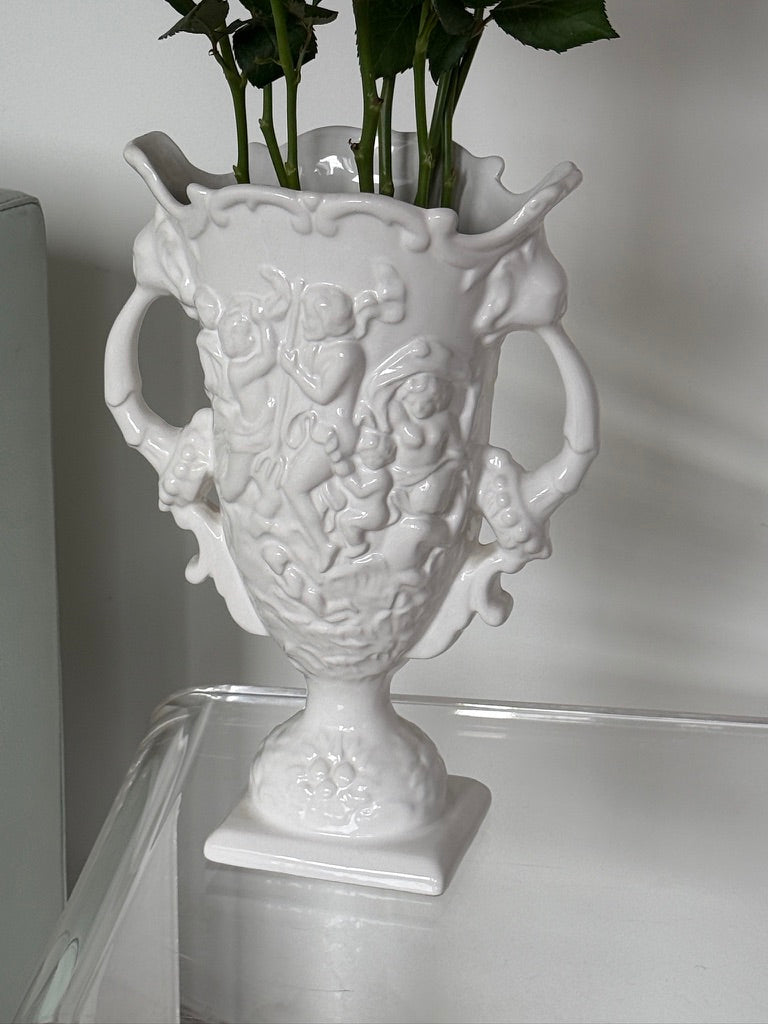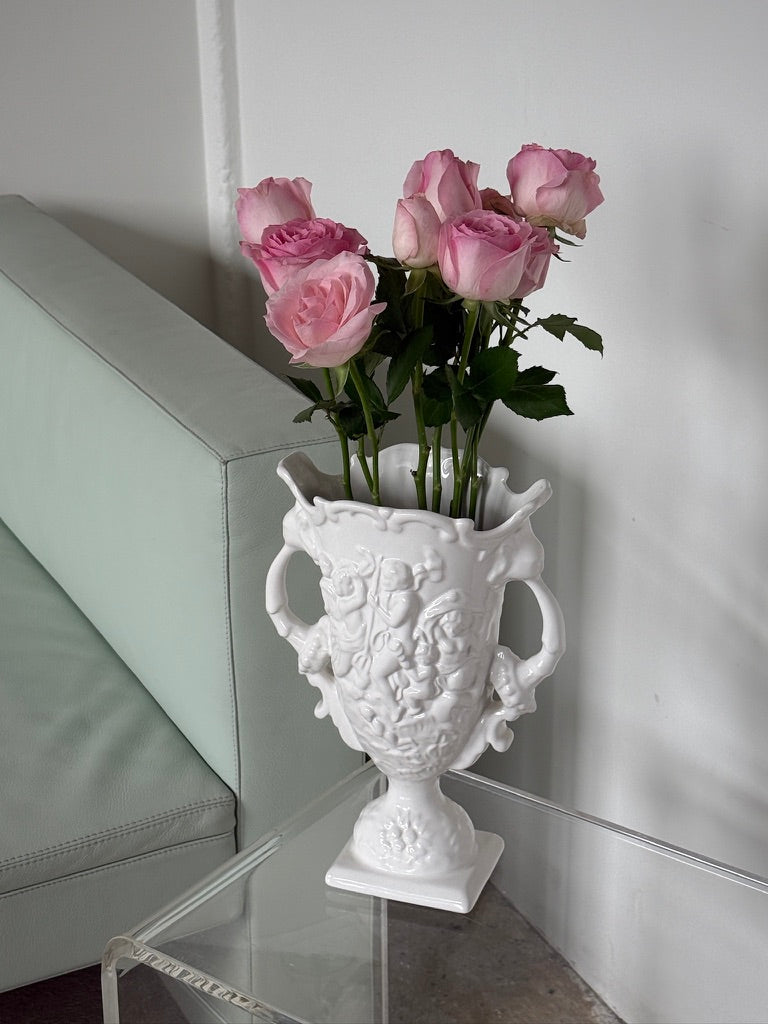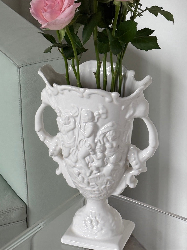 Smuk vase i hvid fajance med detaljerede relieffer og dobbelte hanke. Vasen har et klassisk og dekorativt udtryk, der gør den oplagt både til blomster og som et skulpturelt element i indretningen. De bløde former og det blanke glasurspil giver et elegant vintage-look.