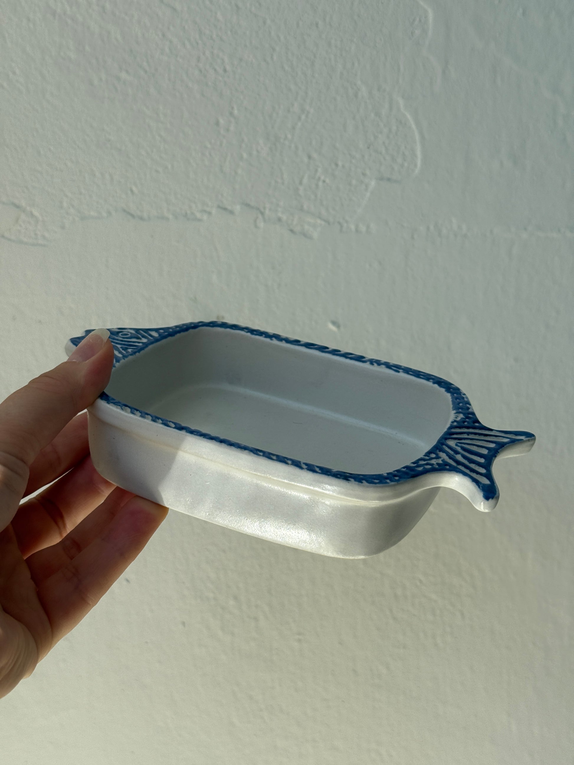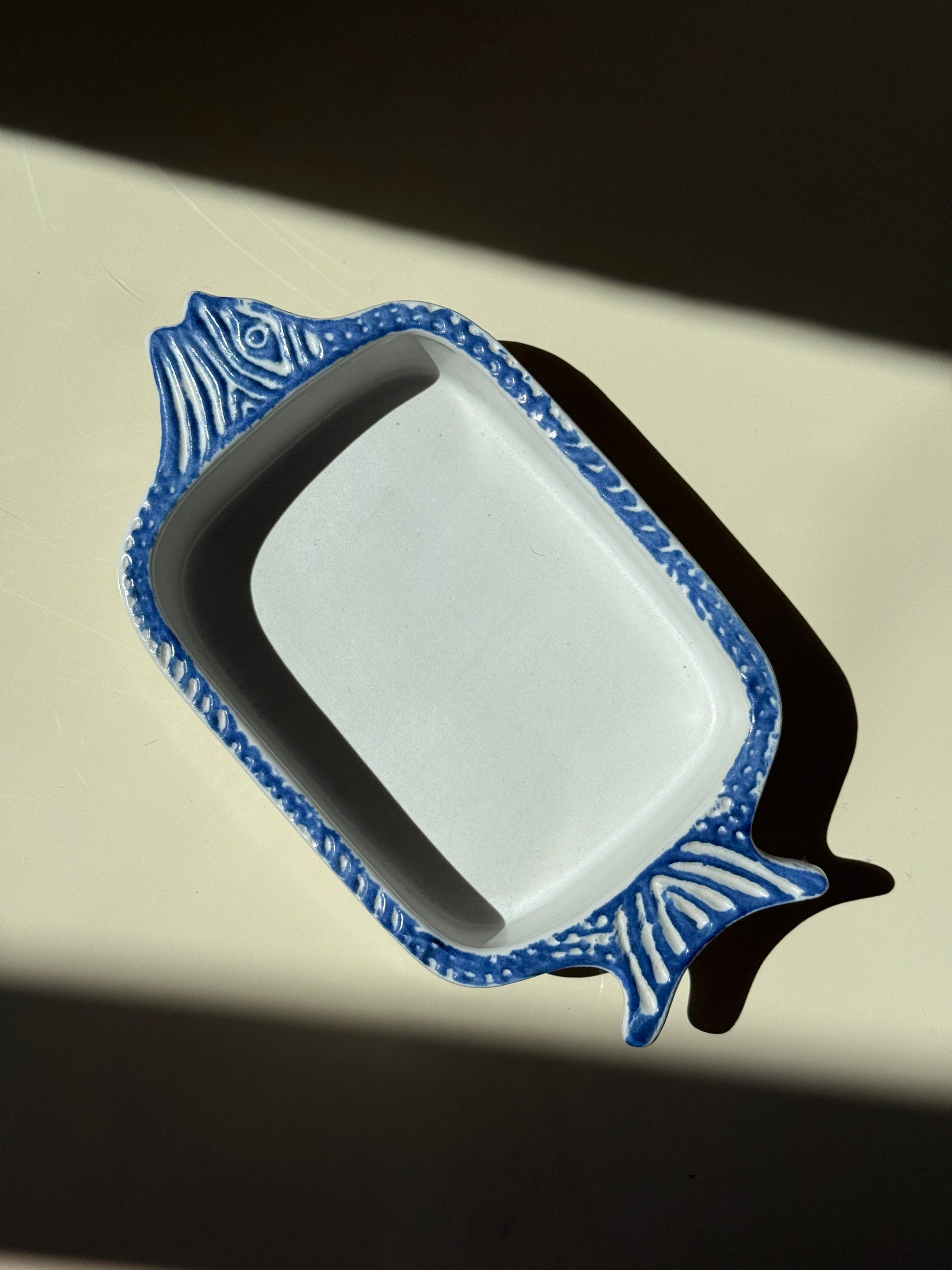 Fin lille stentøjsskål udformet som en fisk, med blå dekoration langs kanten og præget hoved og hale. Skålen er stemplet “Germany” i bunden og har en charmerende vintage-feel med sin enkle farvesammensætning og legende form.
