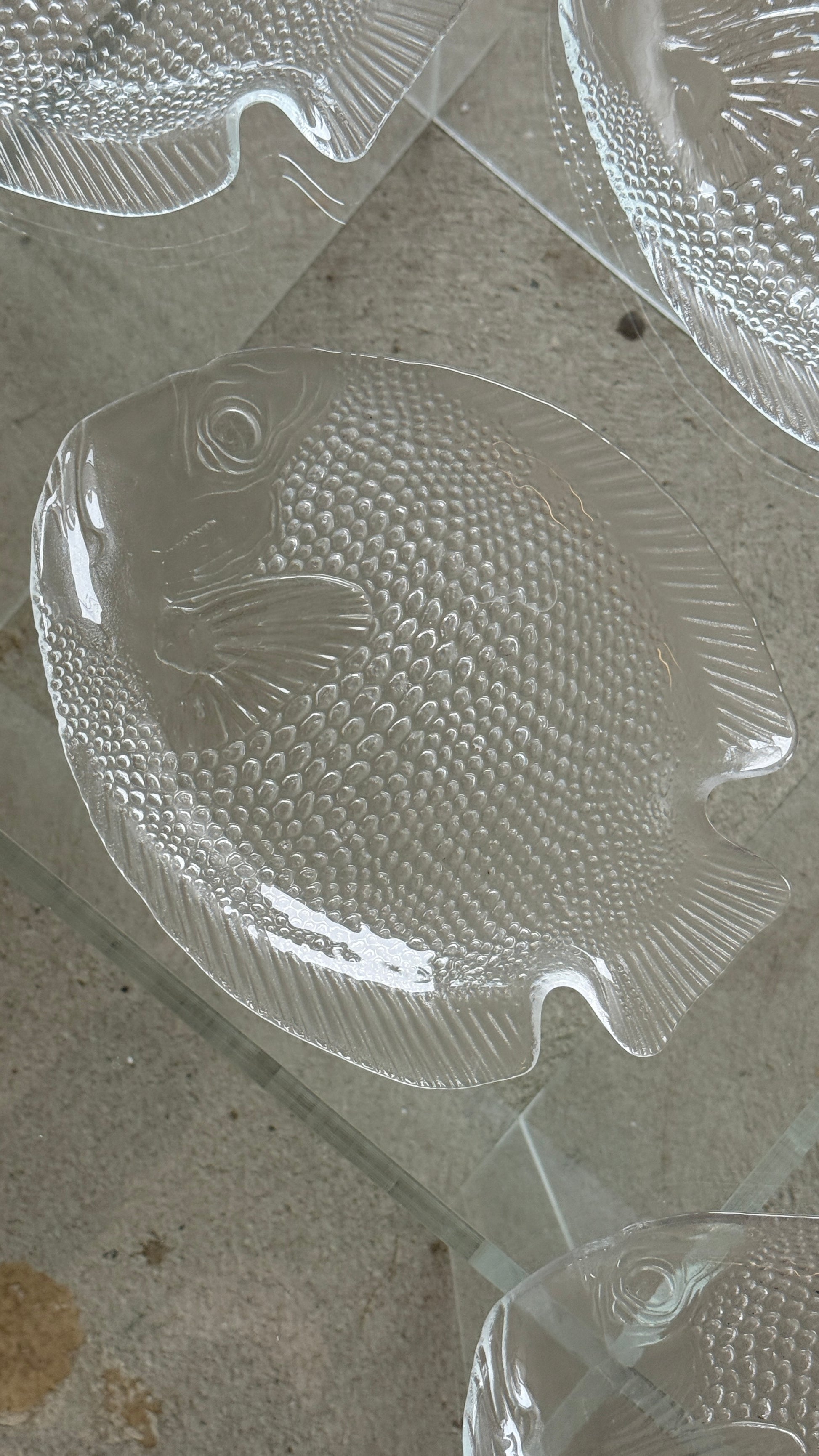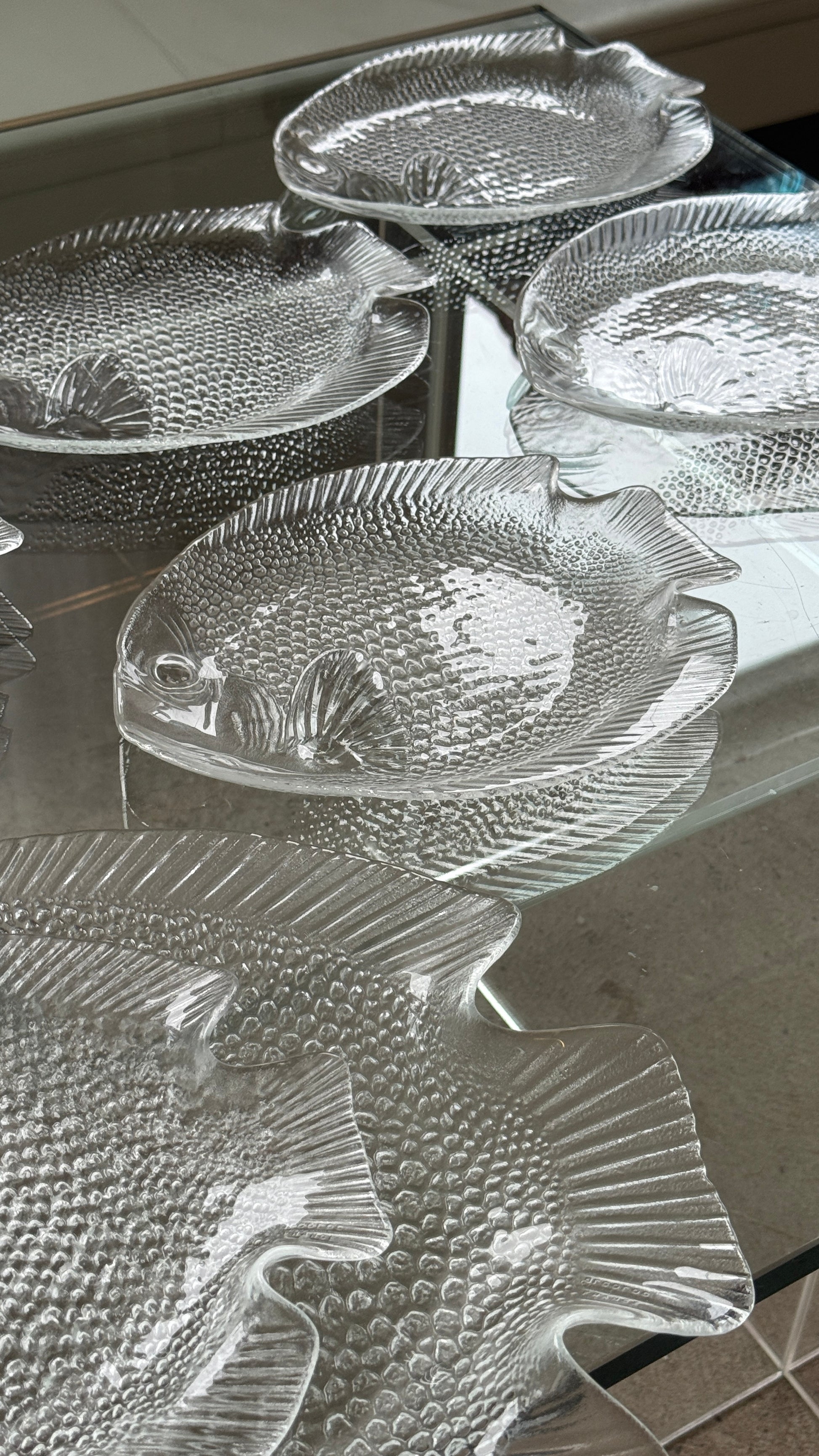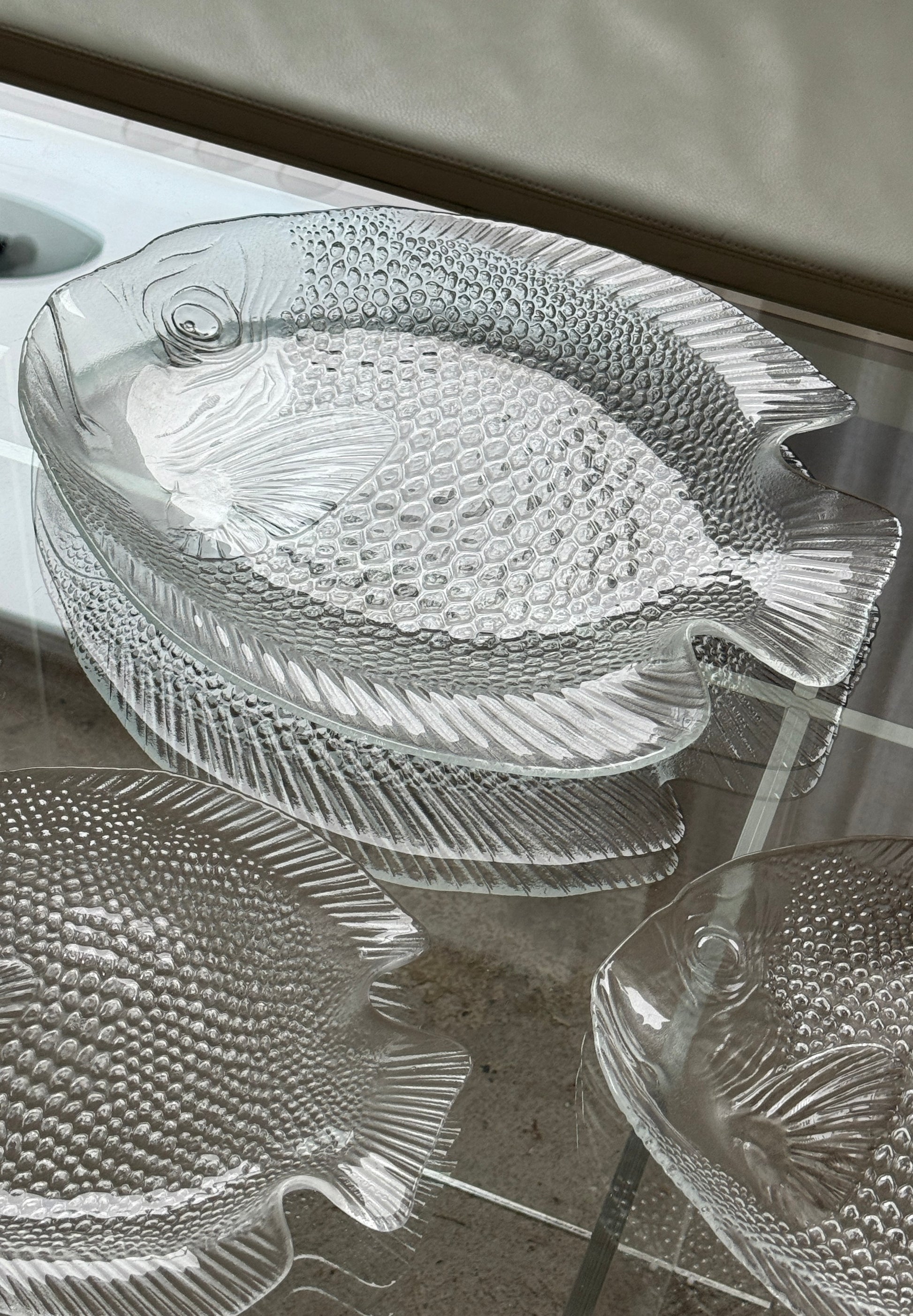 Dekorative glasfade formet som fisk med smukt detaljeret overflade, hvor skæl, finner og øje er fint fremhævet i det klare glas. Et legende og klassisk design, der leder tankerne hen på sommer, servering og lange middage.