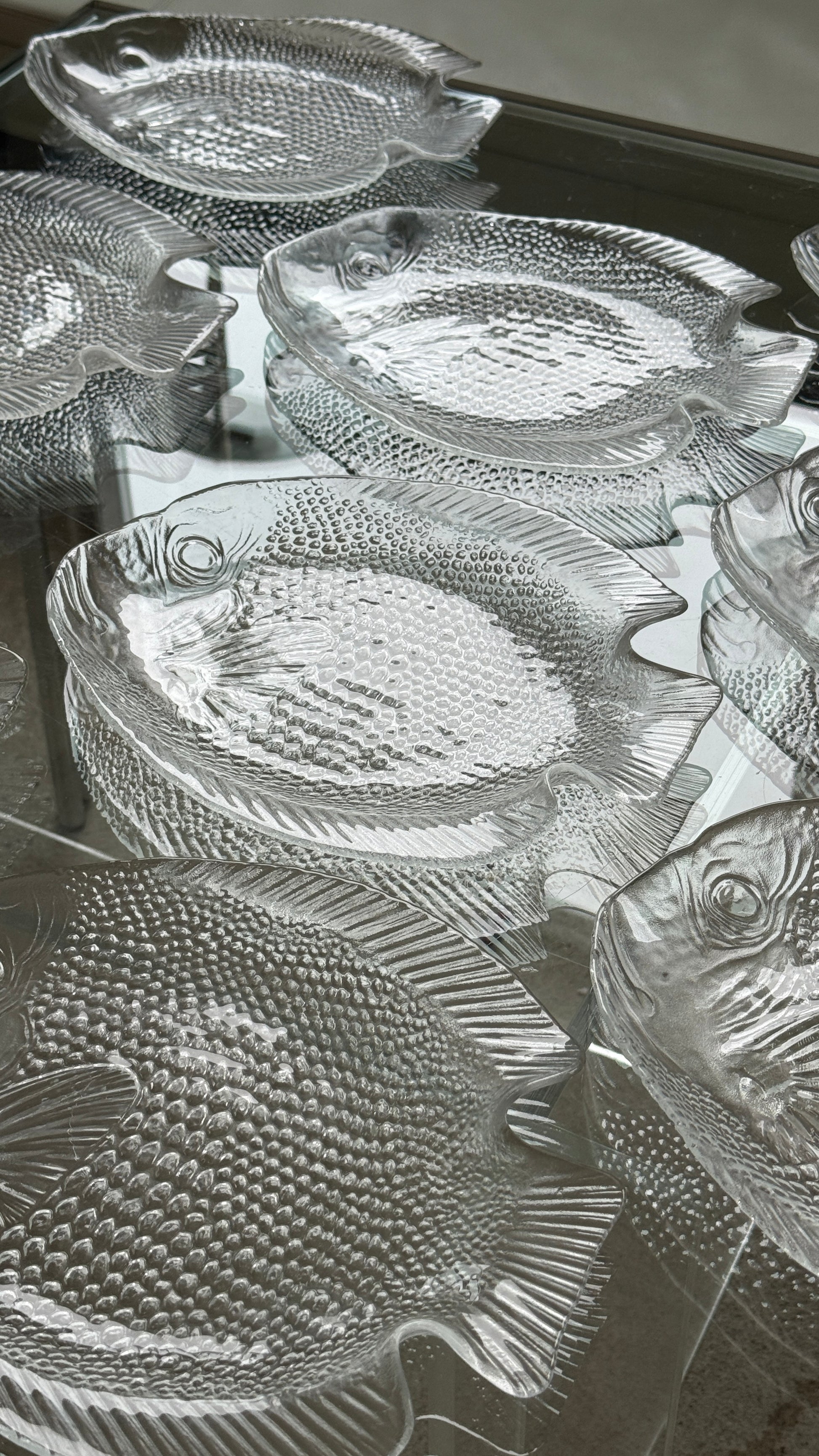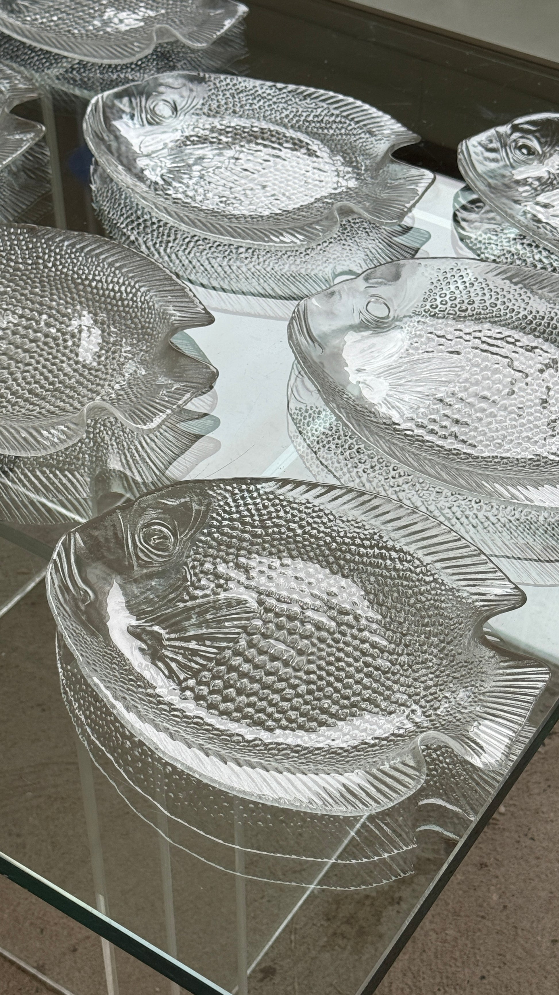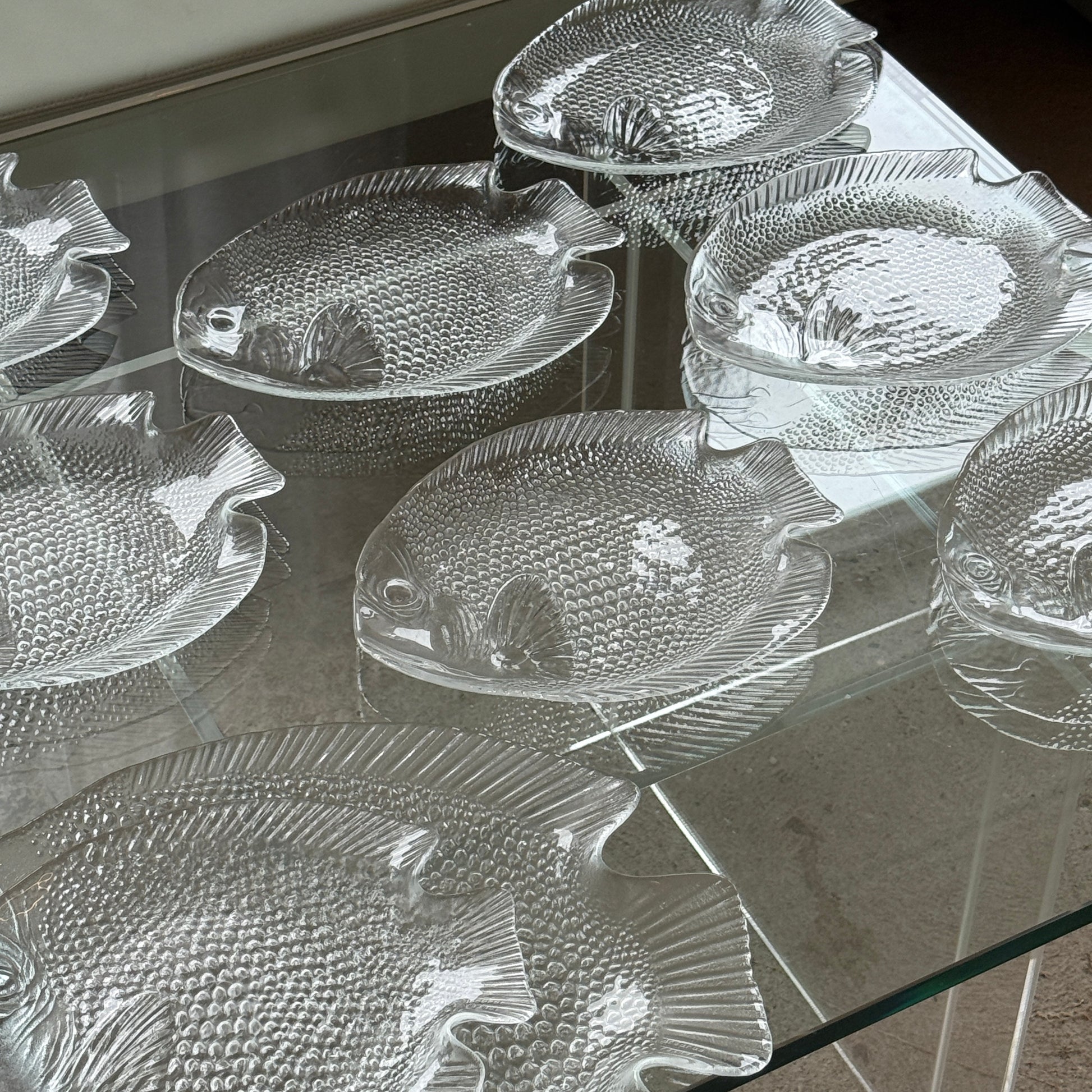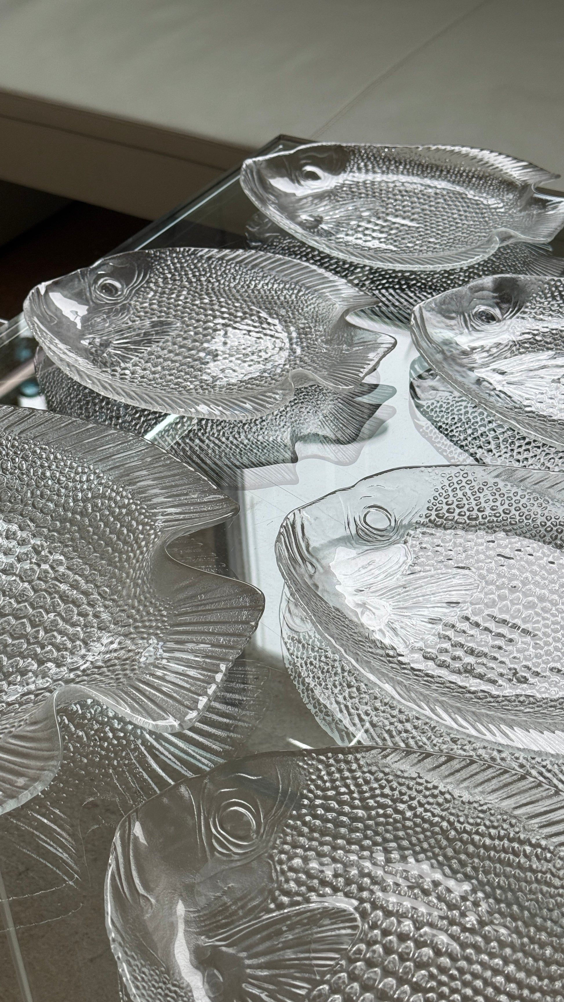 Dekorative glasfade formet som fisk med smukt detaljeret overflade, hvor skæl, finner og øje er fint fremhævet i det klare glas. Et legende og klassisk design, der leder tankerne hen på sommer, servering og lange middage.