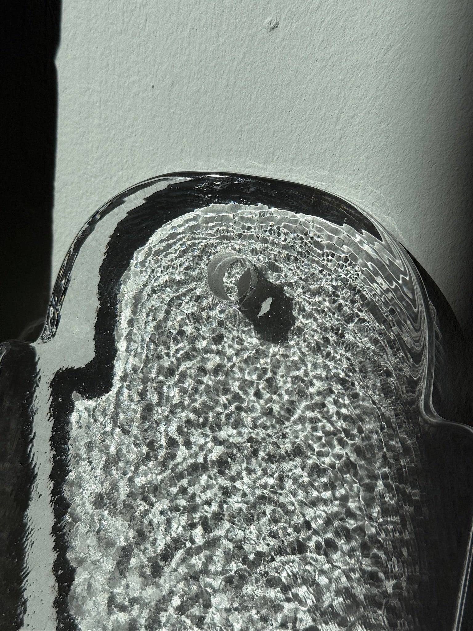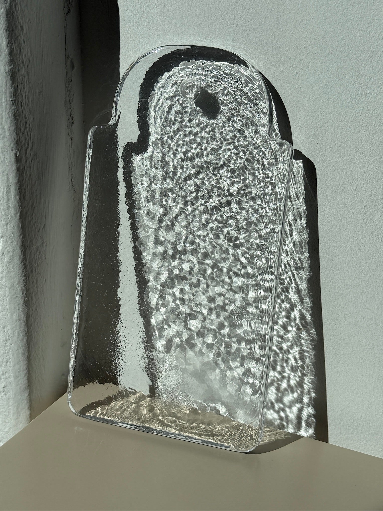 Smukt og unikt skærebræt i glas med en let bølget overflade, der reflekterer lyset smukt. Perfekt til servering af ost, tapas eller som et dekorativt element i køkkenet. Har små skår omkring ophængshullet, men dette påvirker ikke funktionaliteten.