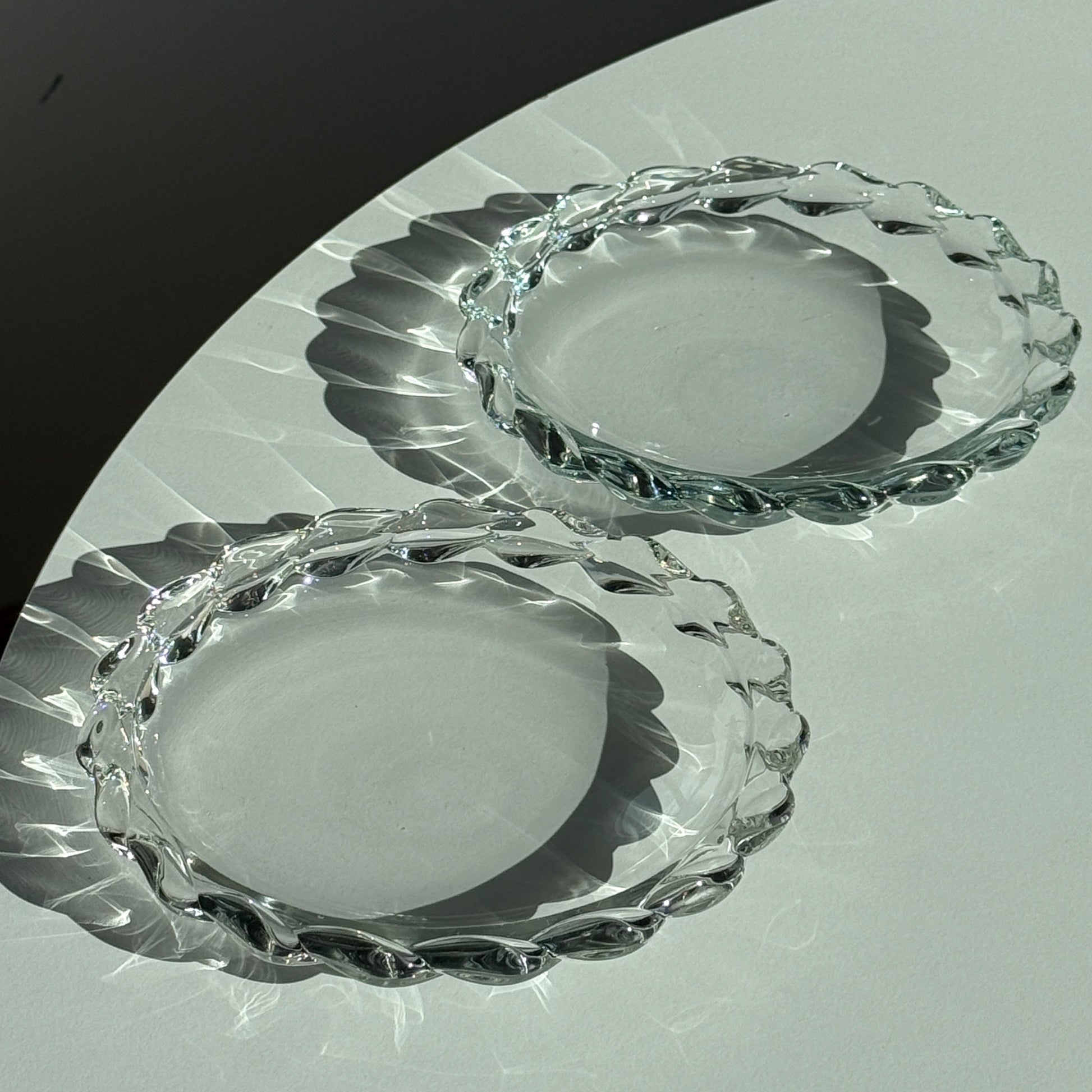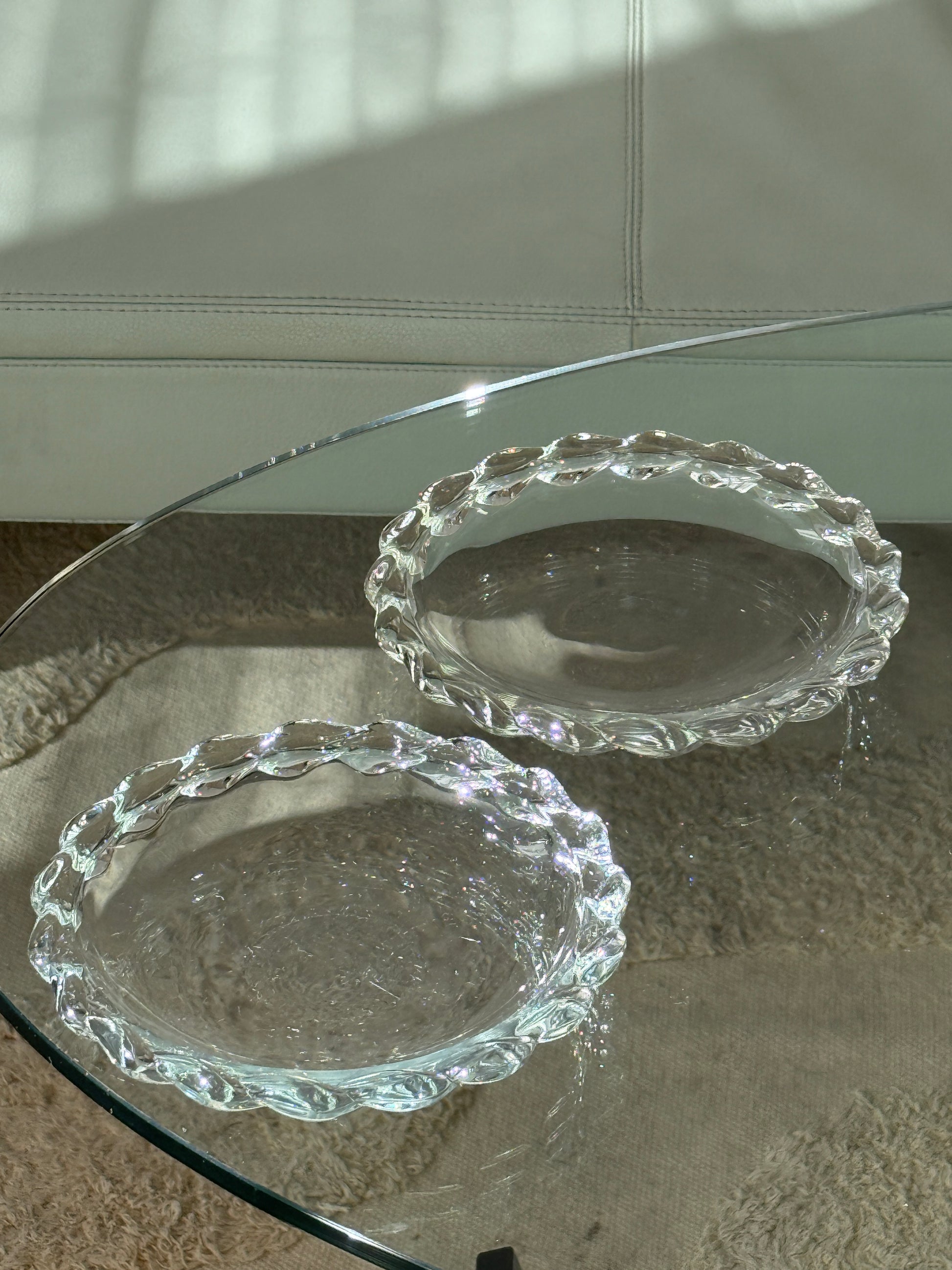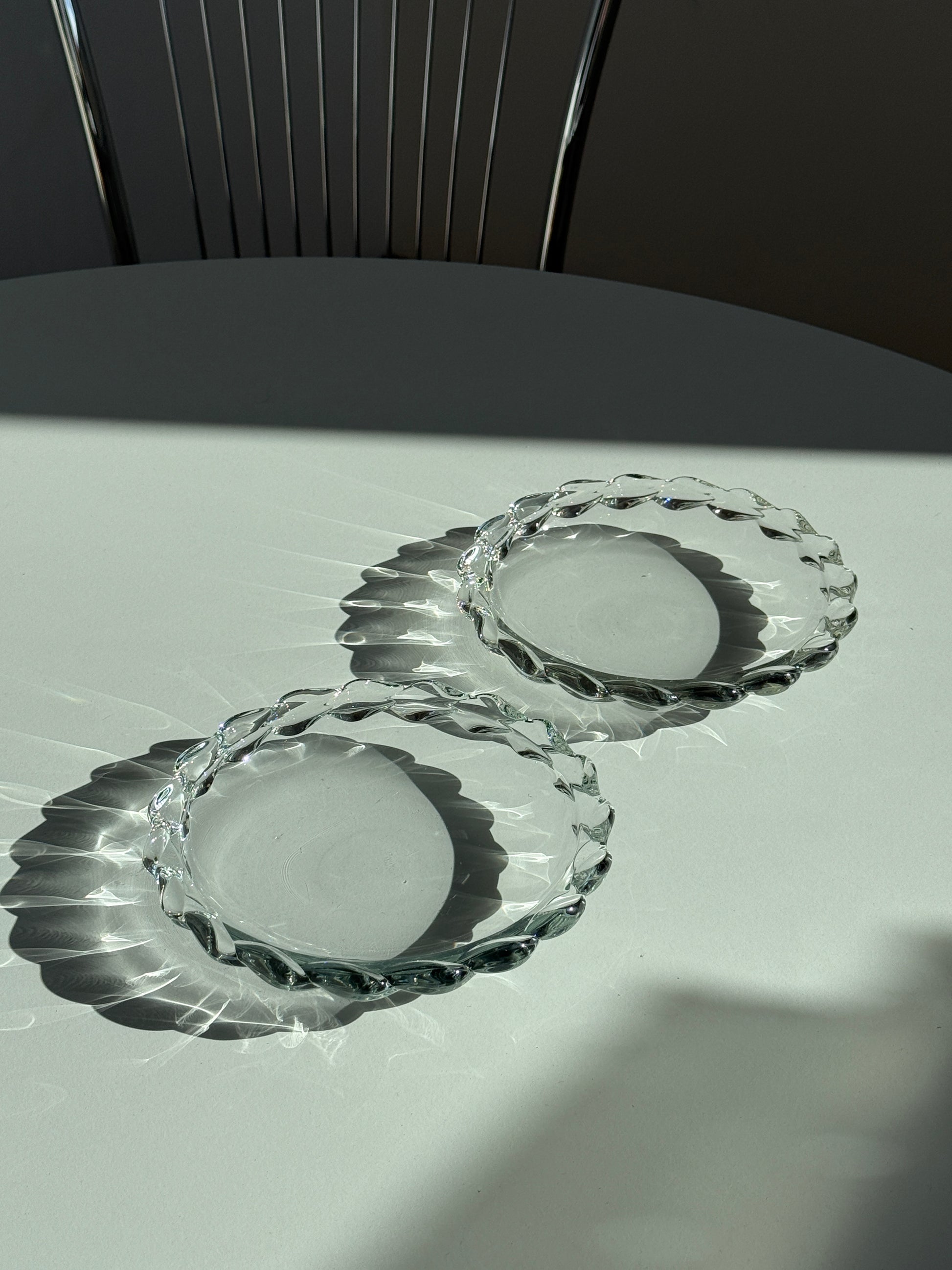 To smukke vintage platter i klart glas med elegant, tvistet kant. De enkle, runde former kombineret med den detaljerede kant giver et sofistikeret og tidløst udtryk.