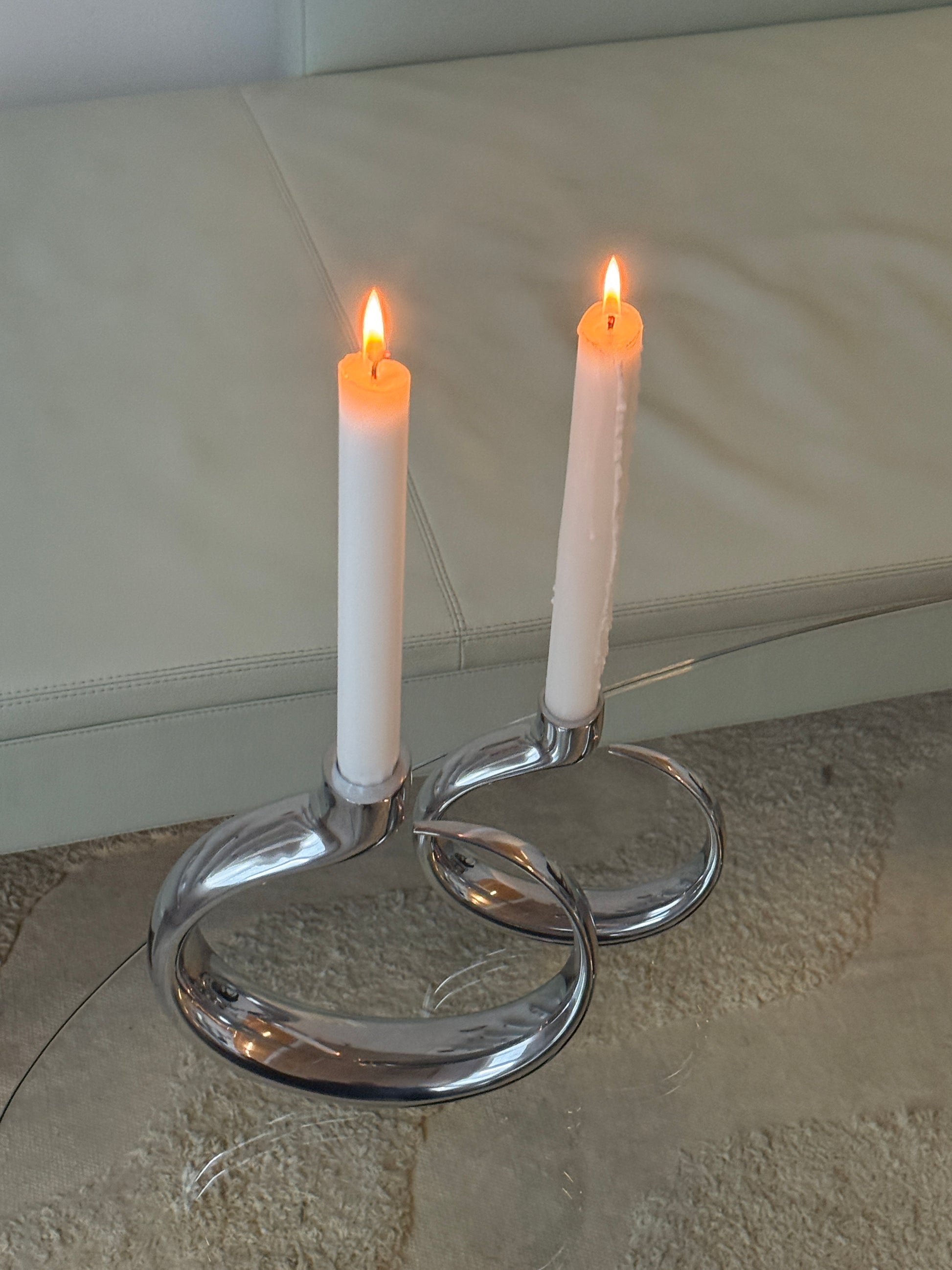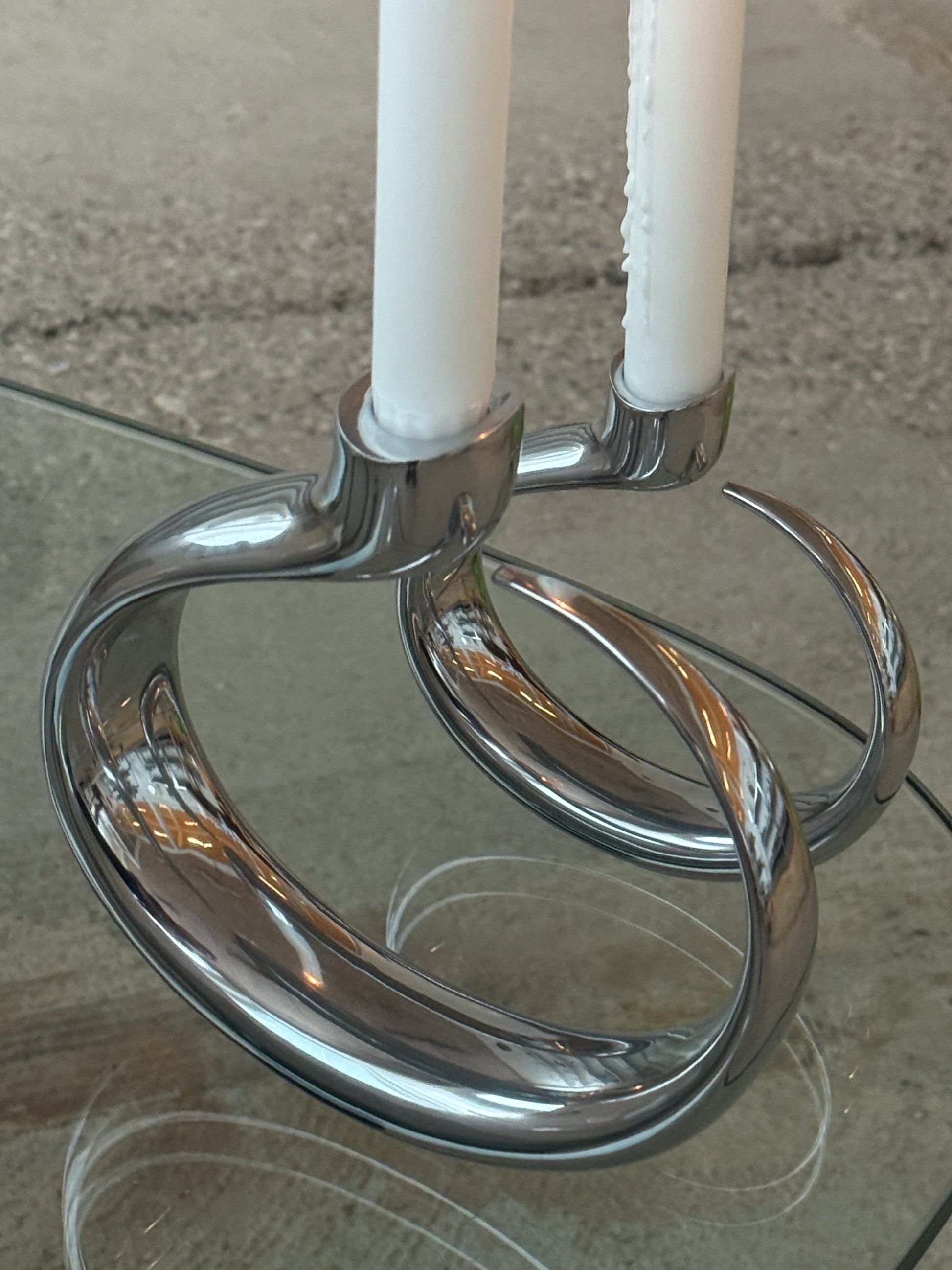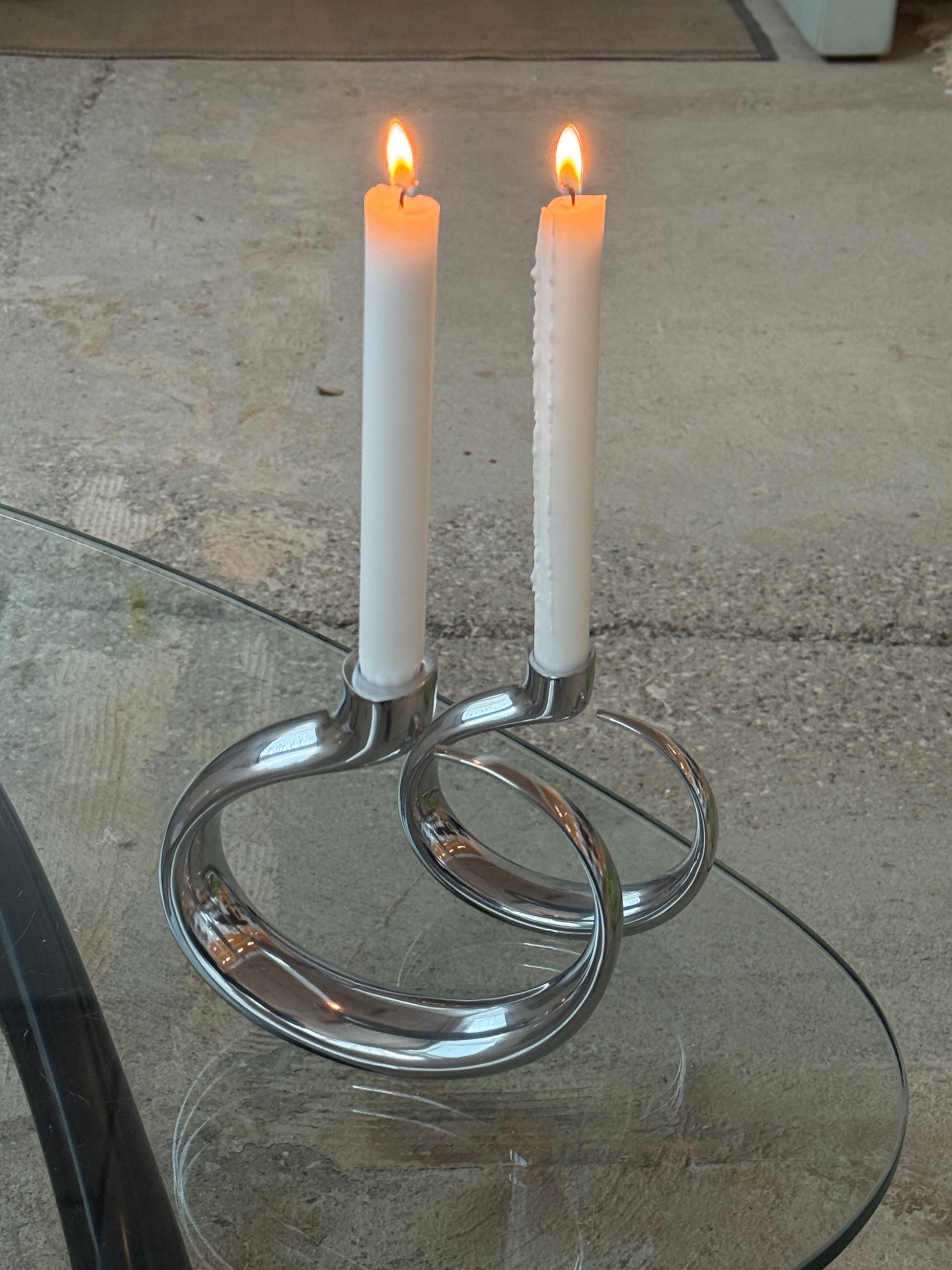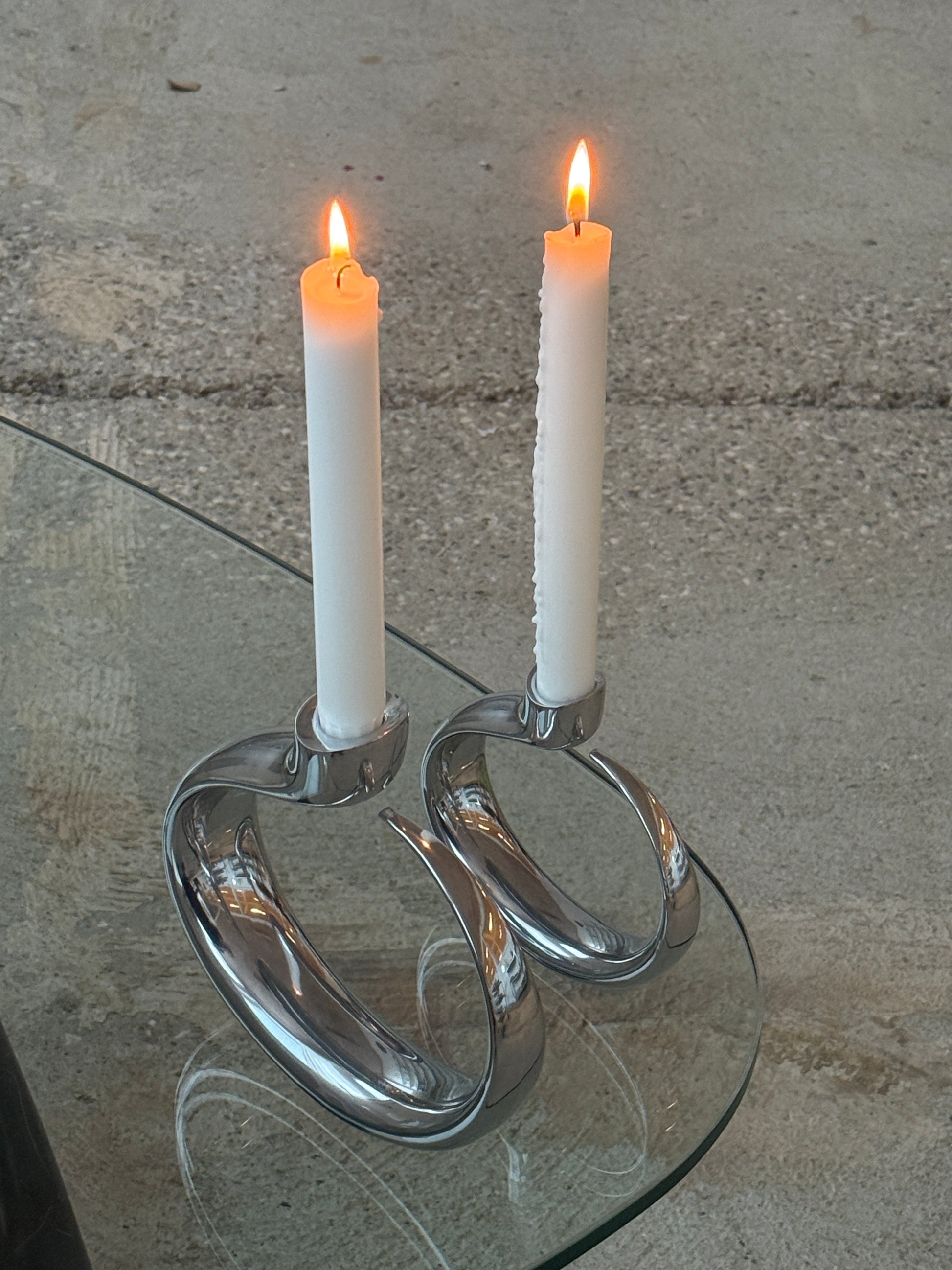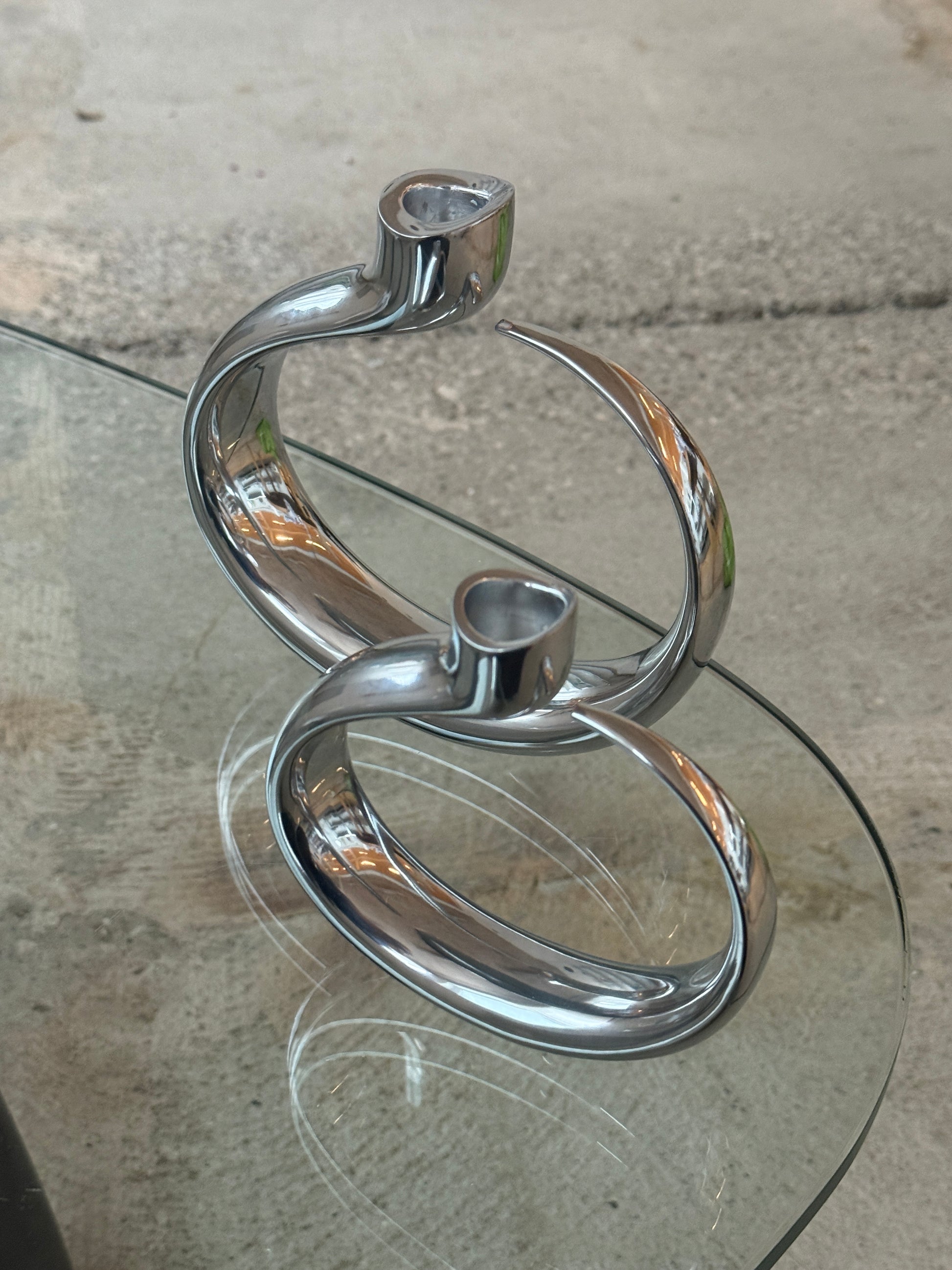 Sæt med to skulpturelle lysestager i rustfrit stål designet af Neil Cohen for det amerikanske designhus Nambe. De organiske former og flydende linjer giver et moderne og elegant udtryk, hvor lysestagerne nærmest fungerer som små kunstværker.