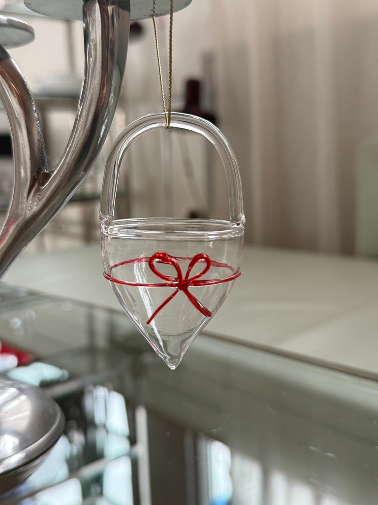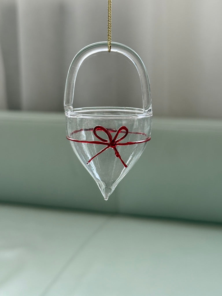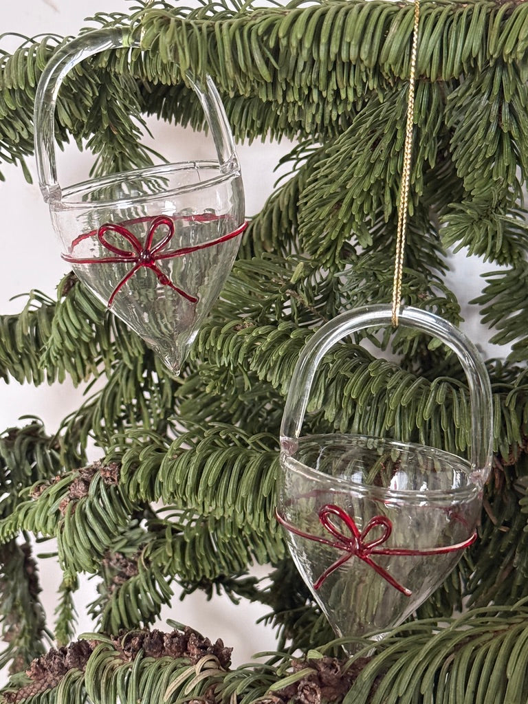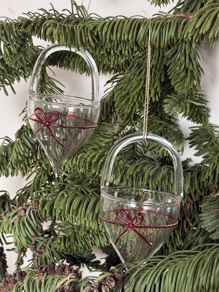 Smukke, håndlavede kræmmerhuse i klart glas – en elegant og moderne fortolkning af klassisk julepynt. Hvert kræmmerhus er formet i glas med en fin, slank spids og et integreret håndtag, så de kan hænges på juletræet eller i en granopsats. Rundt om midten er de pyntet med en rød glas-sløjfe, som giver et diskret, håndværkspræget udtryk.