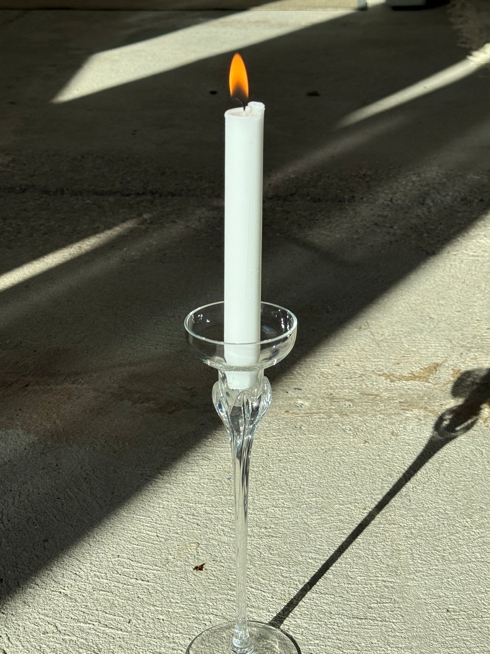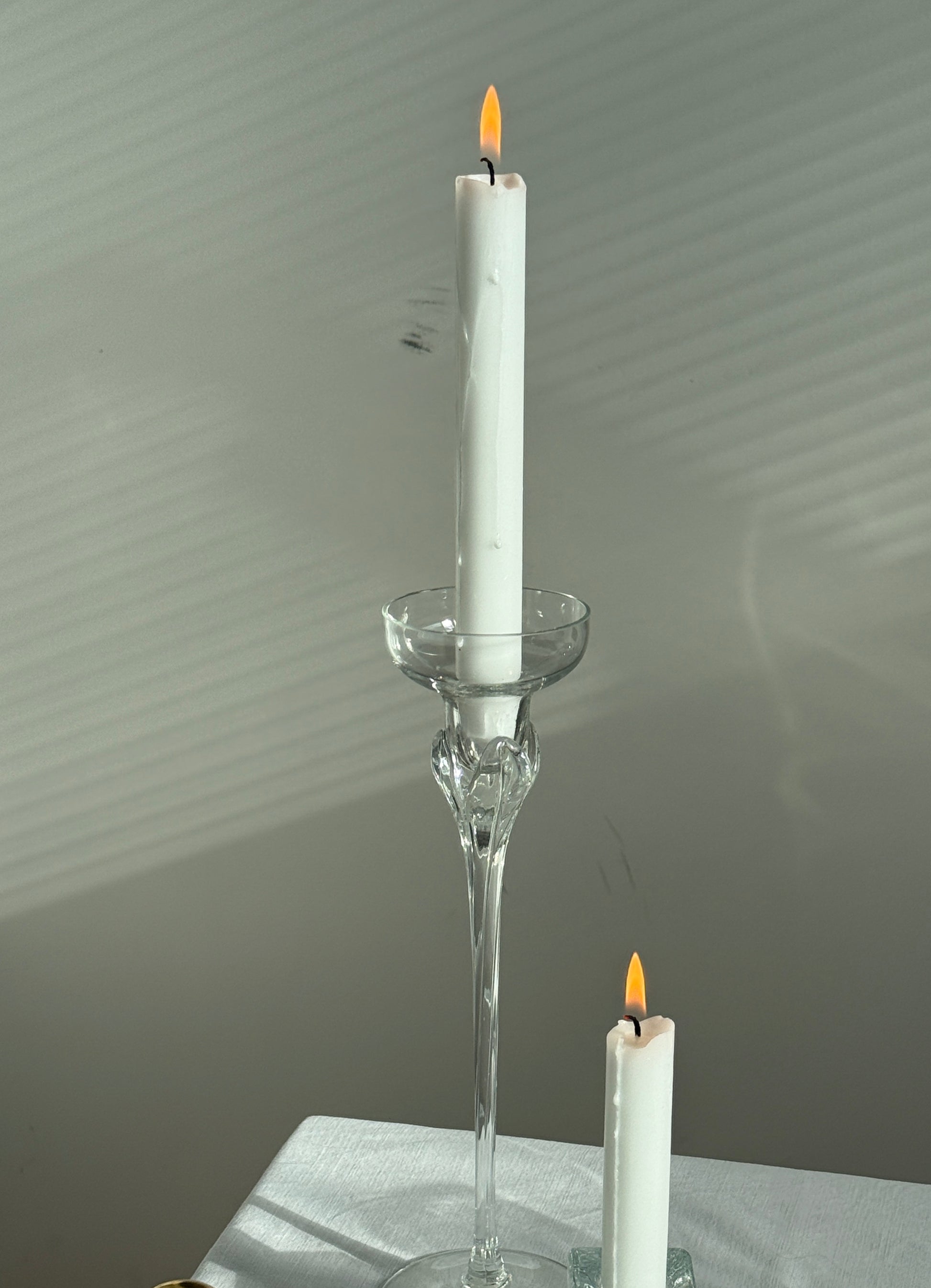 Elegant og skulpturel vintage lysestage i klart glas med smuk, blomsterformet top.