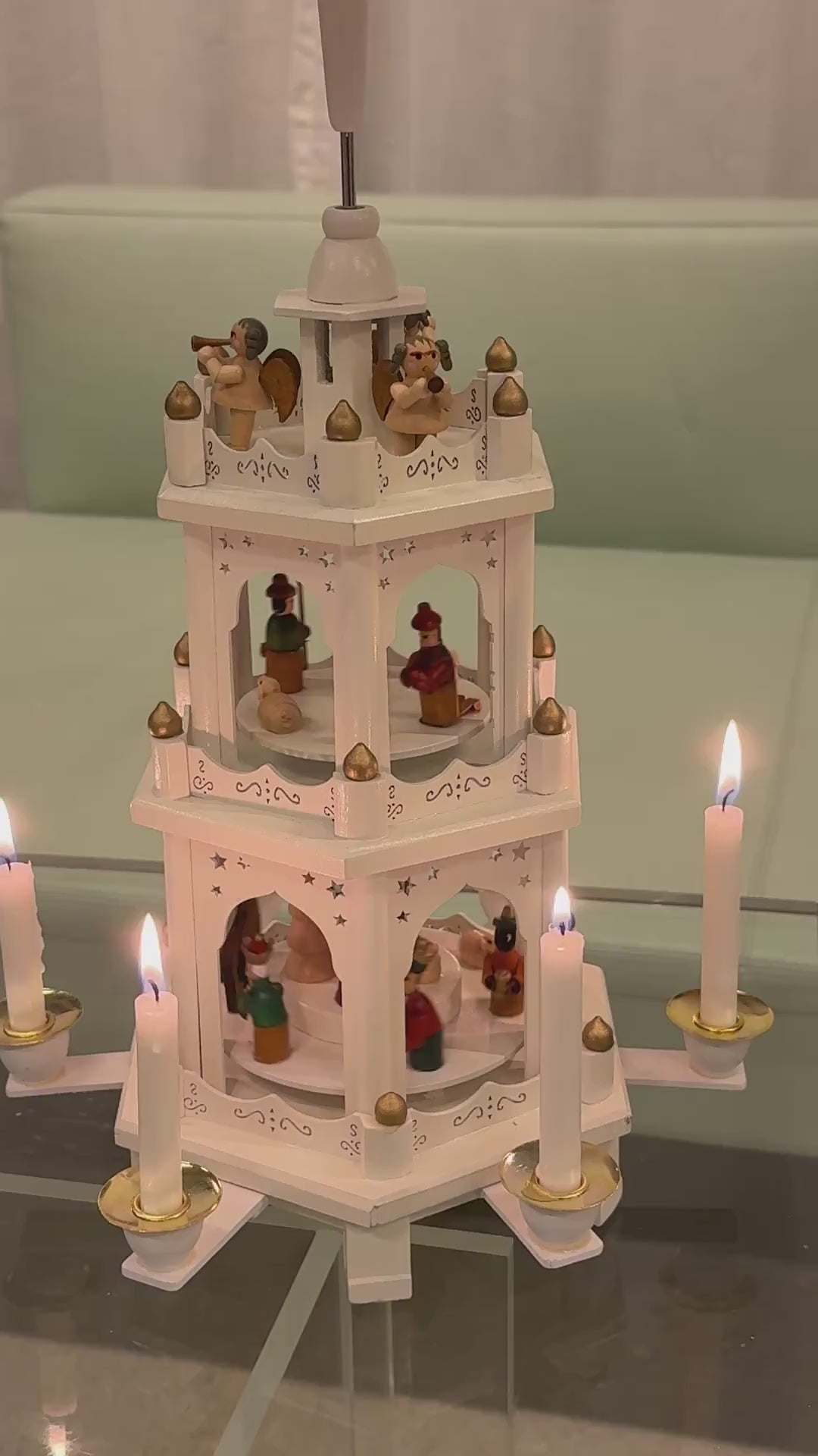 Propellen har udskårne stjernemotiver og drejer stille rundt, når lysene tændes. På øverste etage sidder små engle med instrumenter, og de to nederste etager rummer fine figurer fra krybbespillet.