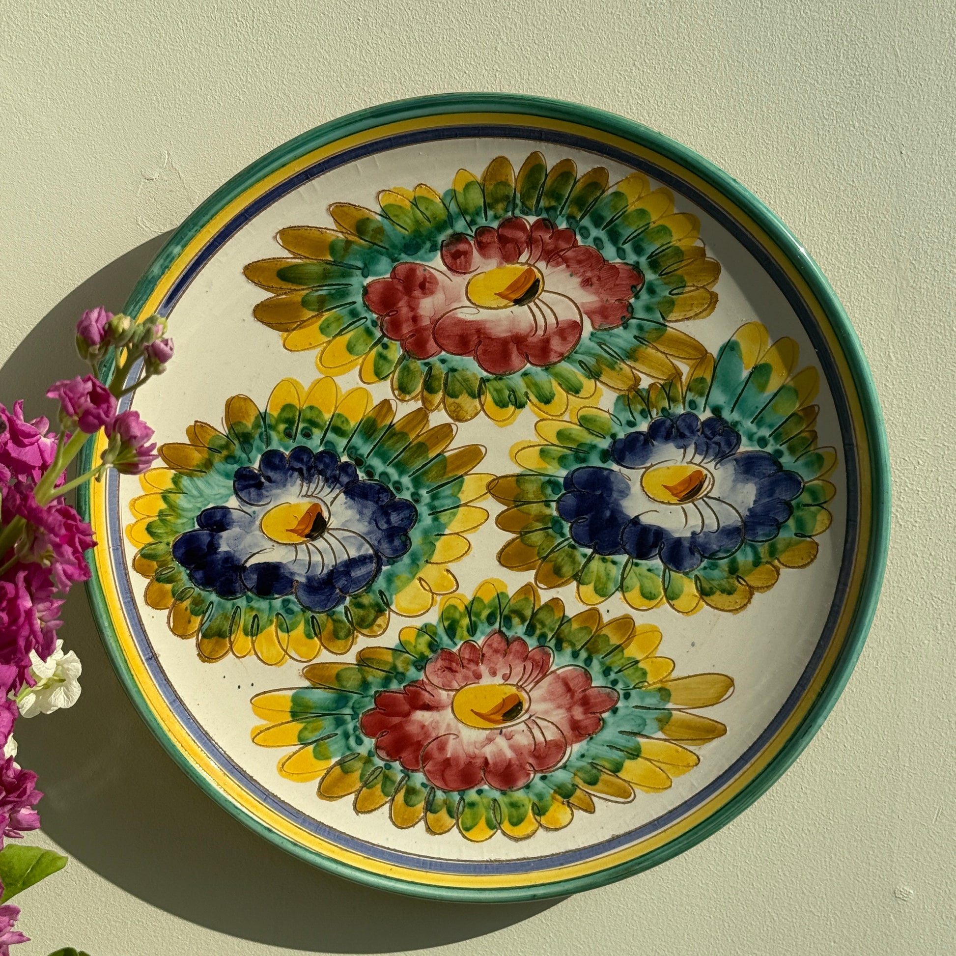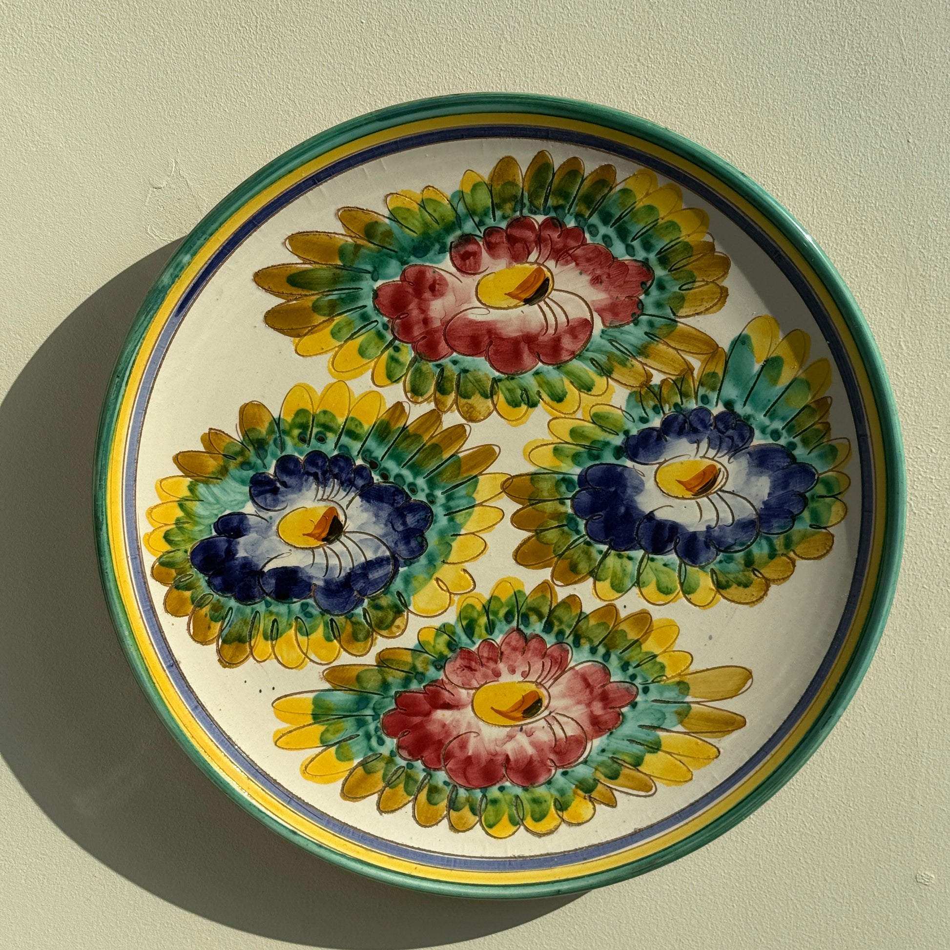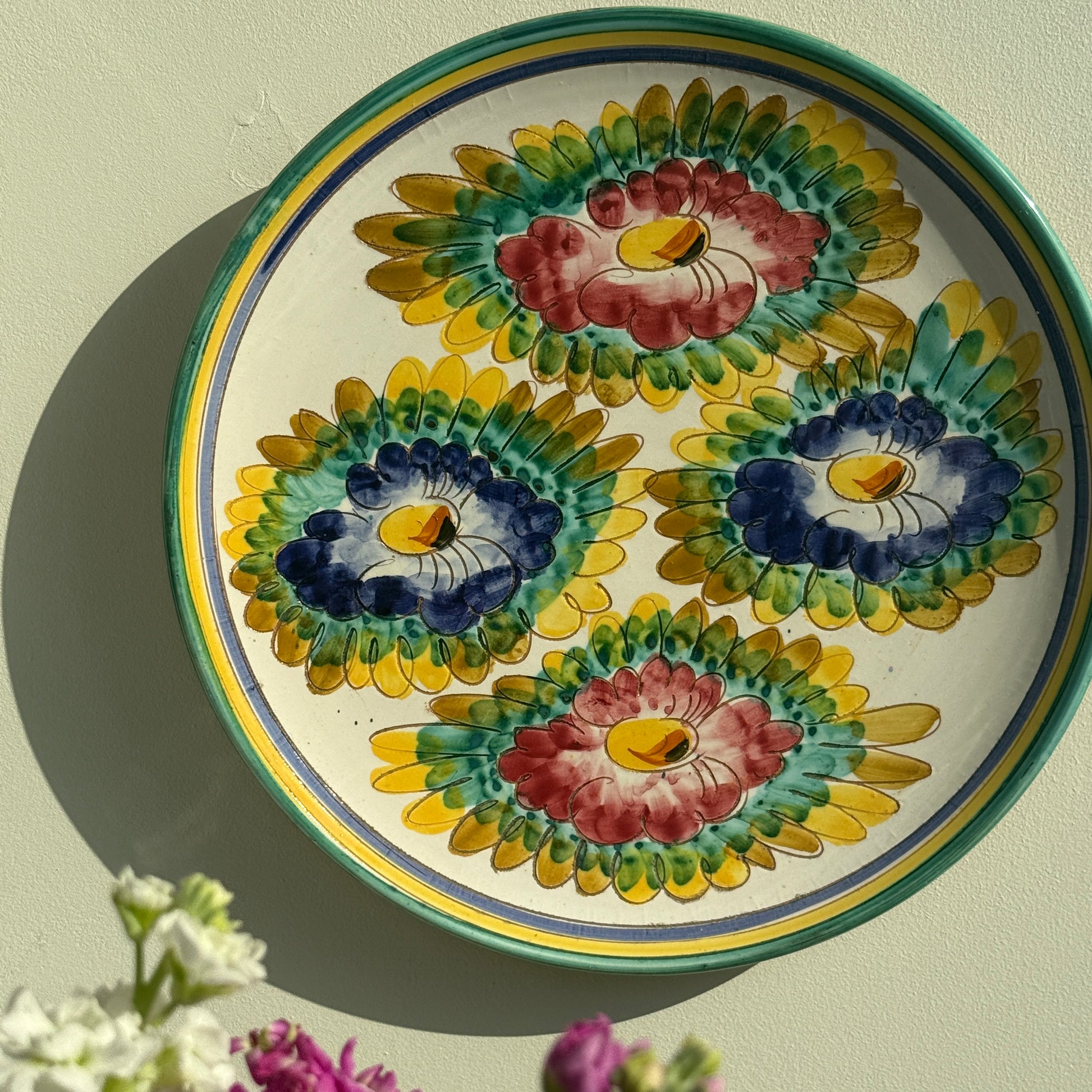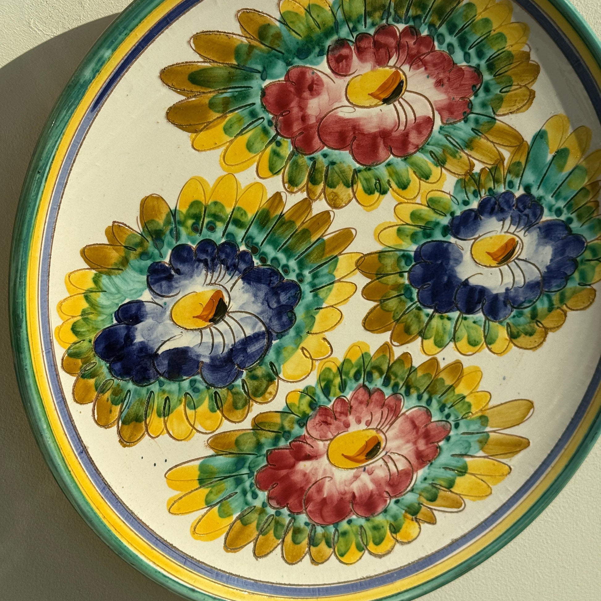 Smukt, håndmalet keramikophæng fra Italien i livlige farver. Motivet består af fire store blomster i forskellige nuancer og en smuk kant i grøn, gul og blå. Ophænget fungerer som vægdekoration, men kan også bruges som serveringsfad.