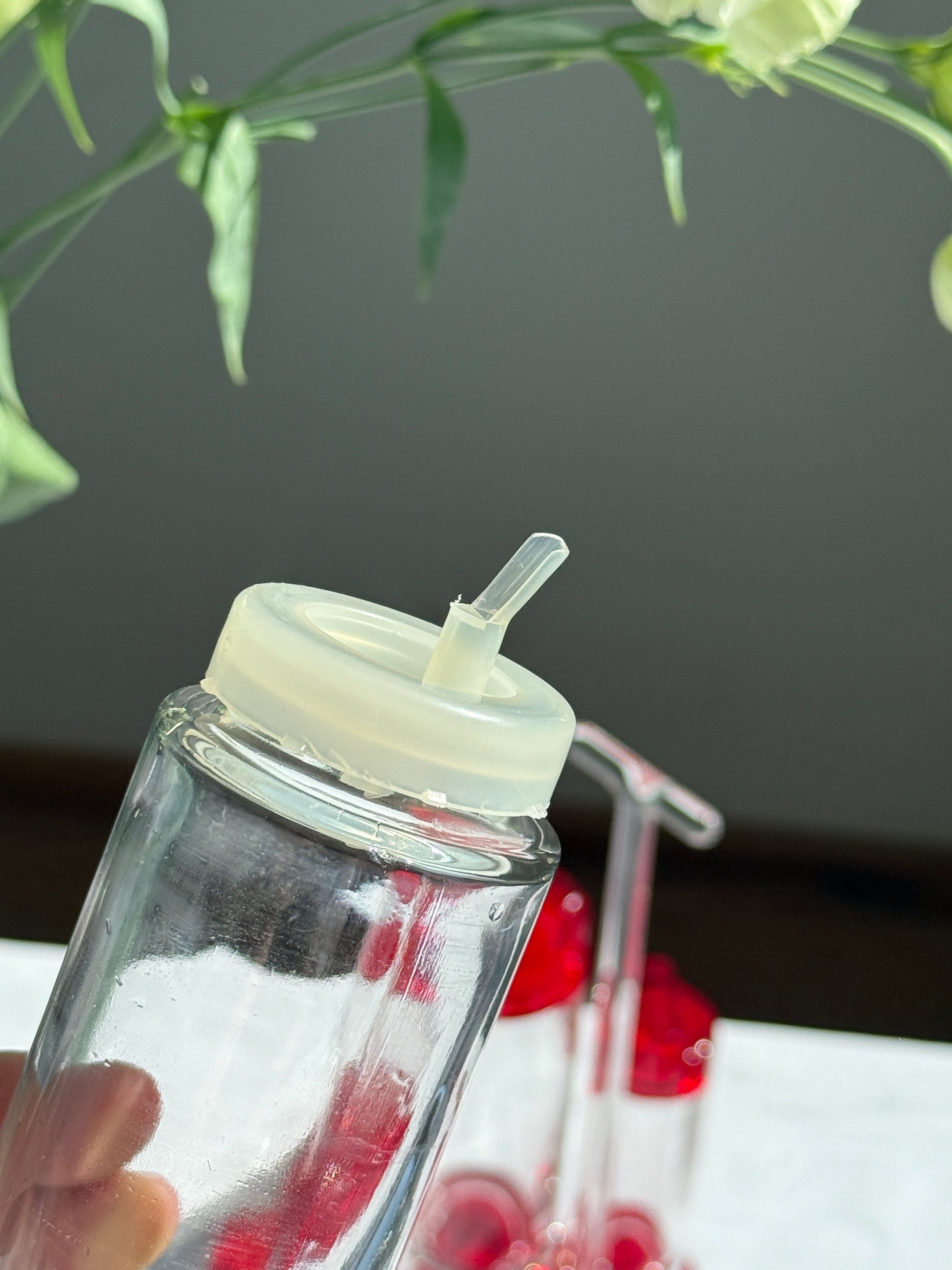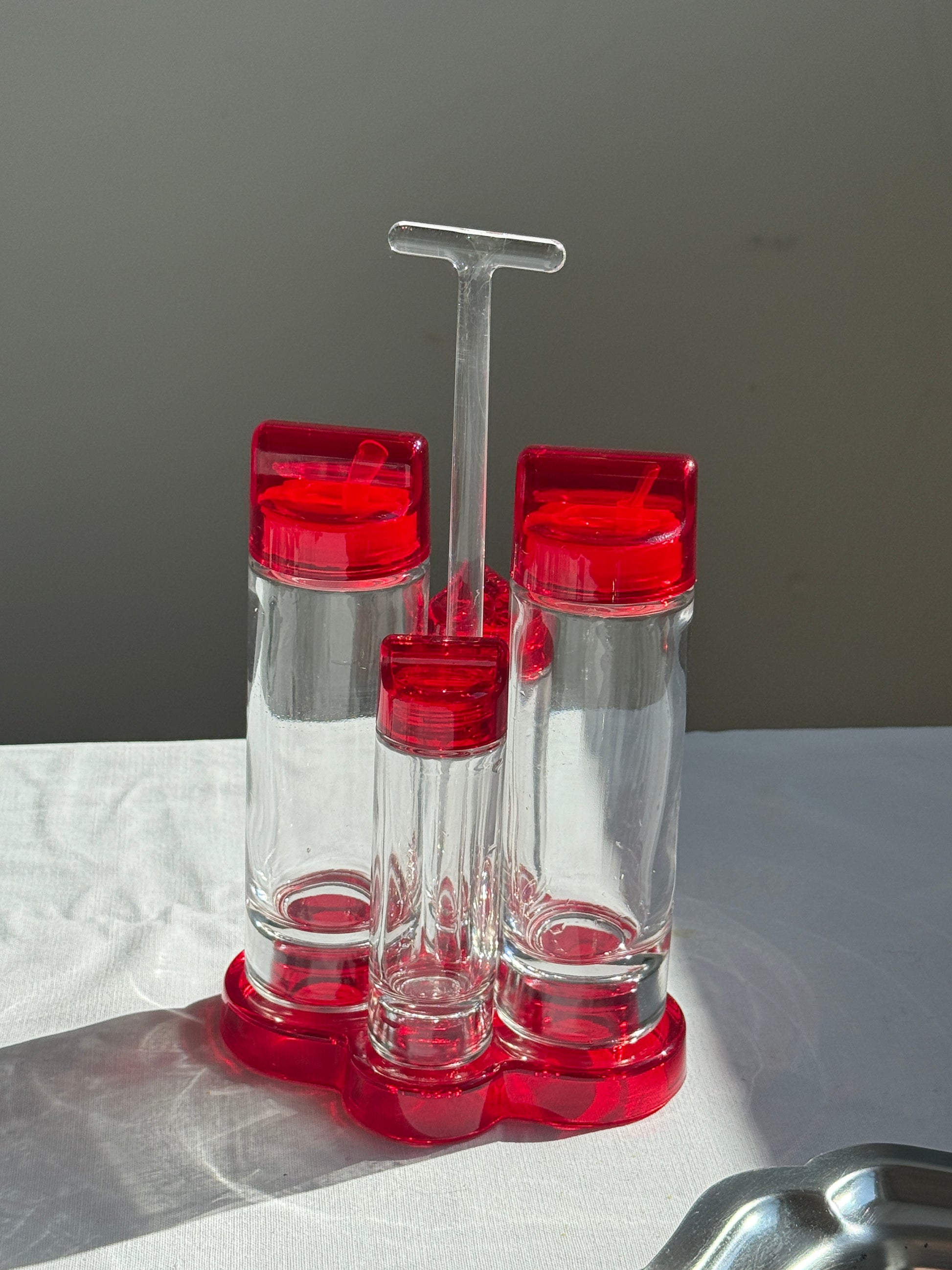 Smukt og funktionelt krydderisæt fra Par Fratelli Guzzini, Italien. Sættet består af fire beholdere i klart glas med låg og holder i transparent rød akryl. Perfekt til bordservering af salt, peber, olie, balsamico eller andre dressinger. Med sit retro design bringer det både praktisk anvendelighed og et pop af farve til borddækningen.