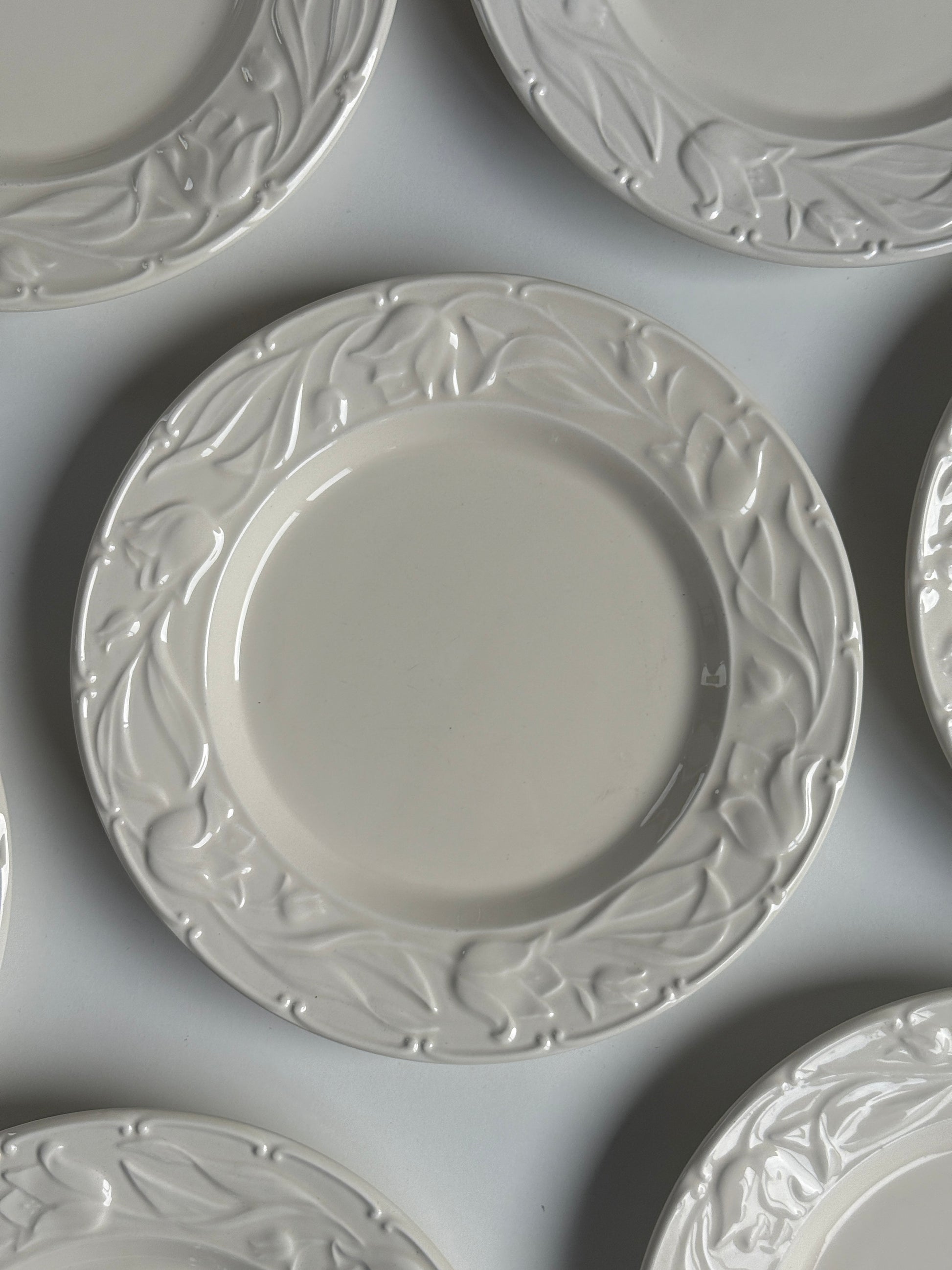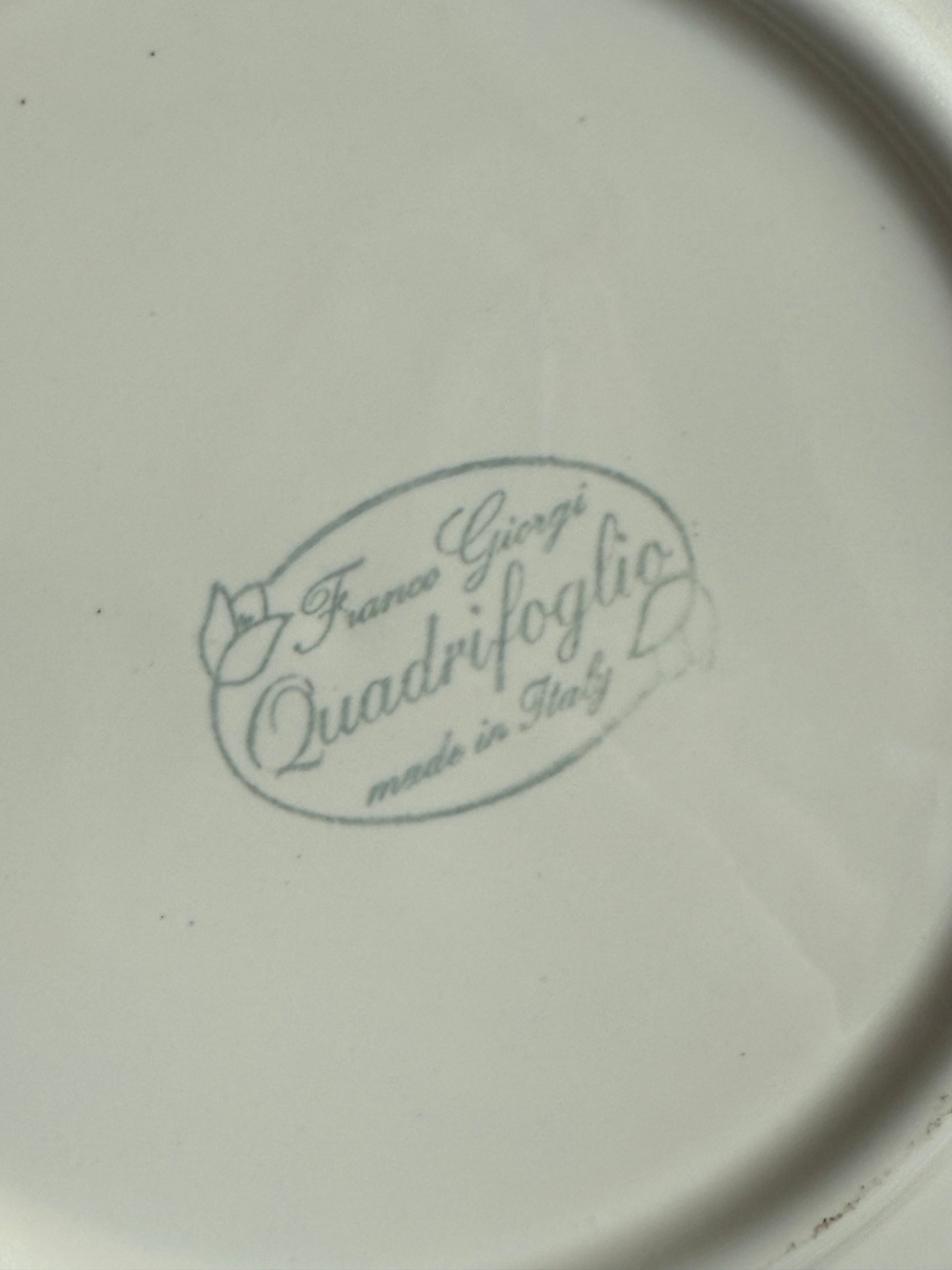 Sæt med 8 smukke italienske middagstallerkner fra Franco Giorgi, serien Quadrifoglio. Tallerkenerne er fremstillet i hvidglaseret stentøj med reliefmønster af blomster og blade langs kanten – et elegant og tidløst design, der giver en rolig og klassisk stemning på bordet. Perfekte til både hverdagsbrug og opdækning med et strejf af italiensk romantik.