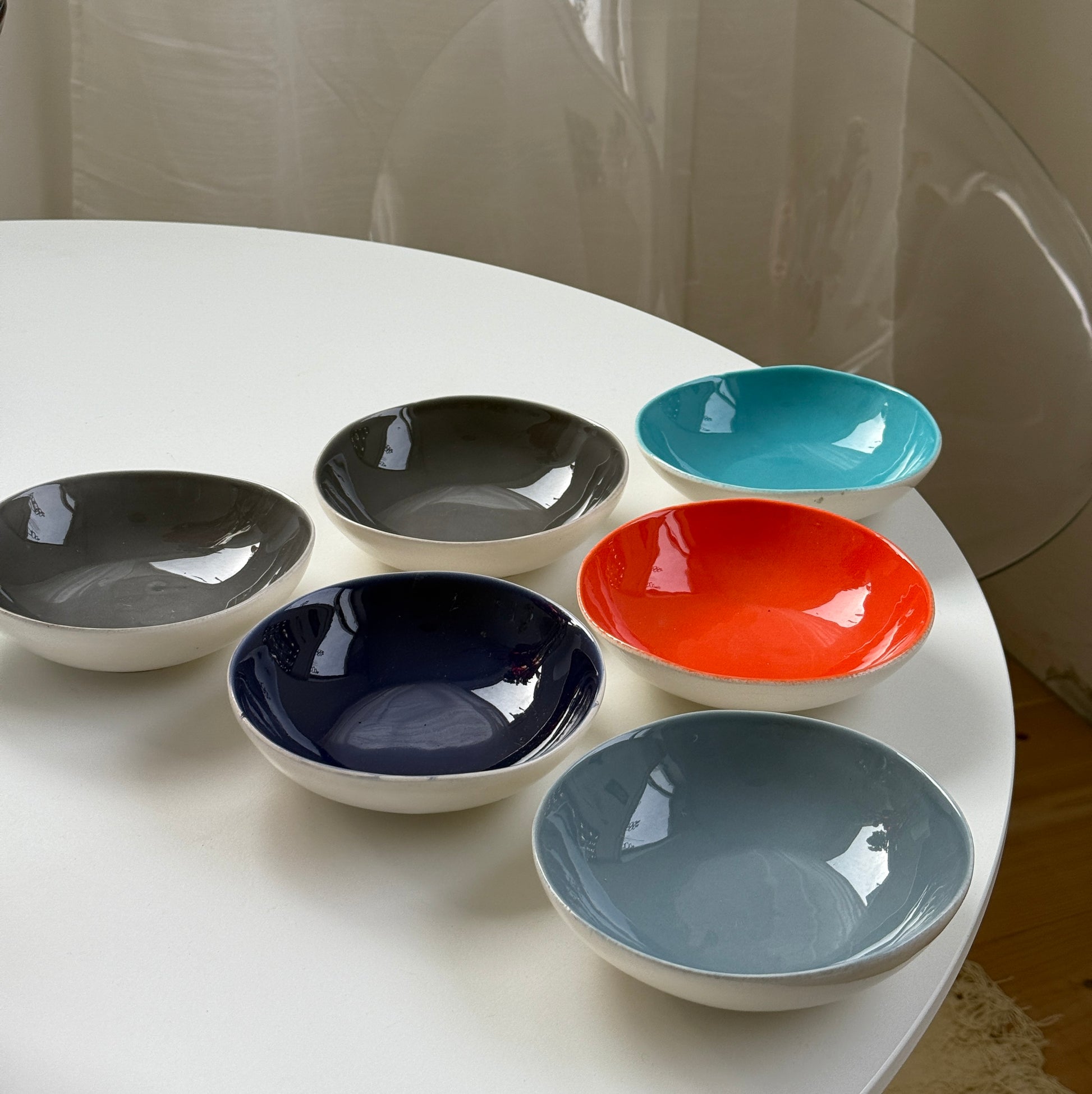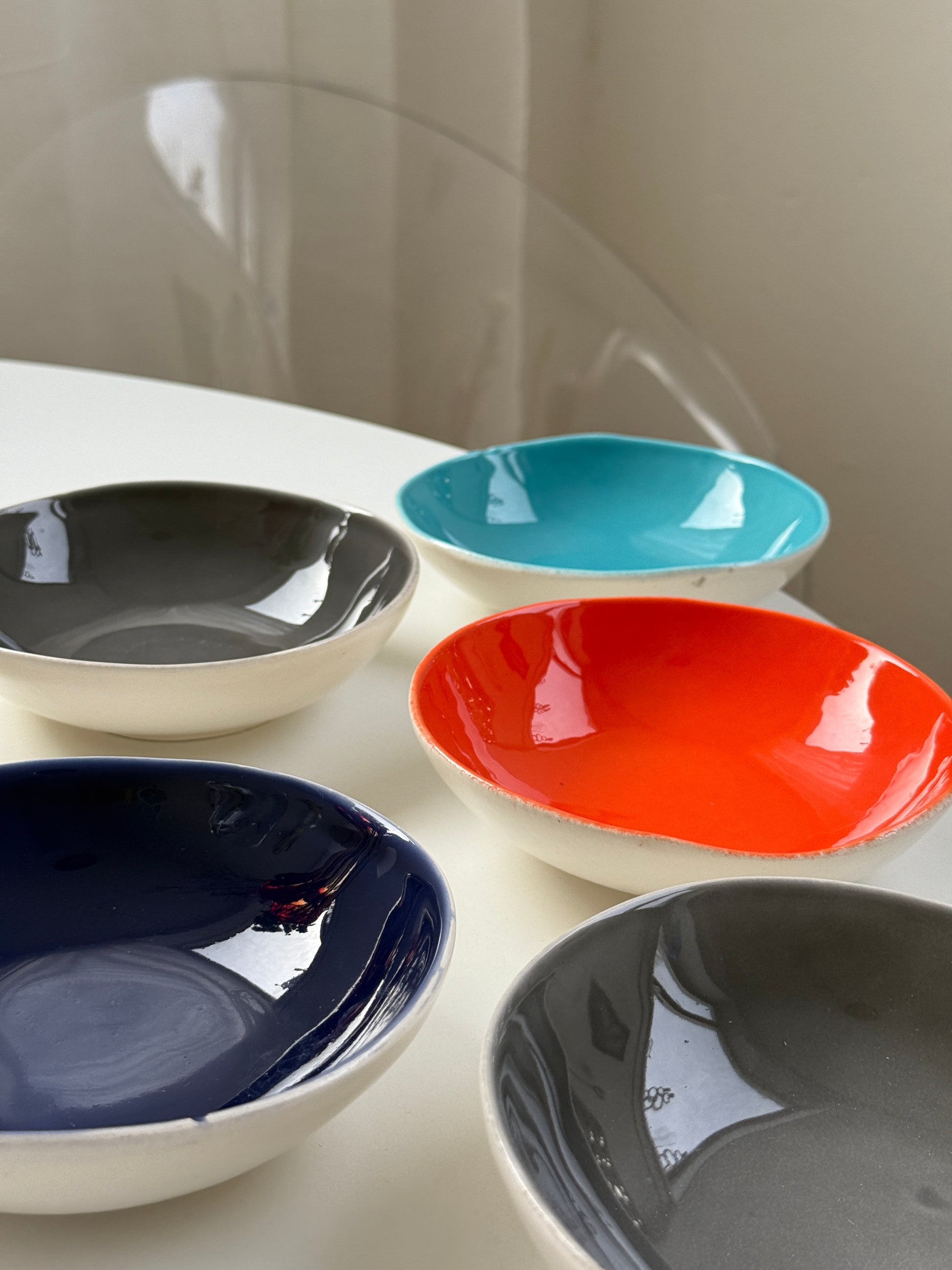 Disse smukke skåle er designet af Brigitte de Bazelaire for Sentou og er fremstillet i Toscana, Italien. De har en organisk form og kommer i en række dybe, mættede farver – fra dybblå og grå til en livlig turkis og en varm rød-orange. Ydersiden i en blød, mat hvid, som står så fint i kontrast til de fine farver!