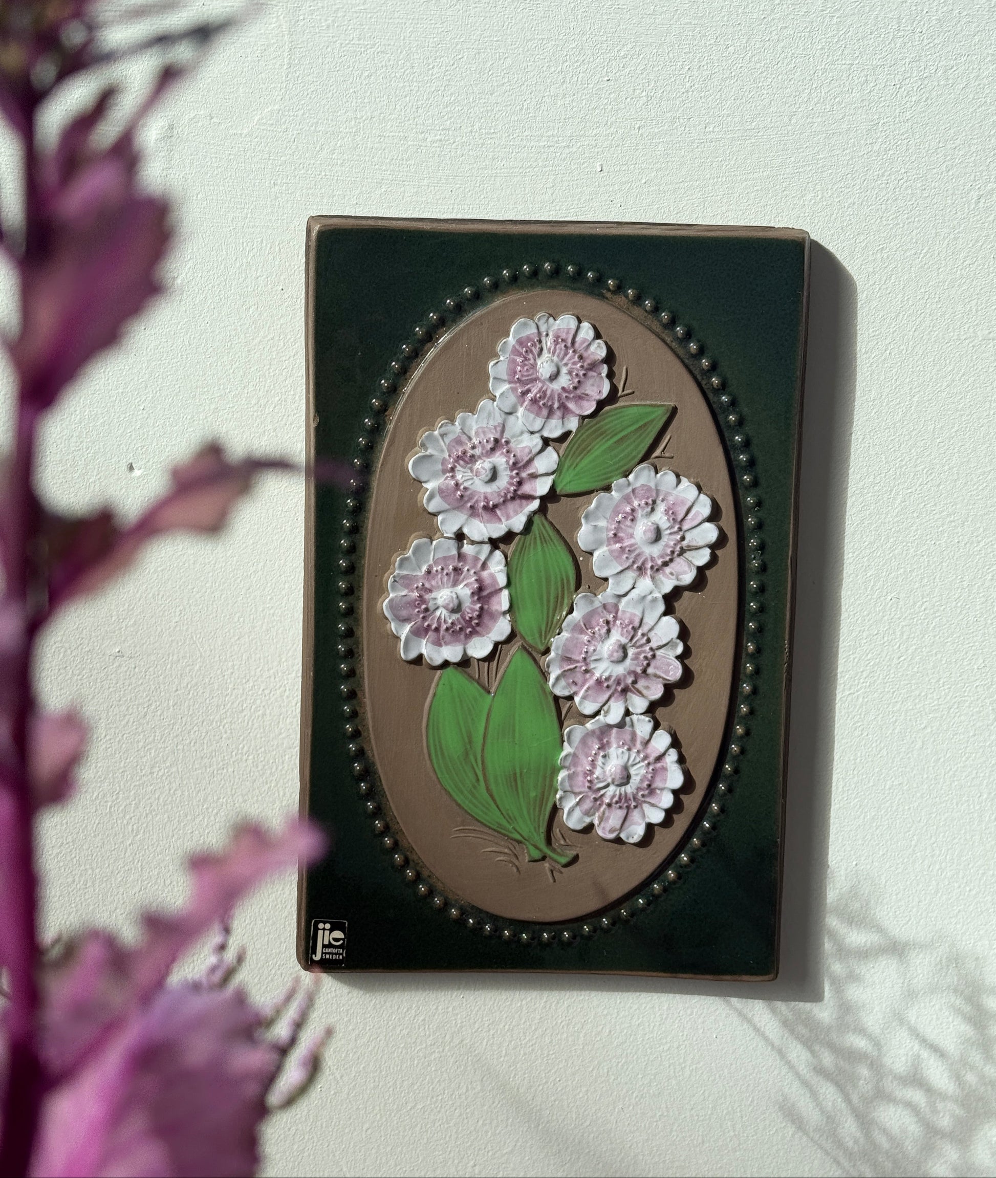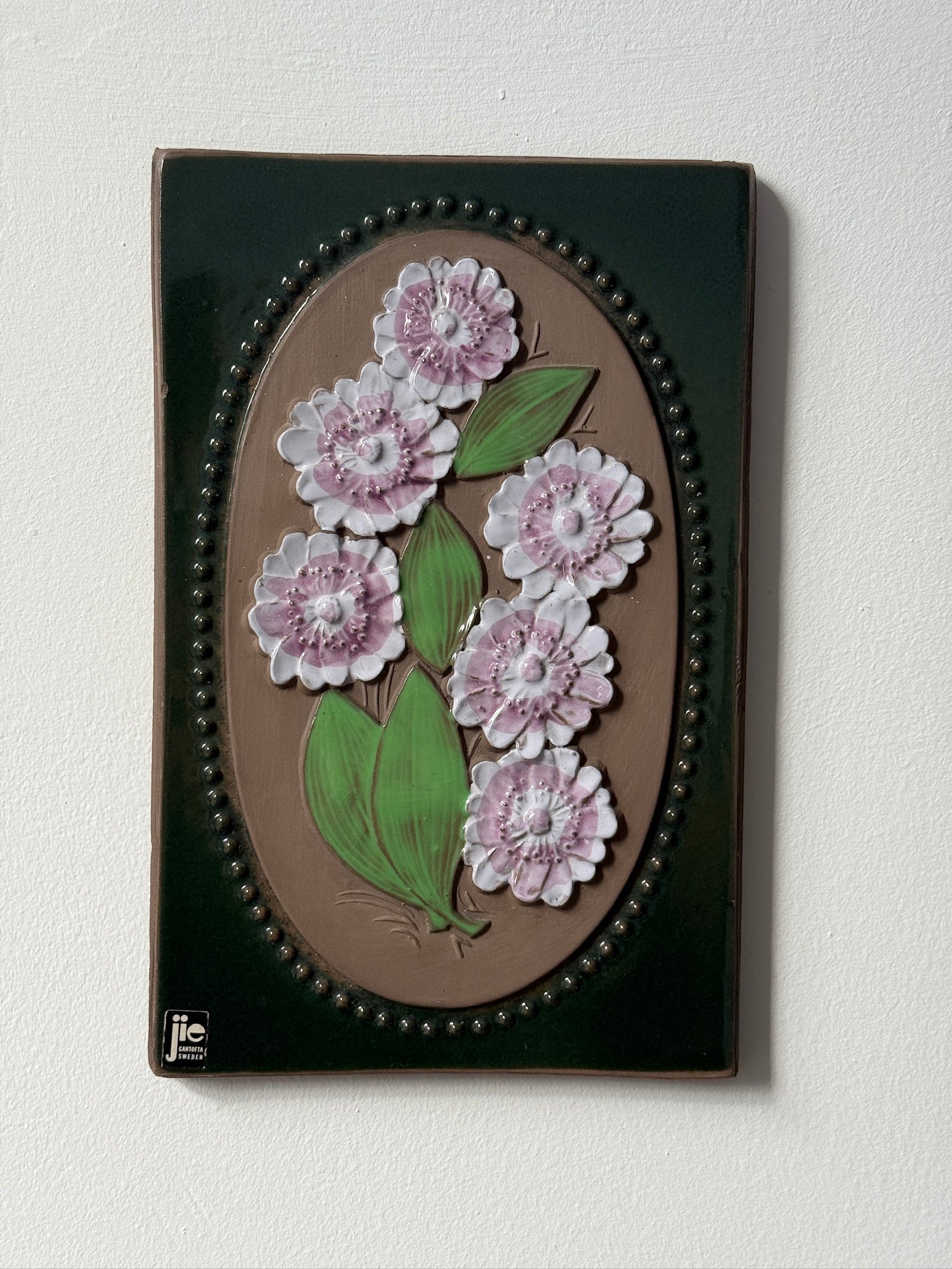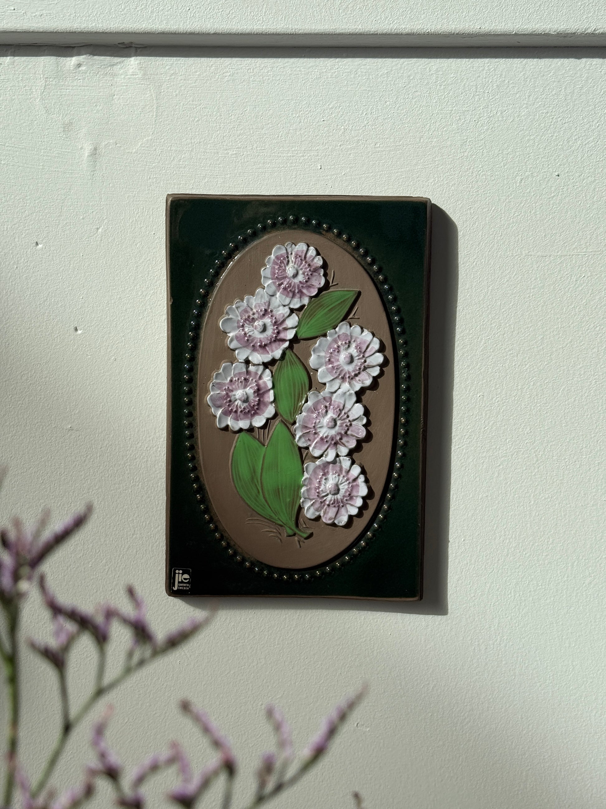 Relief fra Jie Gantofta med søde hvid/lilla blomster, klar til at hænge på væggen. Fundet i Sverige.
