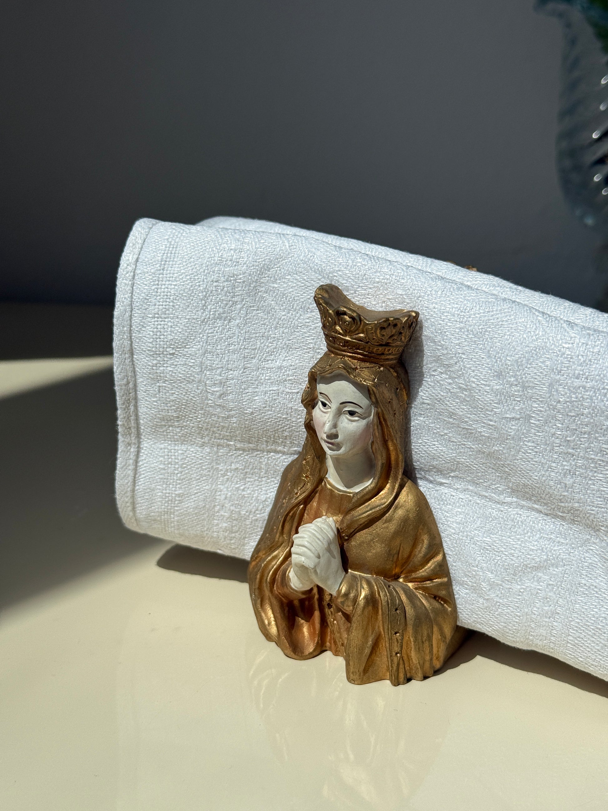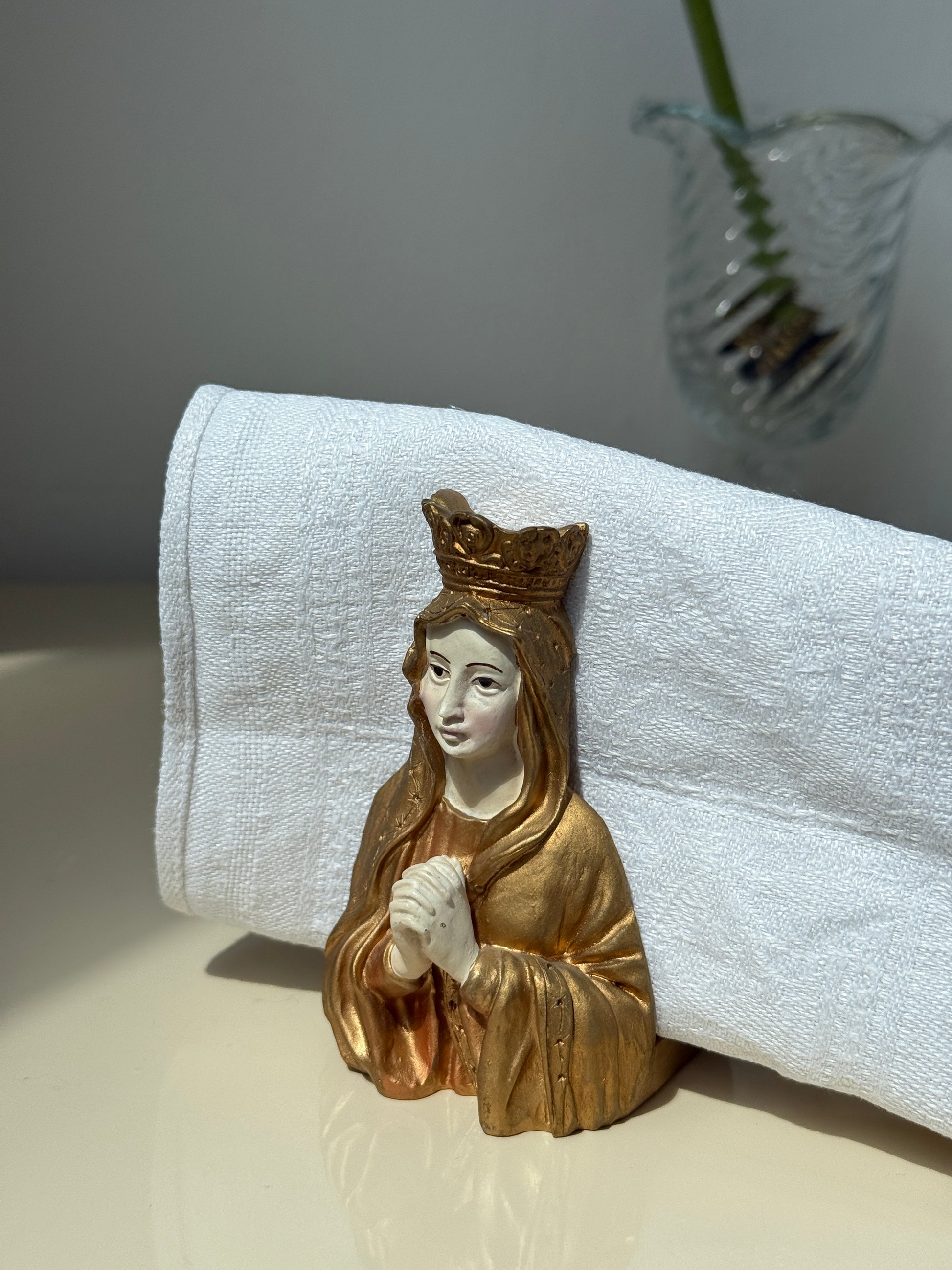 Unik servietholder udformet som en figur af Jomfru Maria i gyldne gevandter og med foldede hænder. En særlig, stemningsfuld borddetalje, der fungerer både praktisk og som et sjovt element til spisebordet.