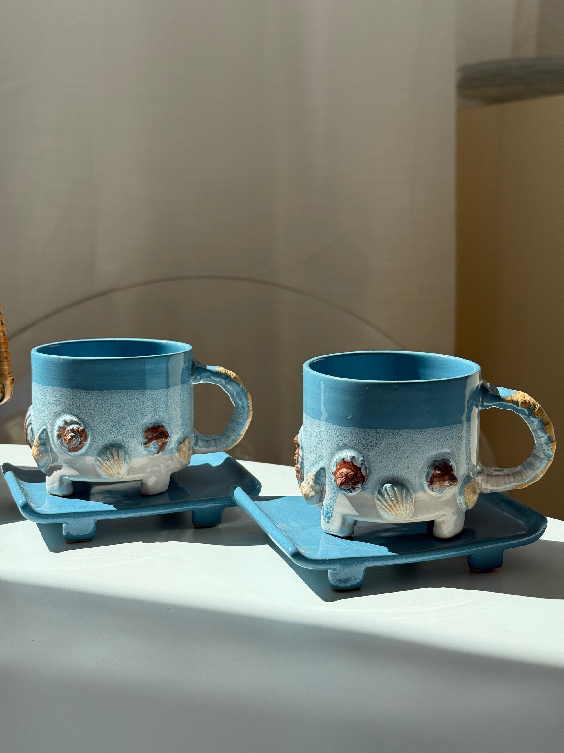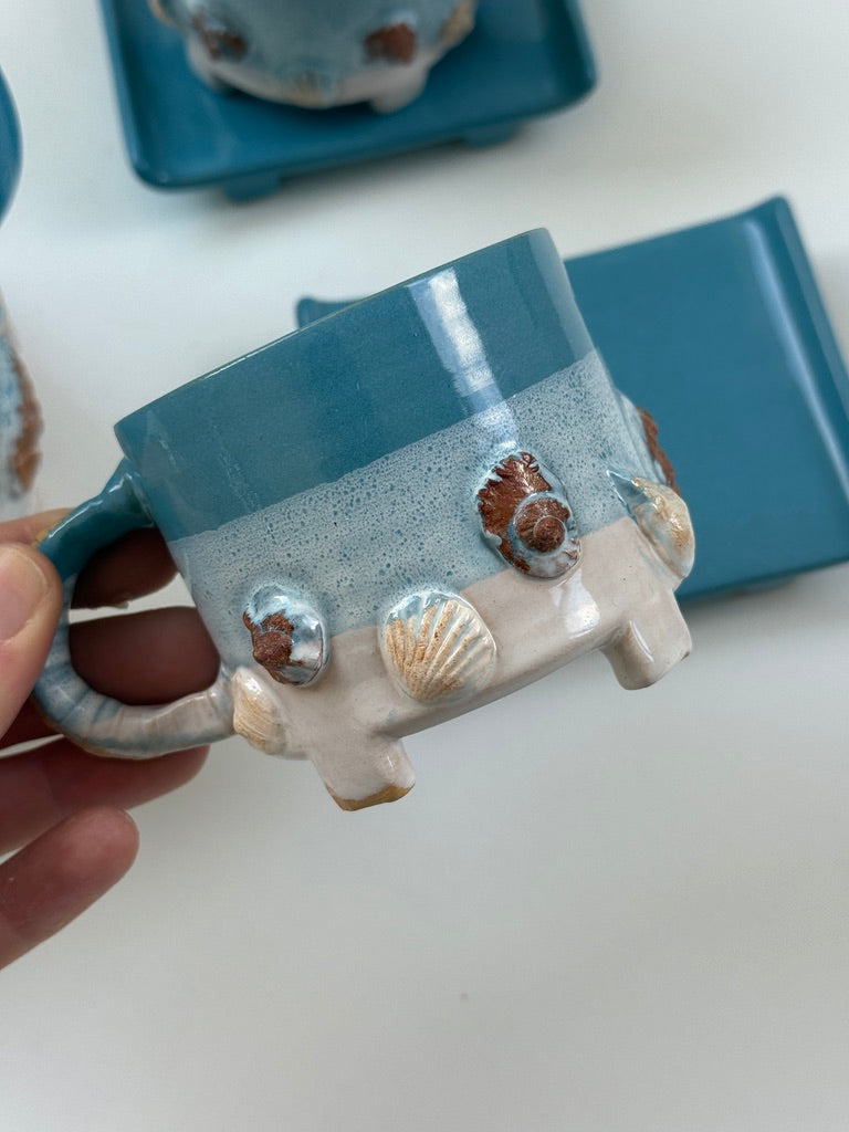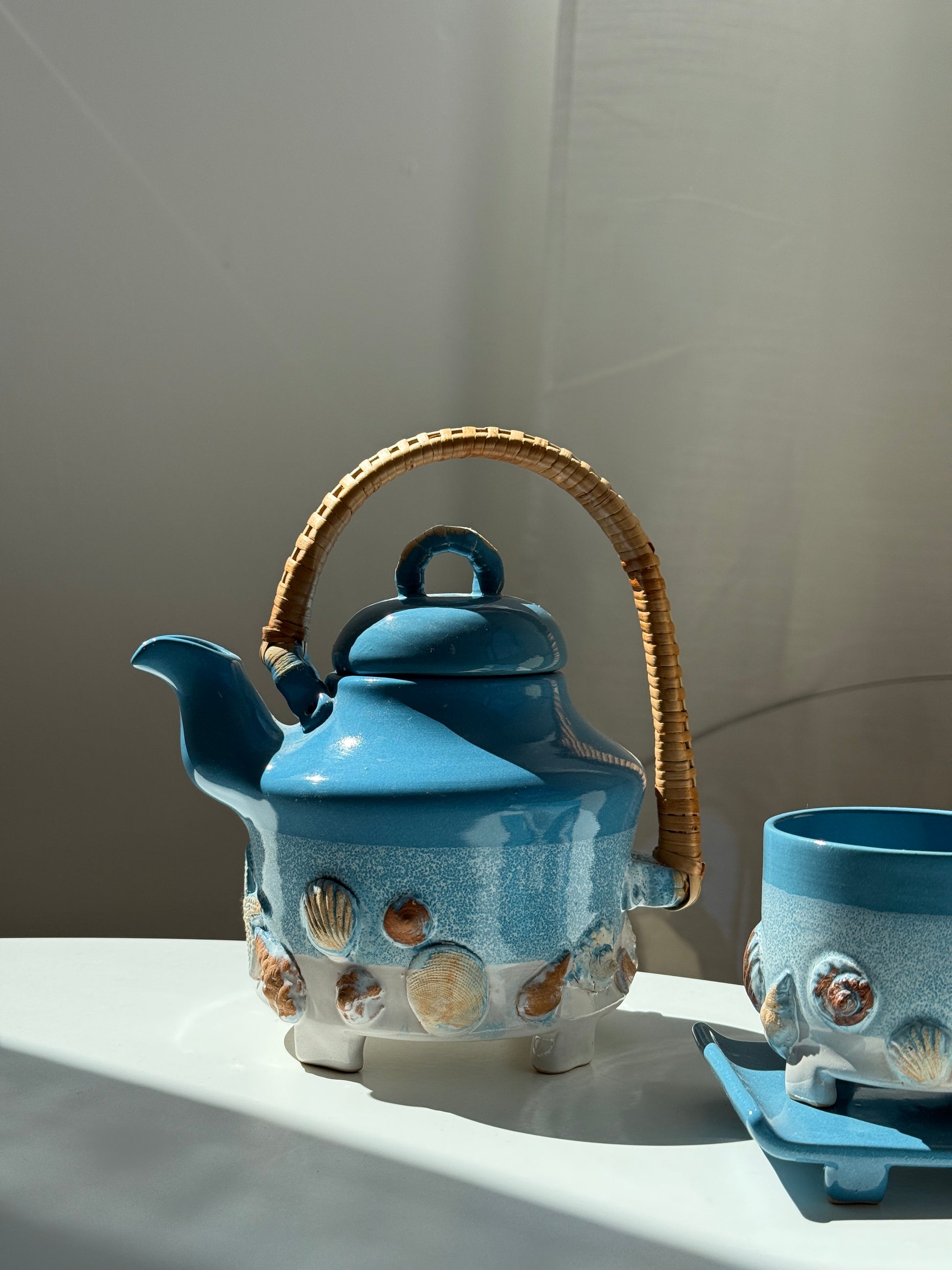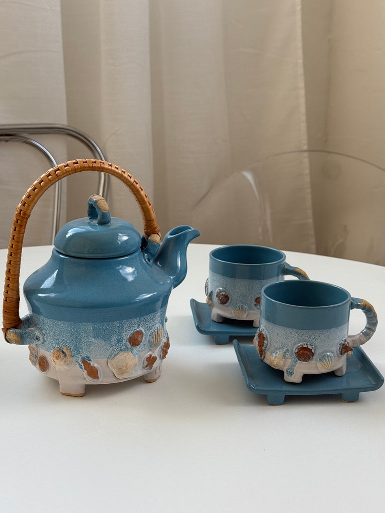 Charmerende og særpræget te-sæt i keramik bestående af tekande med låg og hank i flet, to kopper og to firkantede underkopper. Glasuren er i en klar turkisblå med hvid bund og påsatte små skaller hele vejen rundt.