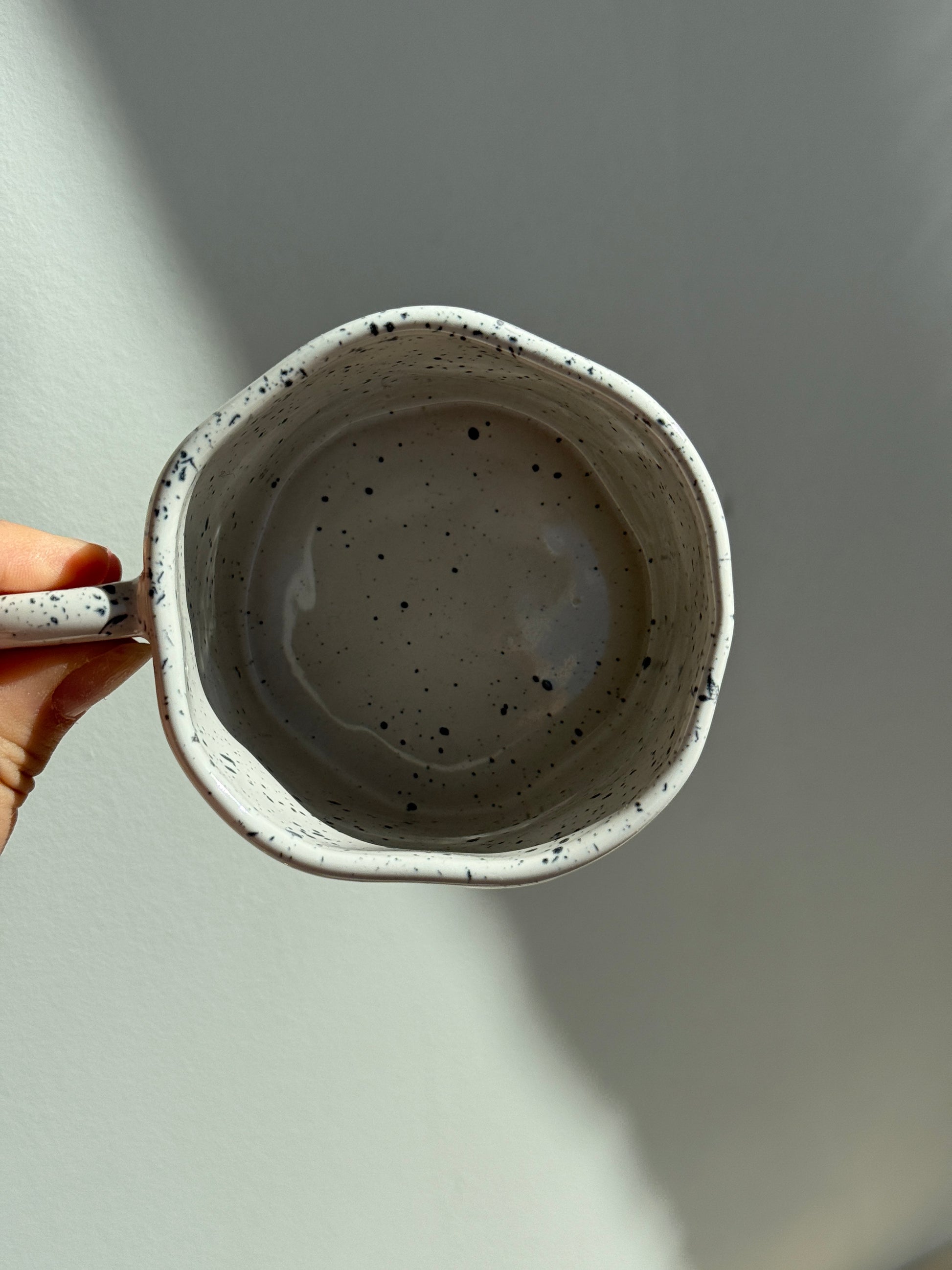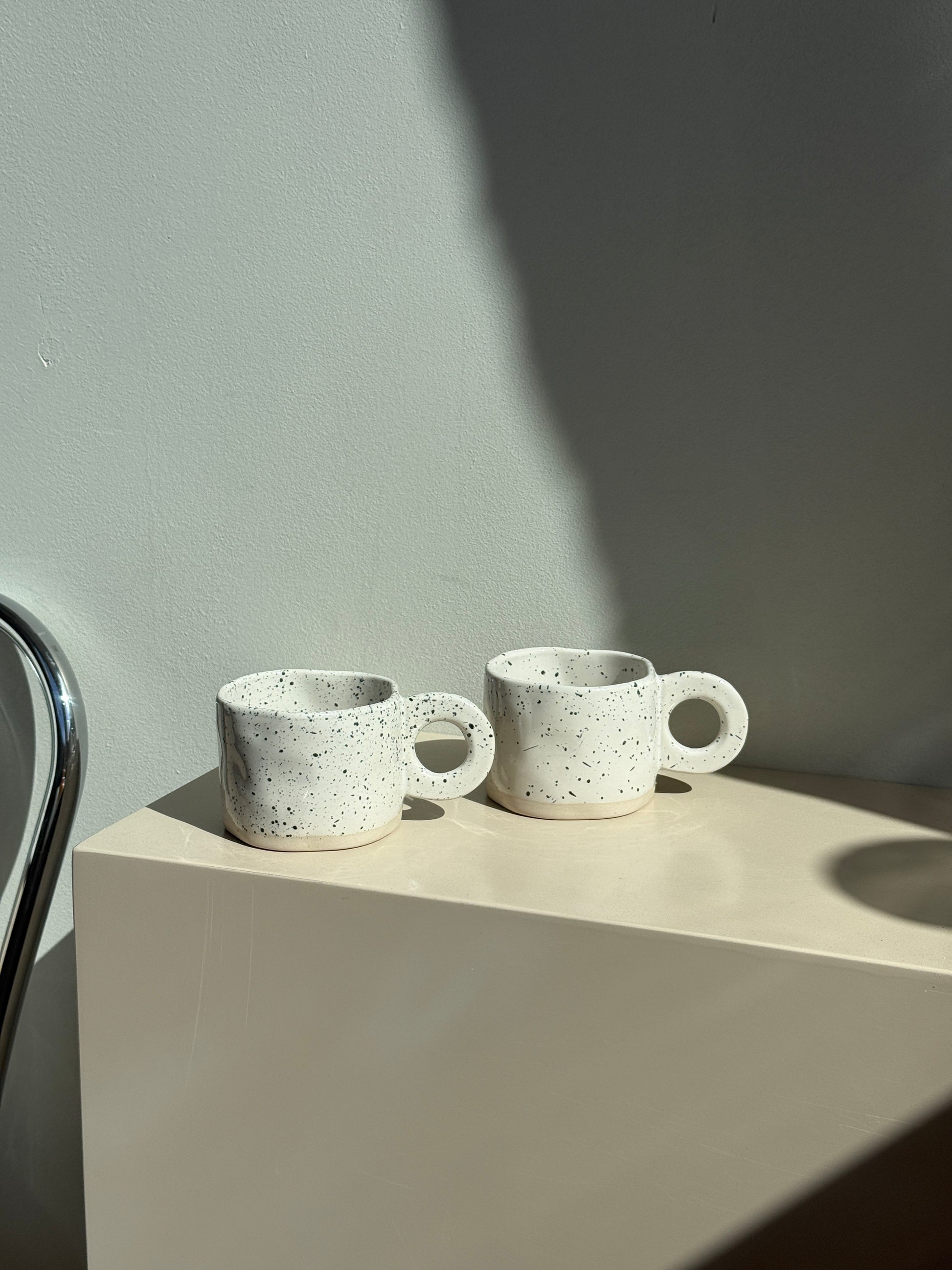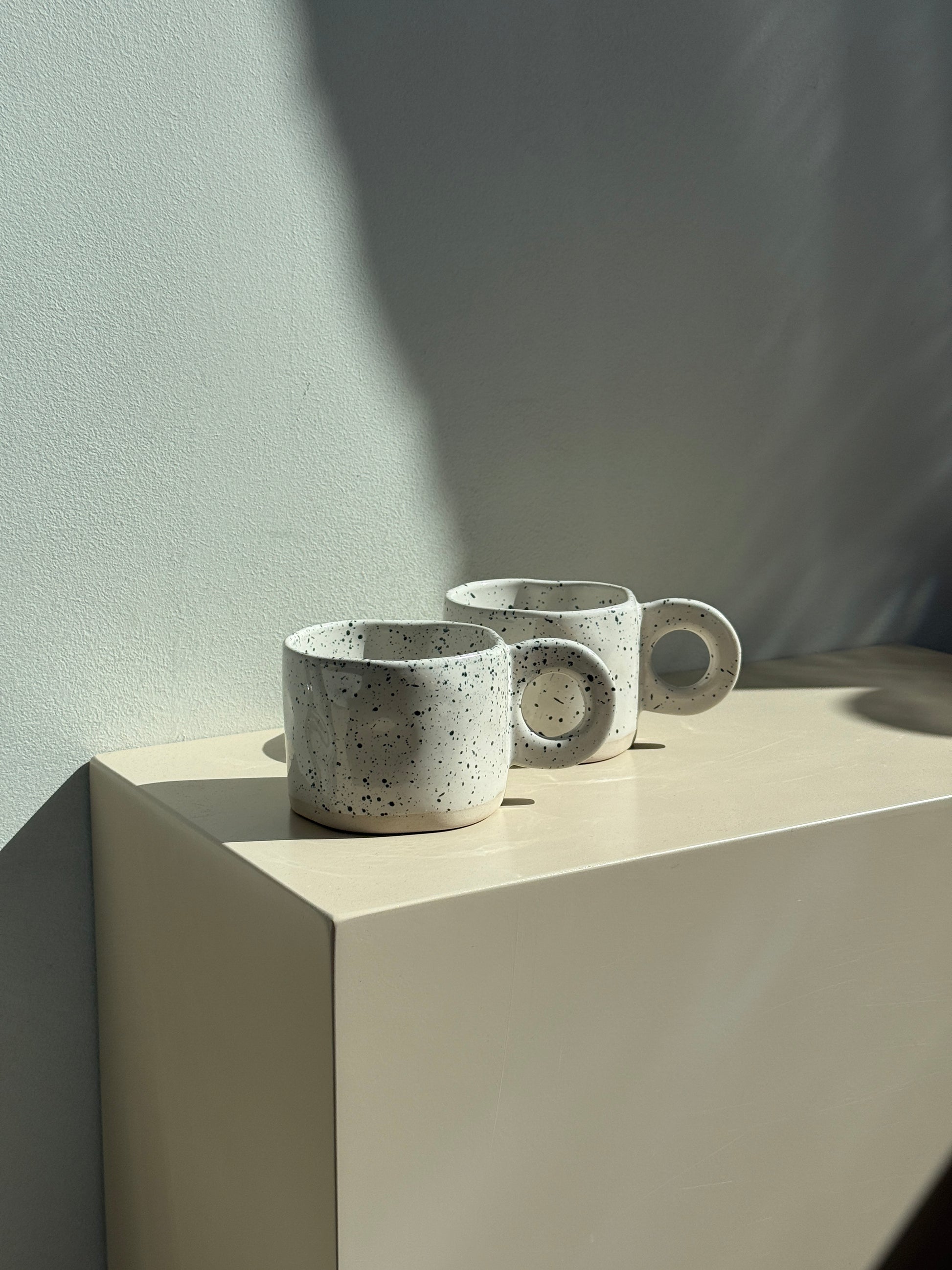 To dekorative keramik kopper i råhvid med sorte stænk og et skulpturelt formsprog. Begge kopper har en spændende, let kantet form og en markant rund cirkelhank, der giver dem et legende og moderne udtryk. Perfekte til kaffe, te eller som stilfulde elementer i køkkenindretningen.