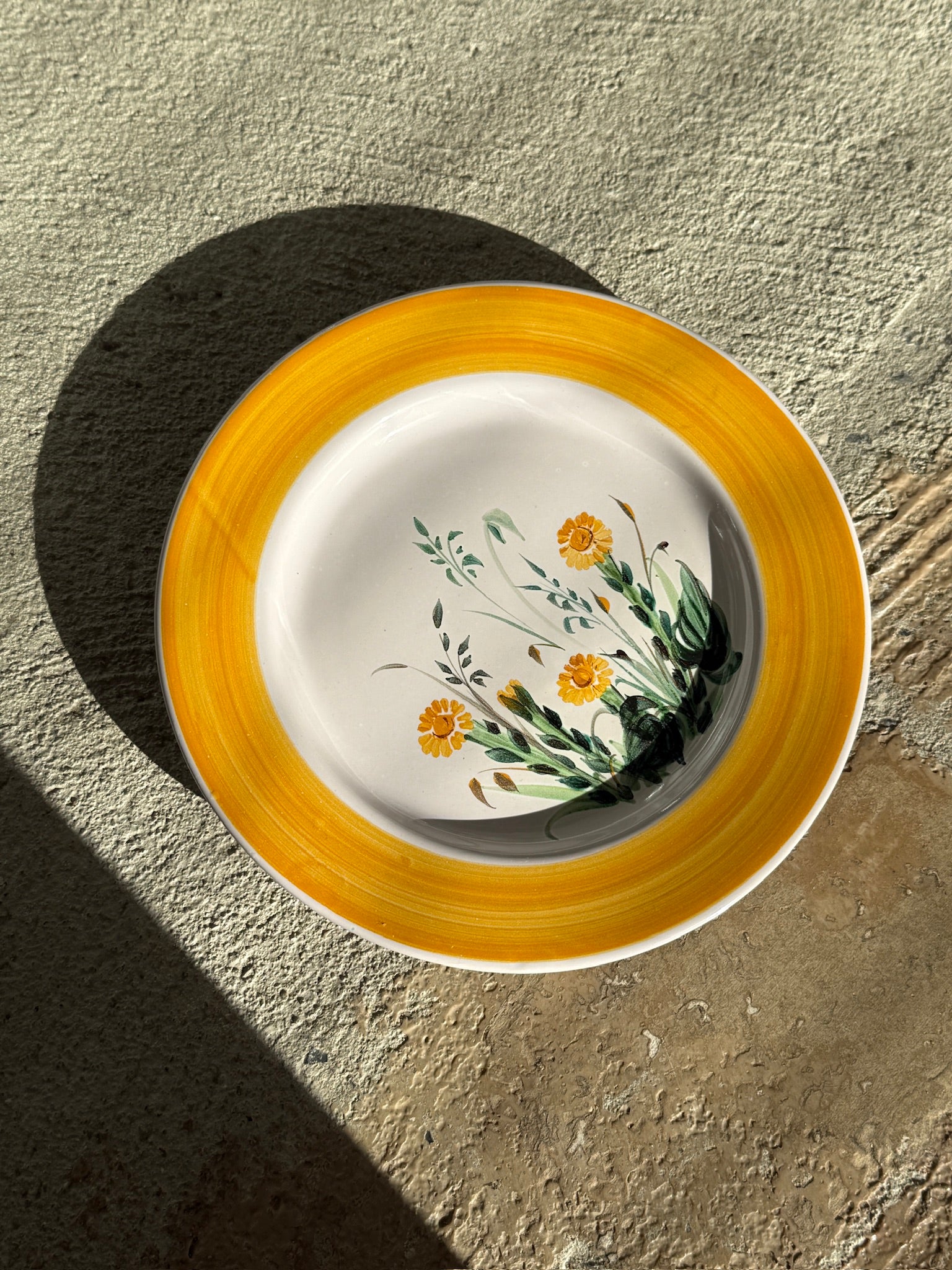 Dekorativt vintage vægophæng i keramik. Tallerkenen er håndmalet med et gult bånd langs kanten og et smukt motiv af gule blomster og grønne blade i midten. Farverne giver et varmt og sommerligt udtryk, der passer perfekt i et køkken, sommerhus eller som en del af en tallerkenvæg.