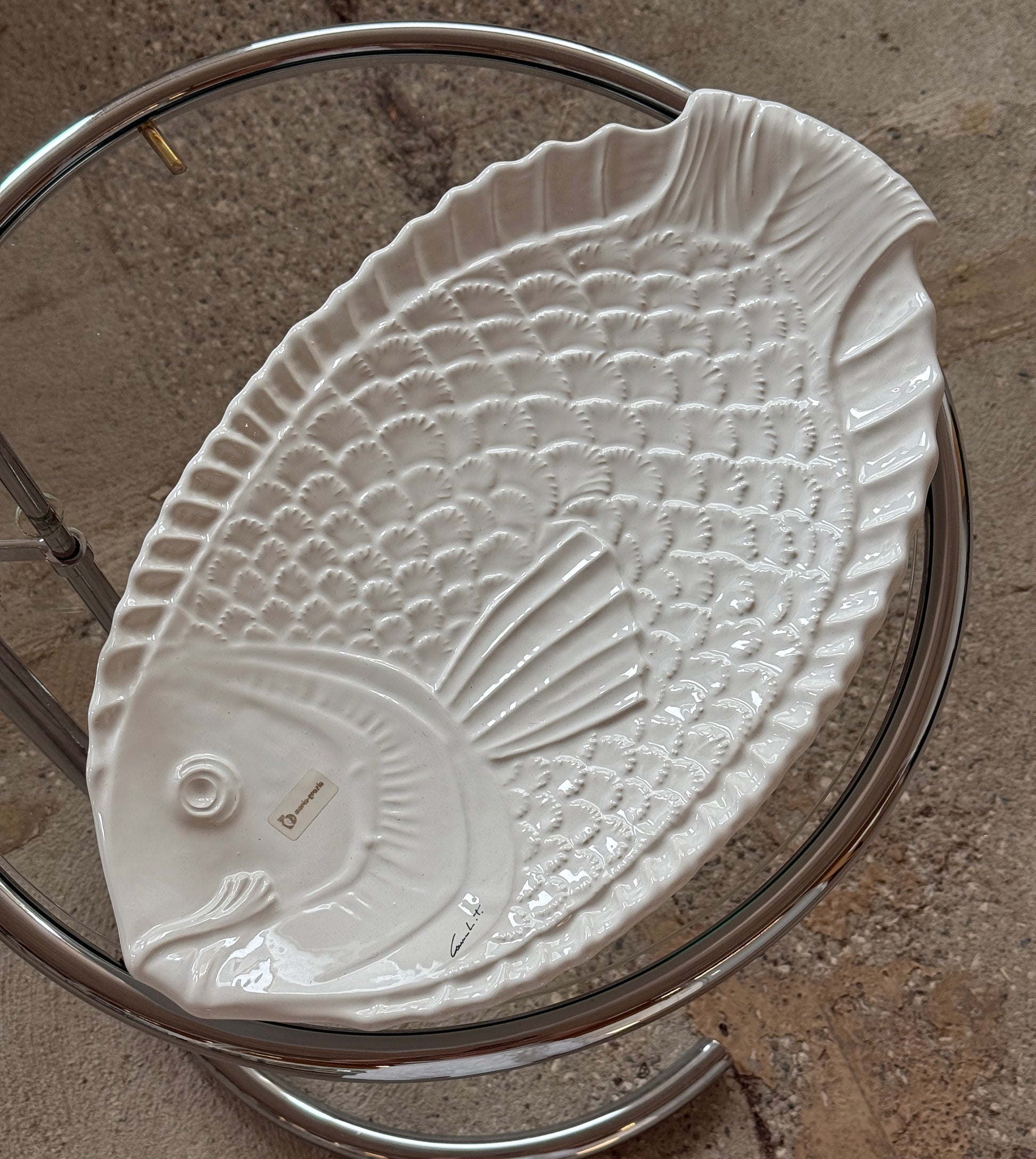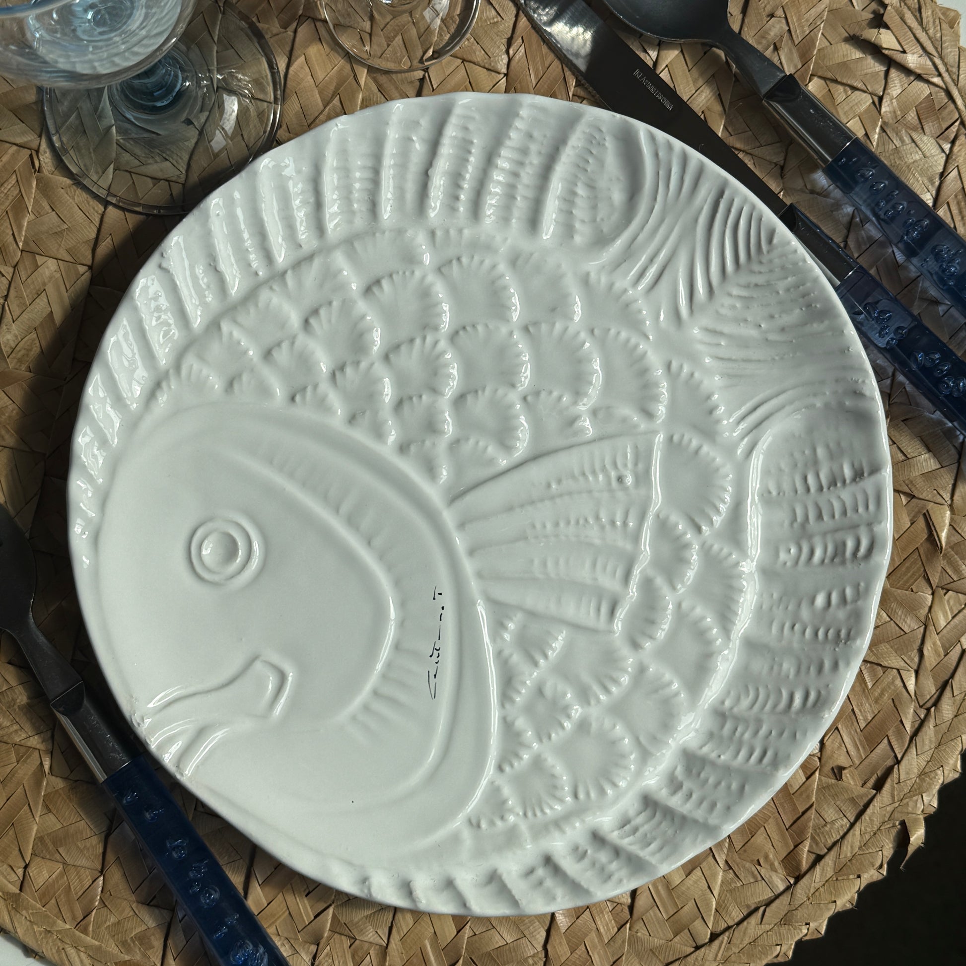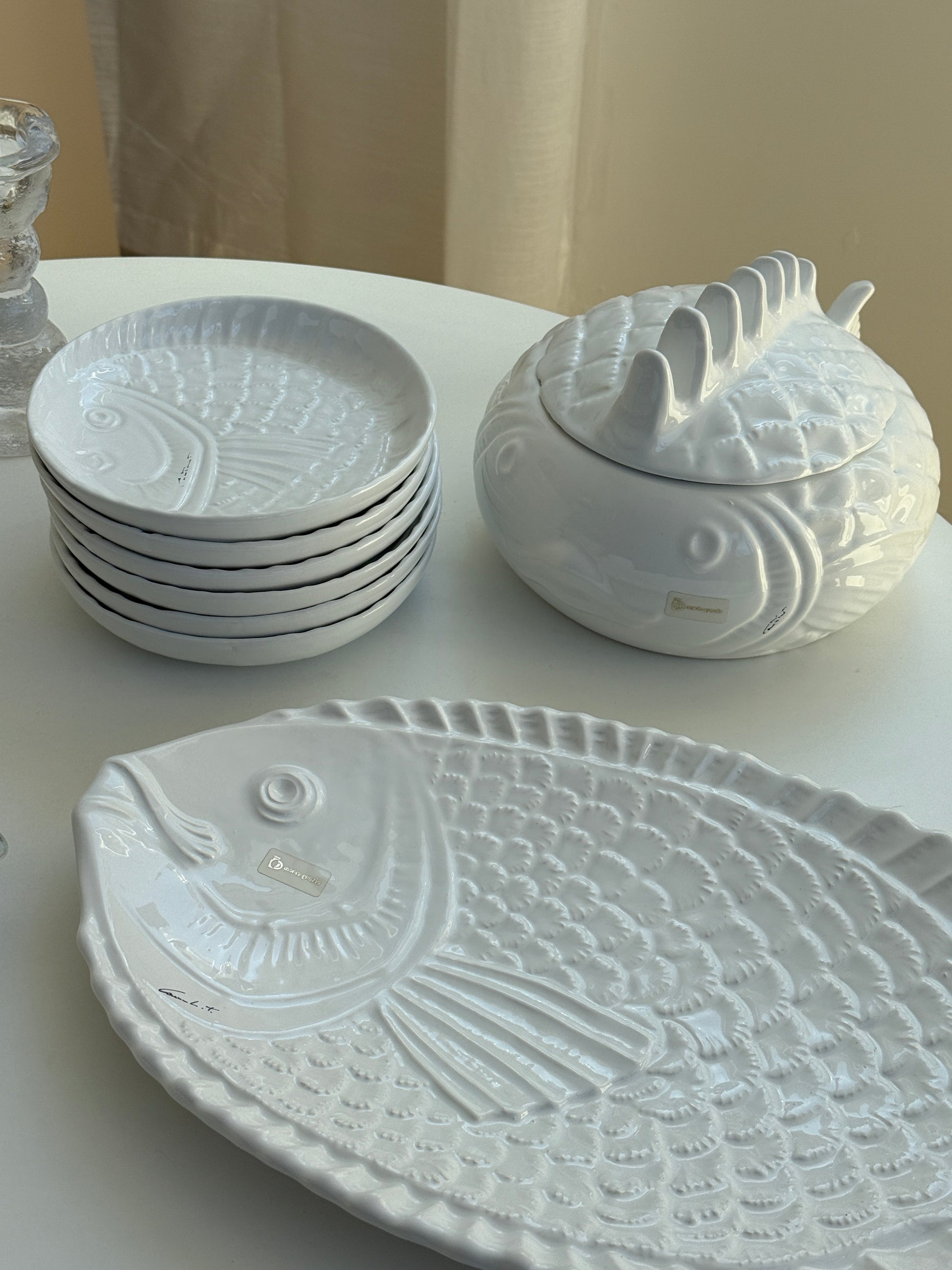 Smukt og dekorativt keramikstel fra Maria Grazia, Italien, i klassisk hvid med relief af fiskemotiv. Et charmerende stel med karakter, perfekt til dig, der elsker italiensk keramik med humor og sjæl.