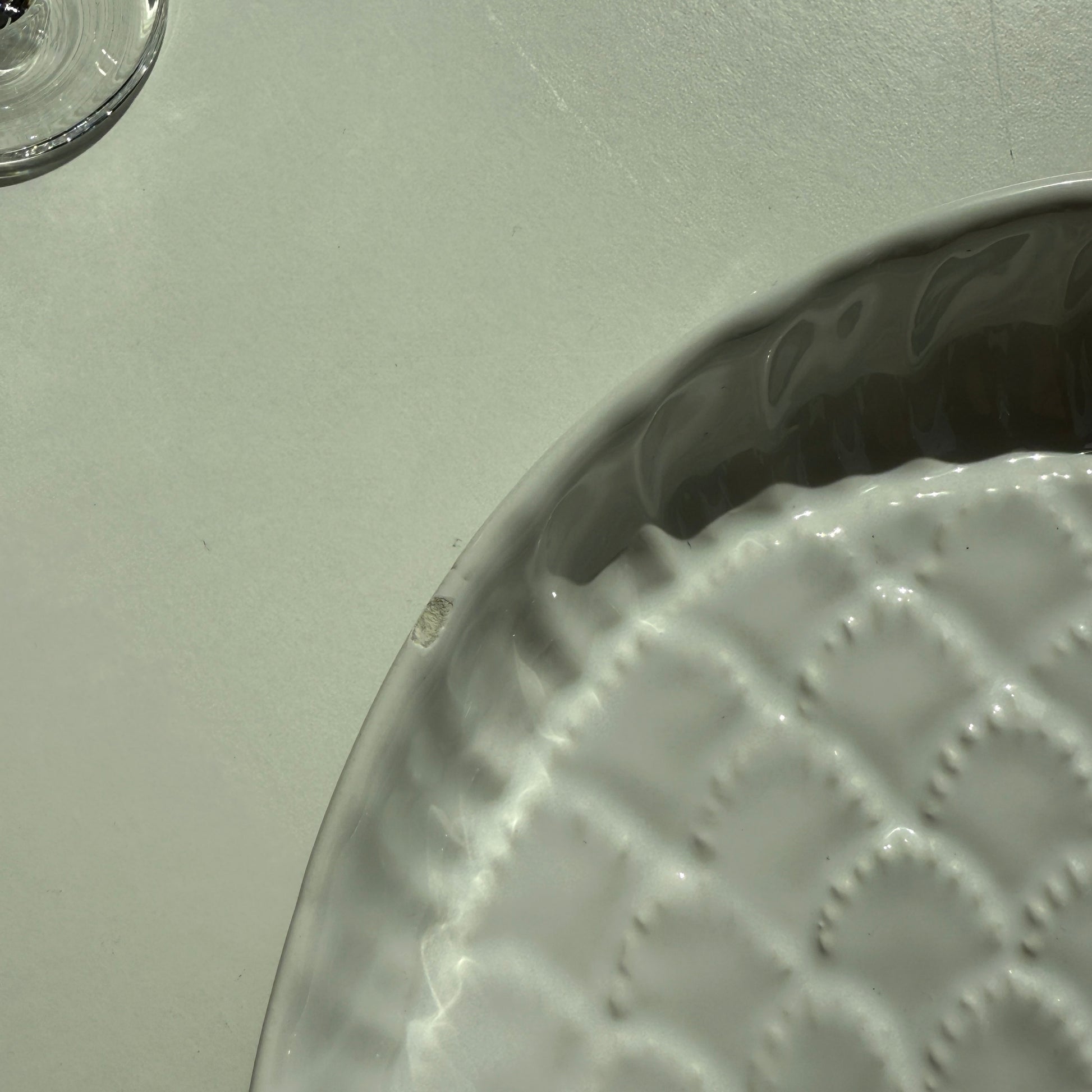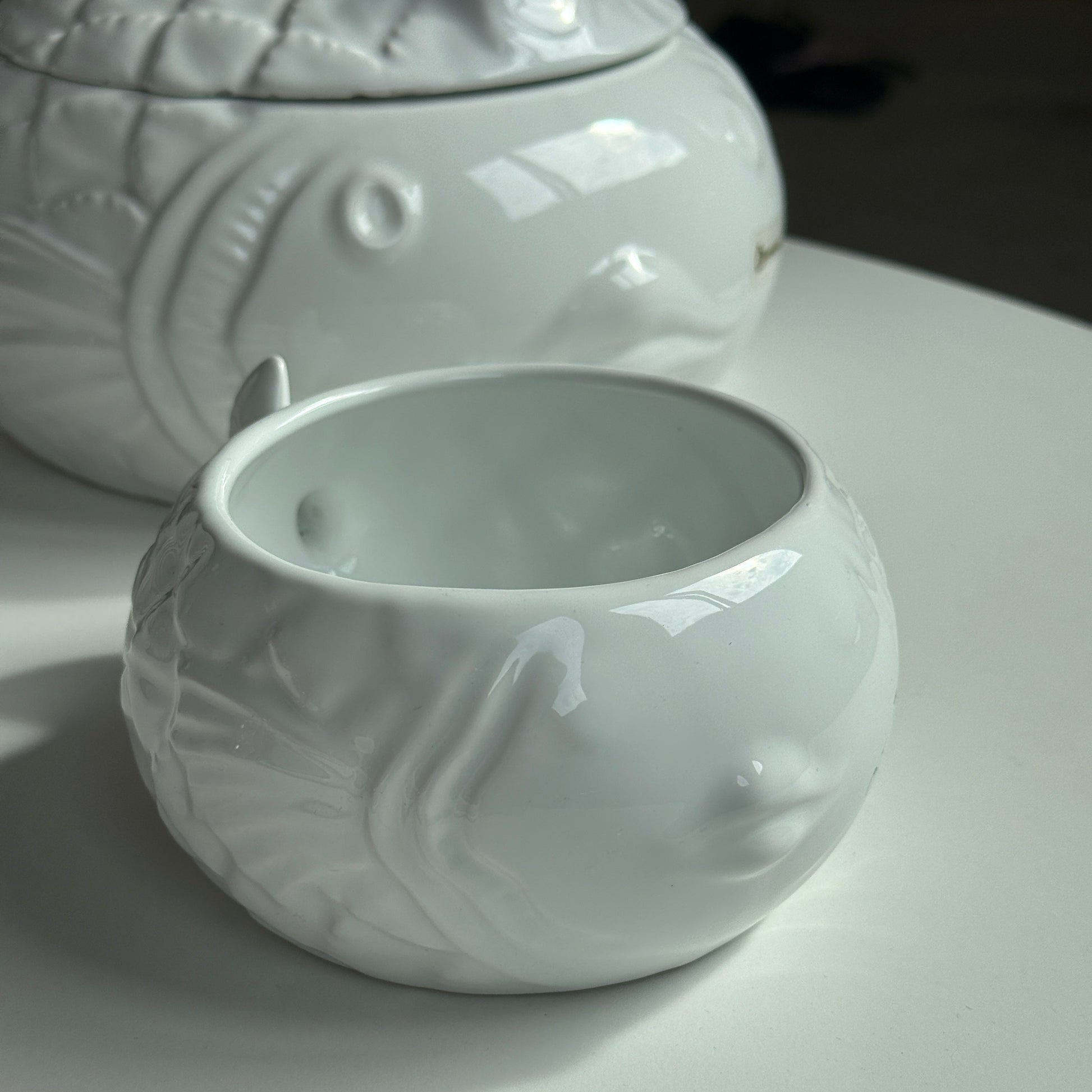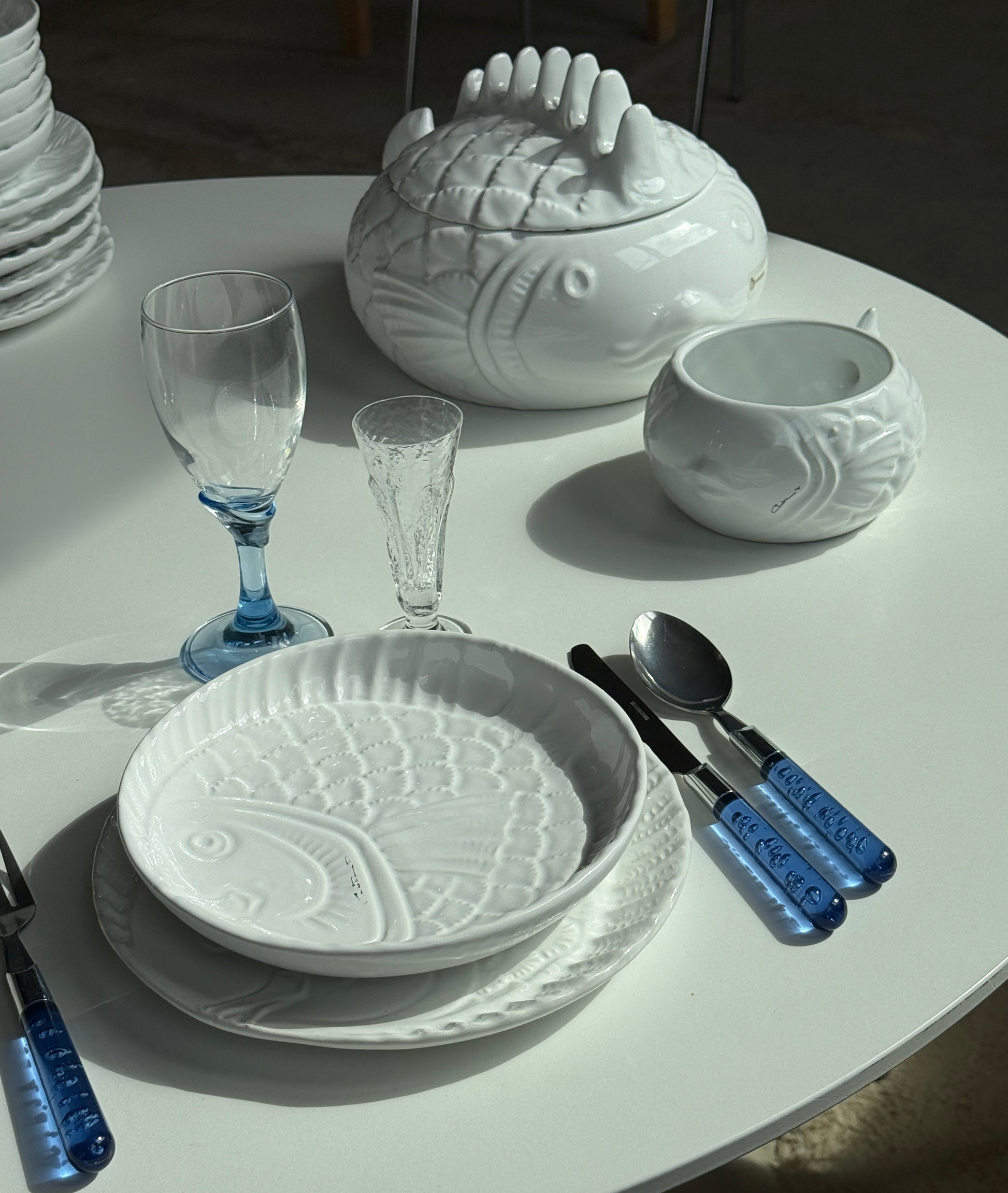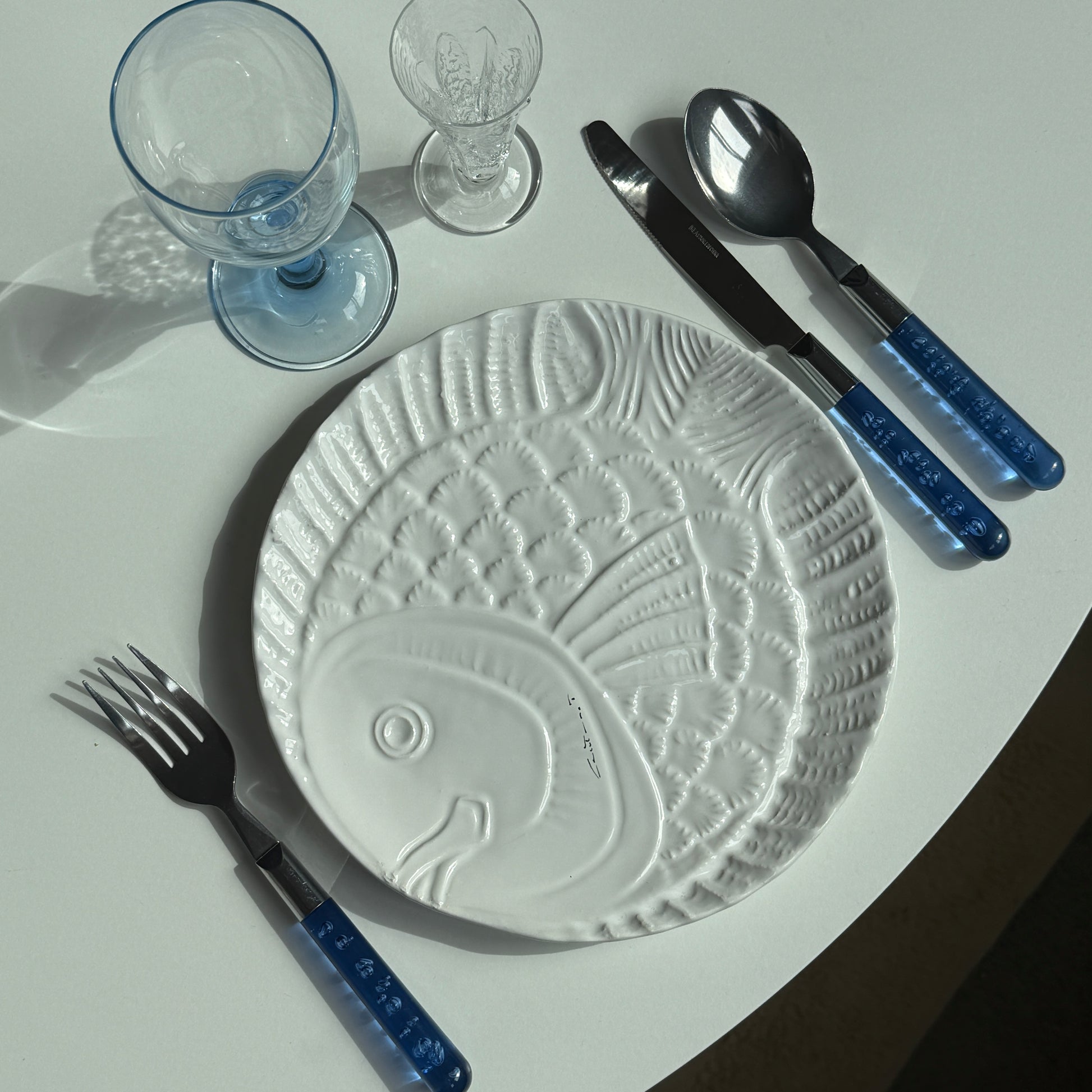 Smukt og dekorativt keramikstel fra Maria Grazia, Italien, i klassisk hvid med relief af fiskemotiv. Et charmerende stel med karakter, perfekt til dig, der elsker italiensk keramik med humor og sjæl.