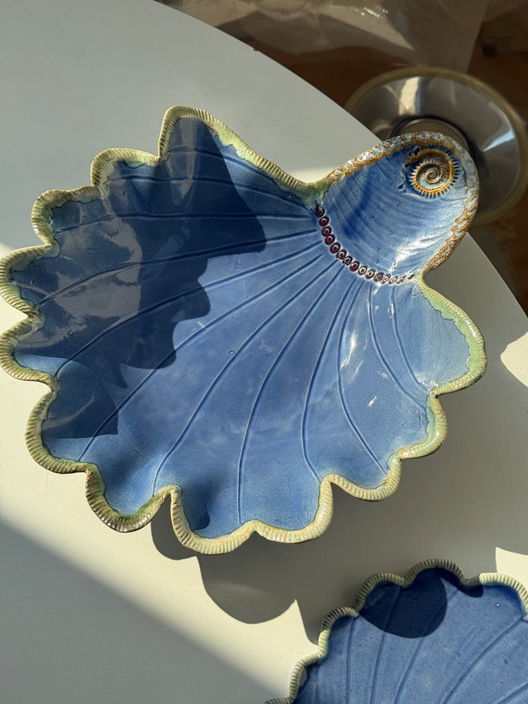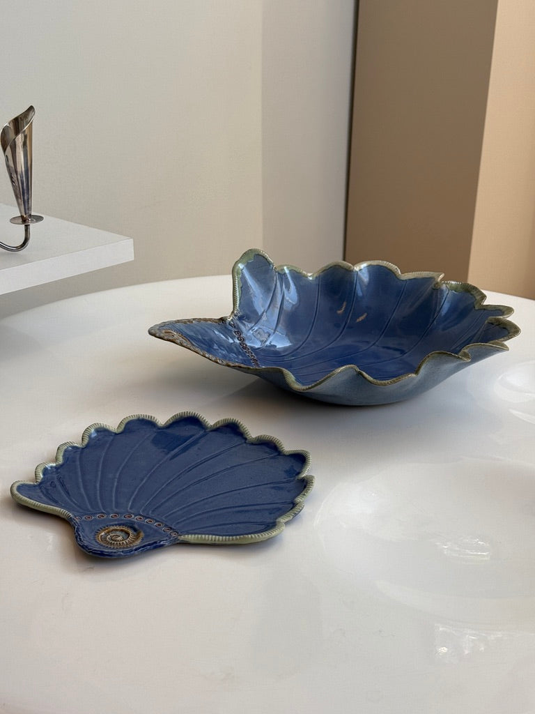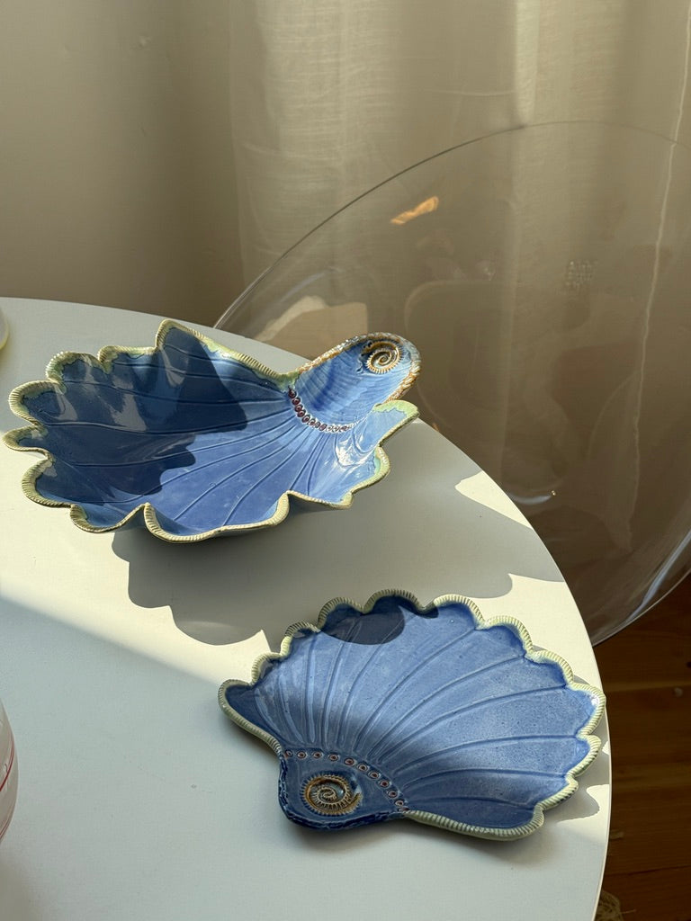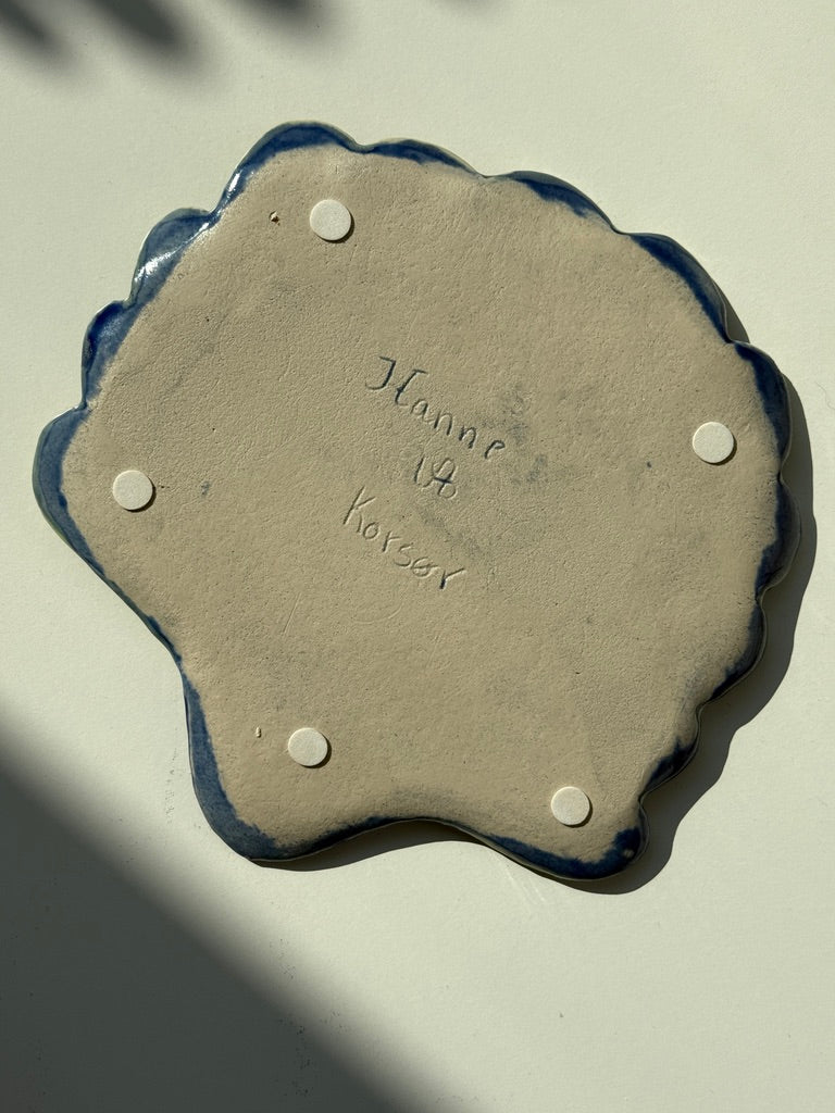 En Hanne fra Korsør har skabt dette smukke fad og tilhørende skål – og jeg kunne simpelthen ikke lade dem stå. Farverne, formerne og hele stemningen sender mig direkte til havet. Nu mangler de bare et nyt hjem!