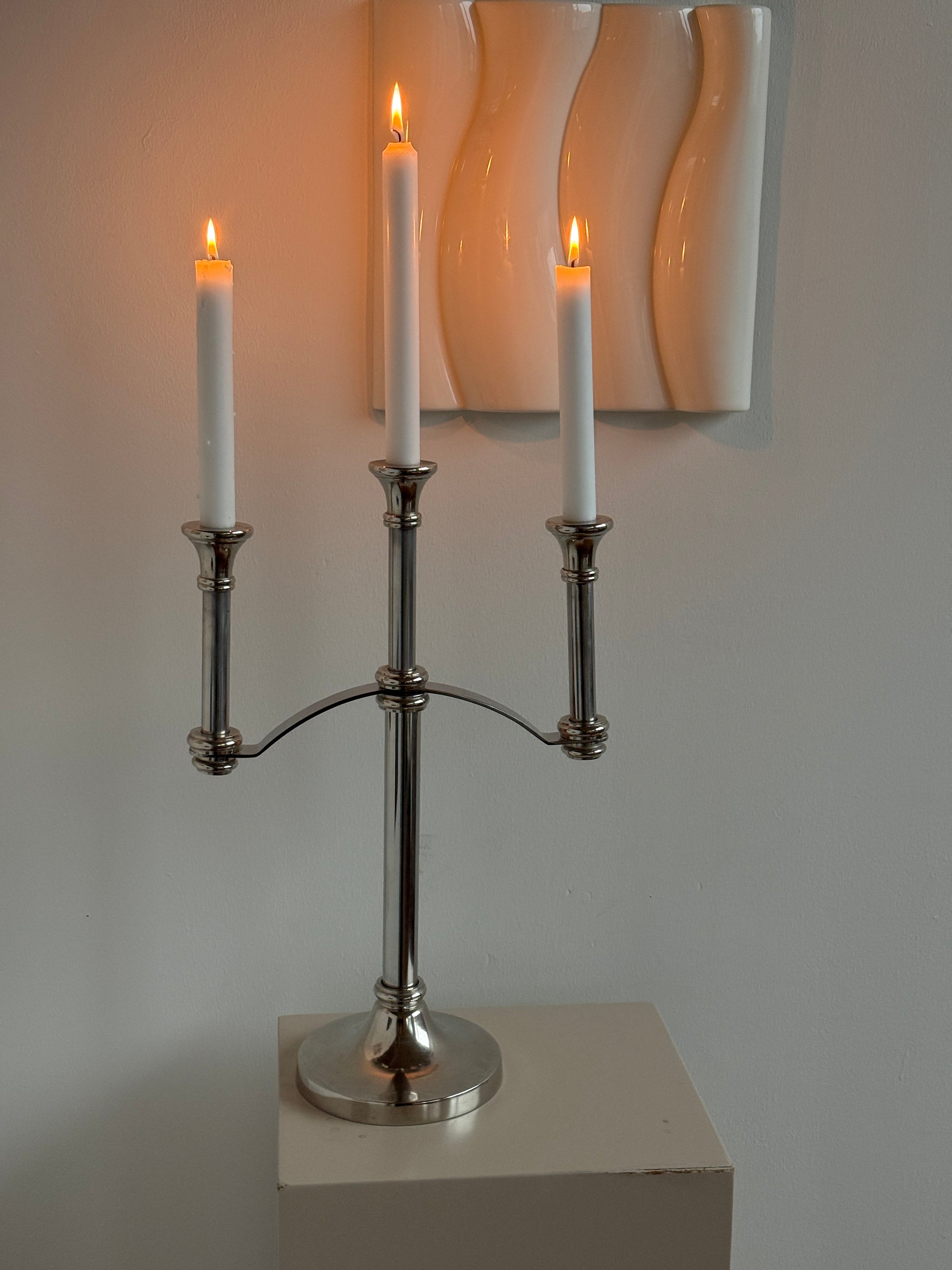 Solid og robust trearmet lysestage i metal med et klassisk, tidløst udtryk. Stagen har en smuk, balanceret form med fine detaljer omkring arme og fod, der giver et elegant og harmonisk helhedsindtryk. Den tunge konstruktion gør den stabil og velegnet til både hverdagsbrug og festlige lejligheder.
