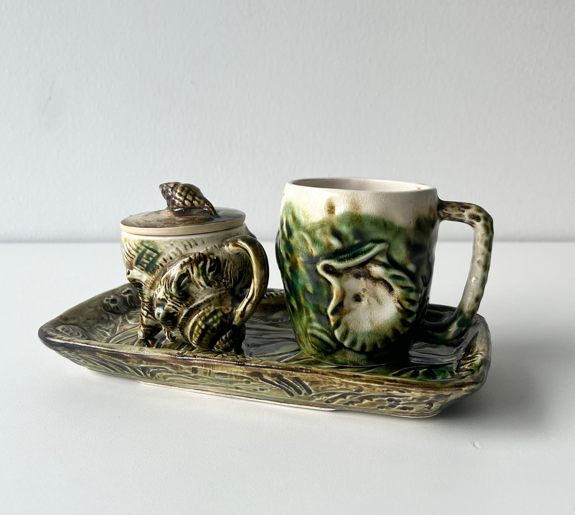 Jeg har fået fingrene i dette helt særlige vintage sæt fra Frankrig, fra 1950’erne. Konkylieformet tekander, sukkerskåle, mælkekander, lang konkylieskål og et lille sæt med fad, kop og skål. Prisen varierer efter størrelse.