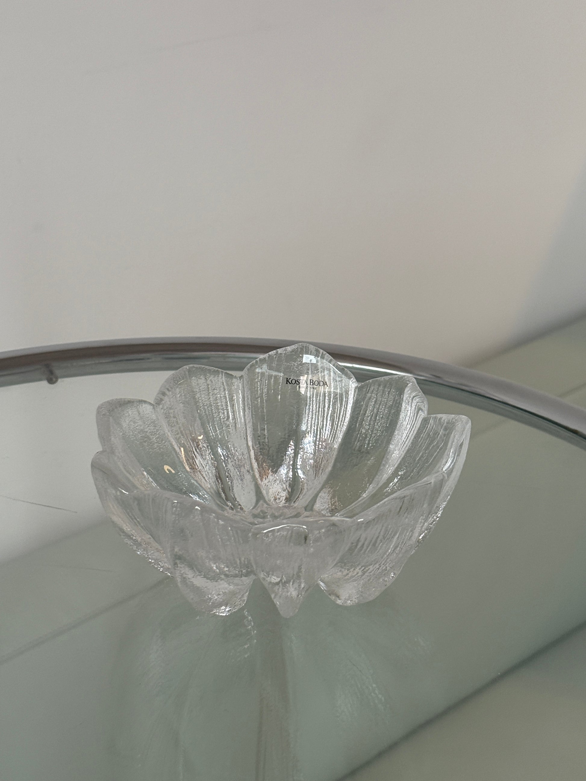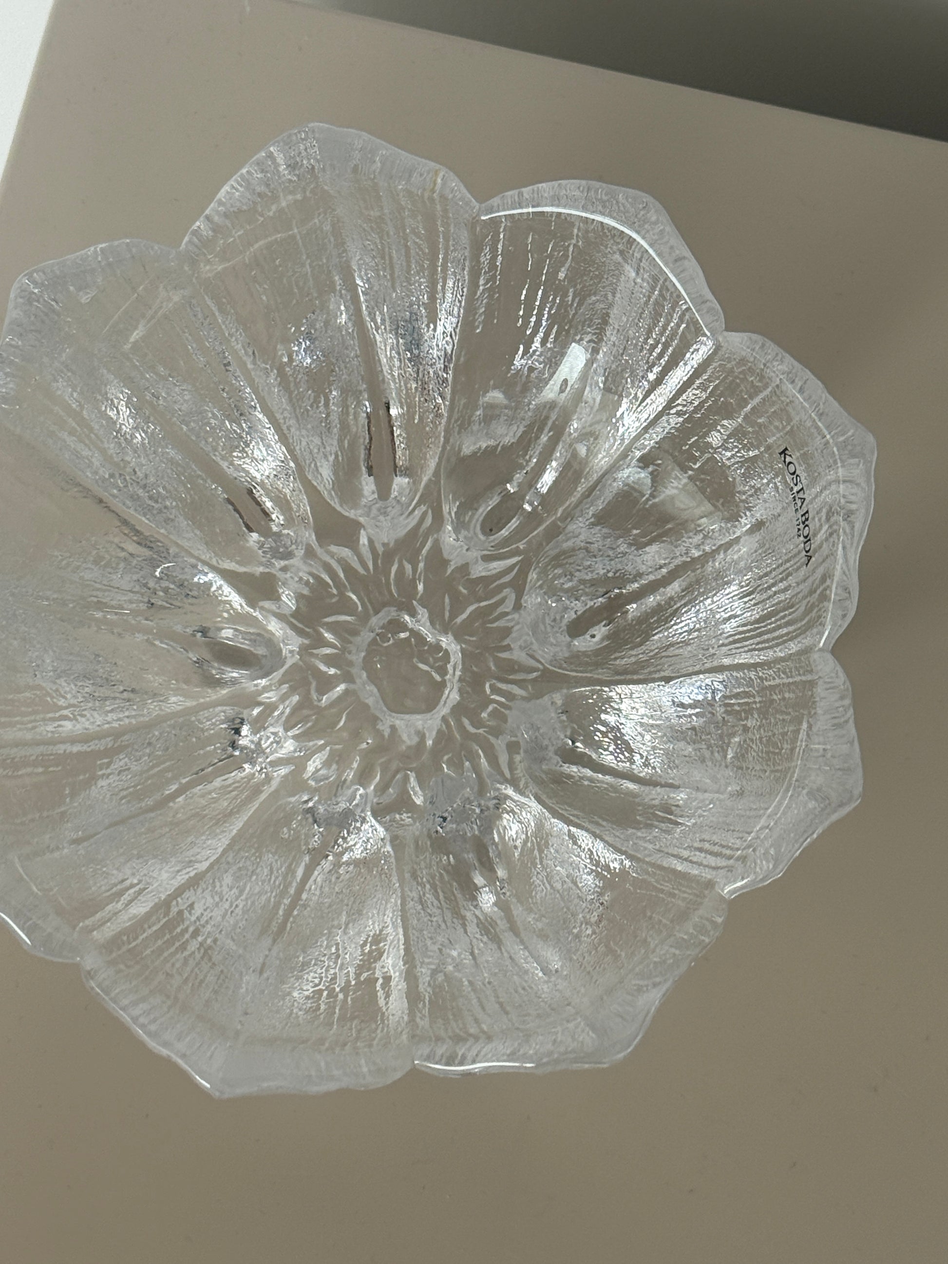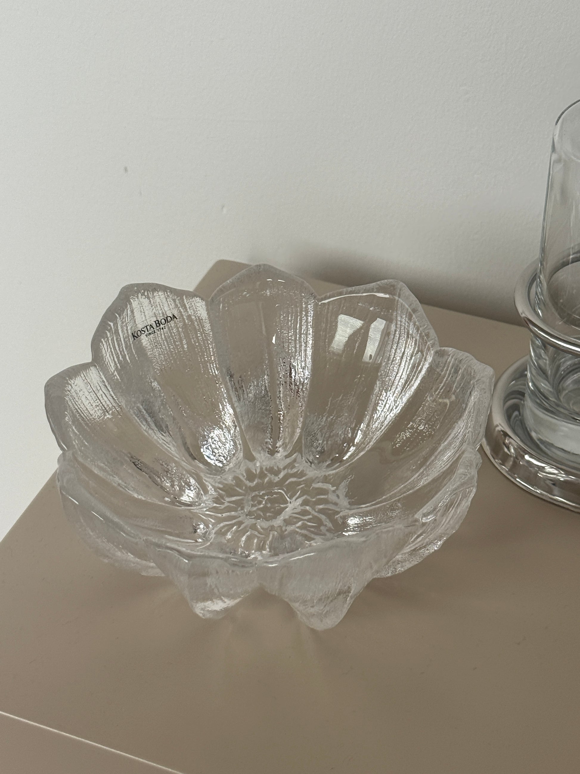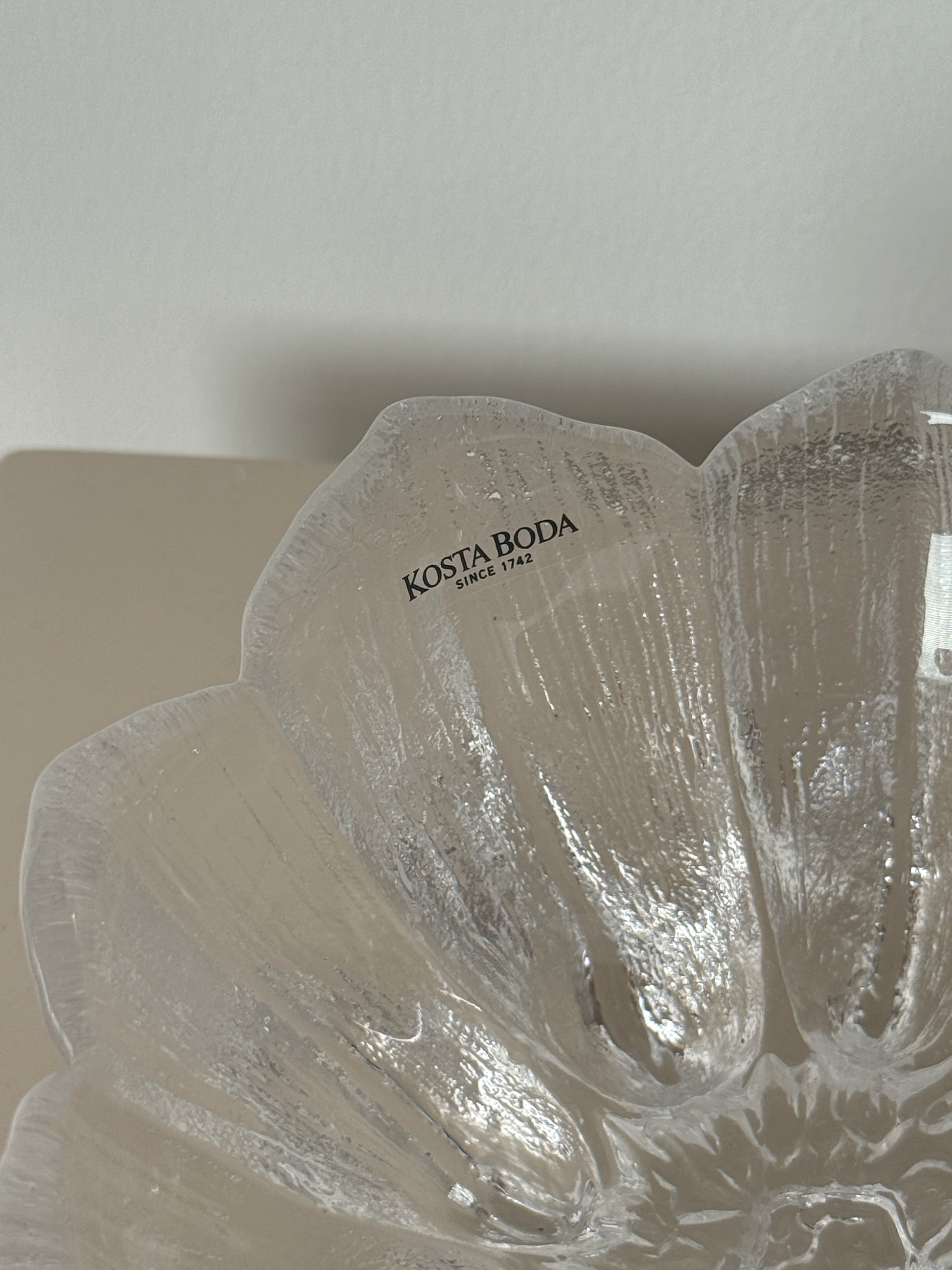 Glaskunst fra svenske Kosta Boda kaldet 'Anemone'. Skål i form af en blomsterknop med struktur i glasset, som giver et flot spil i lyset. Designet i klart glas med et skulpturelt udtryk.