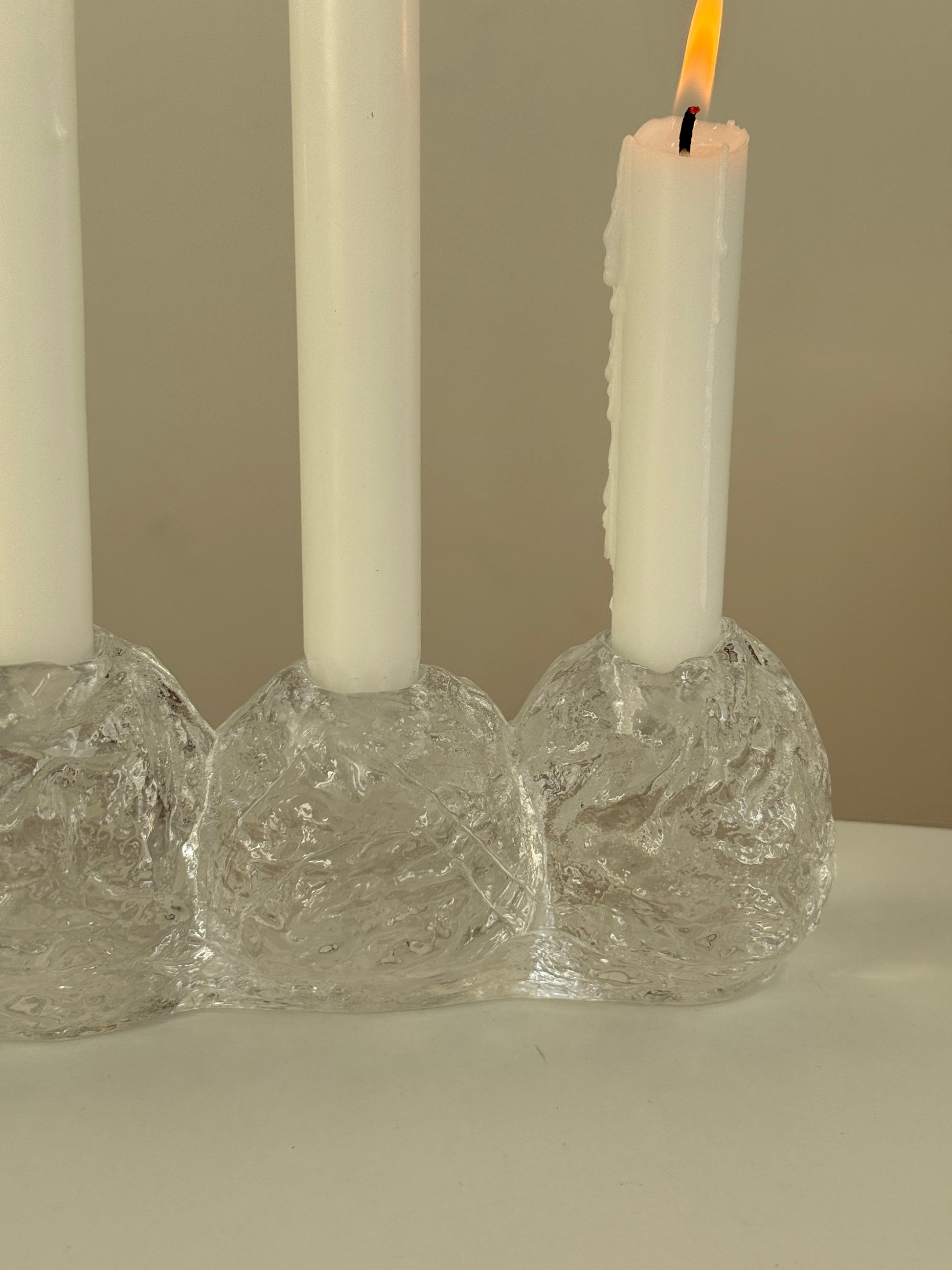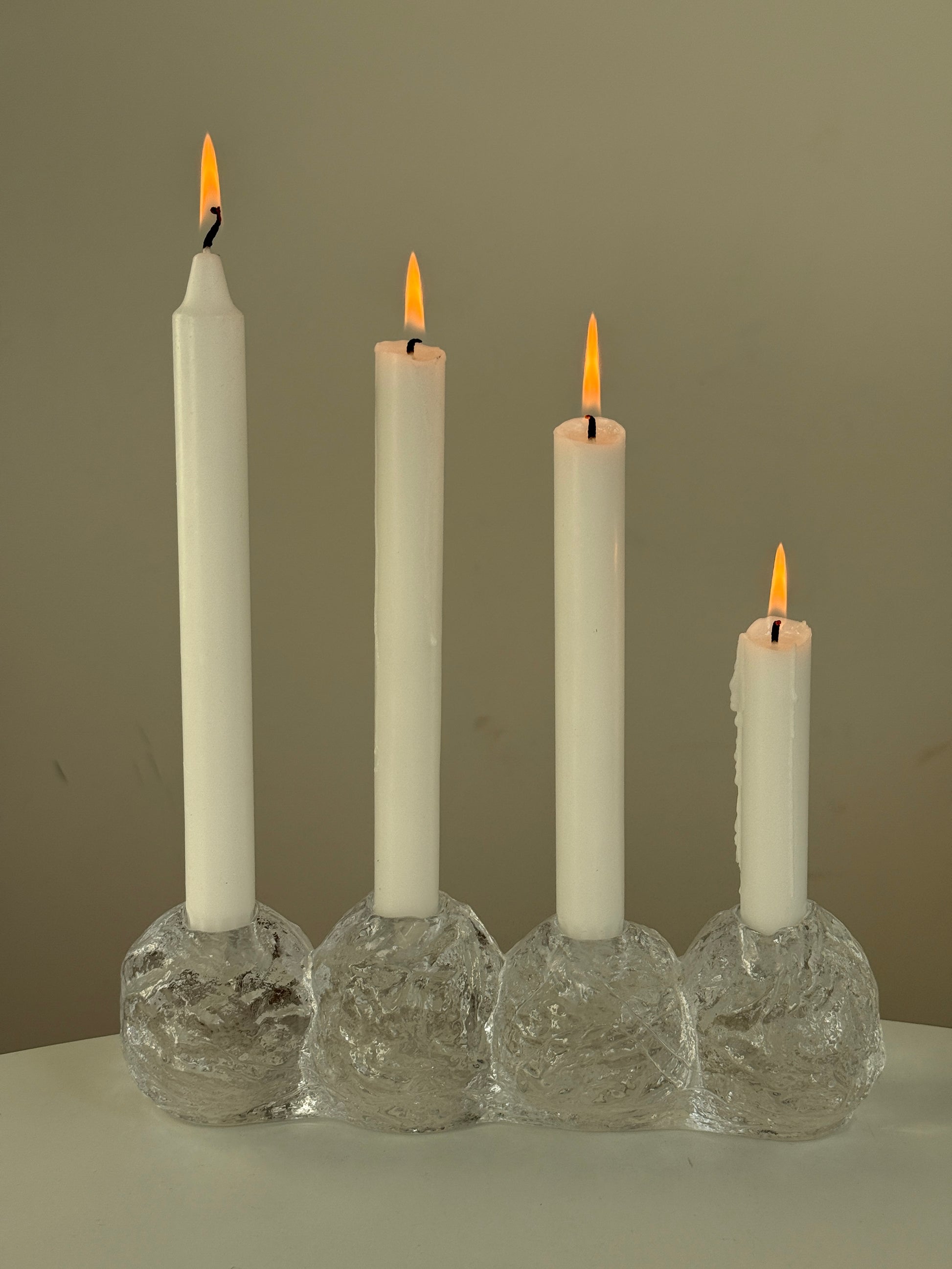 Sjælden og eftertragtet adventslysestage fra Kosta Boda, udført i presset glas med det ikoniske Snowball-design. Stagen består af fire sammenhængende kugler, der hver holder et kronelys – perfekt til brug som adventsstage i december, men også dekorativ hele året rundt.
